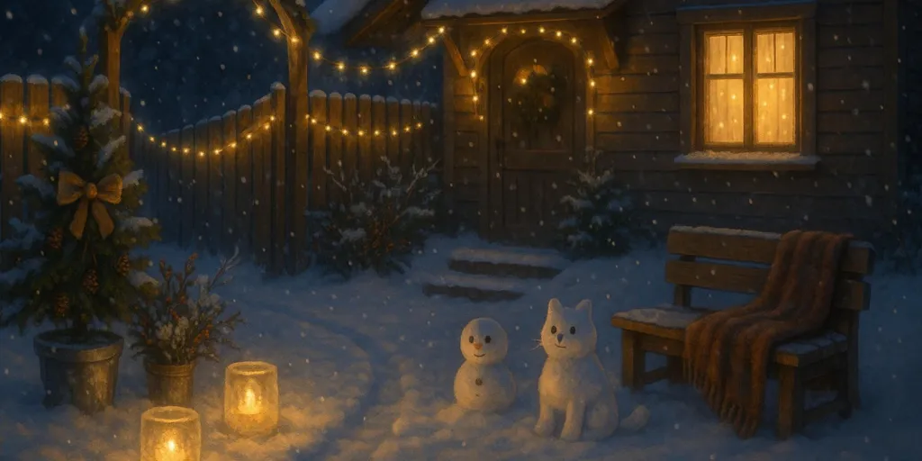 Создать праздничную атмосферу легко и недорого: свет, зелень и немного фантазии — и двор превращается в зимнюю сказку.