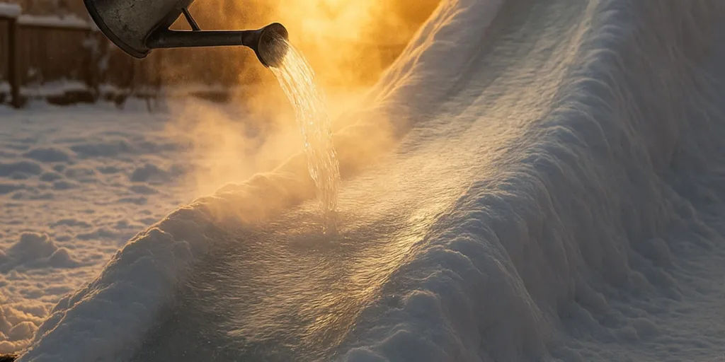 - Использовать кипяток — разрушает структуру снега и портит дерево.- Заливать толстым слоем — середина не промерзает.