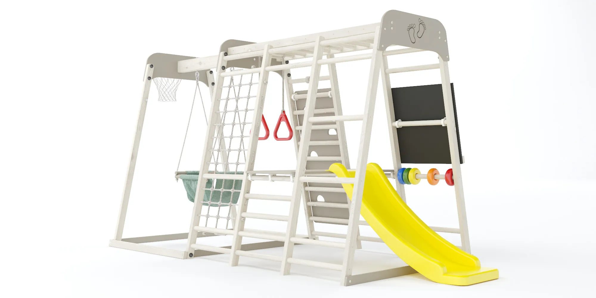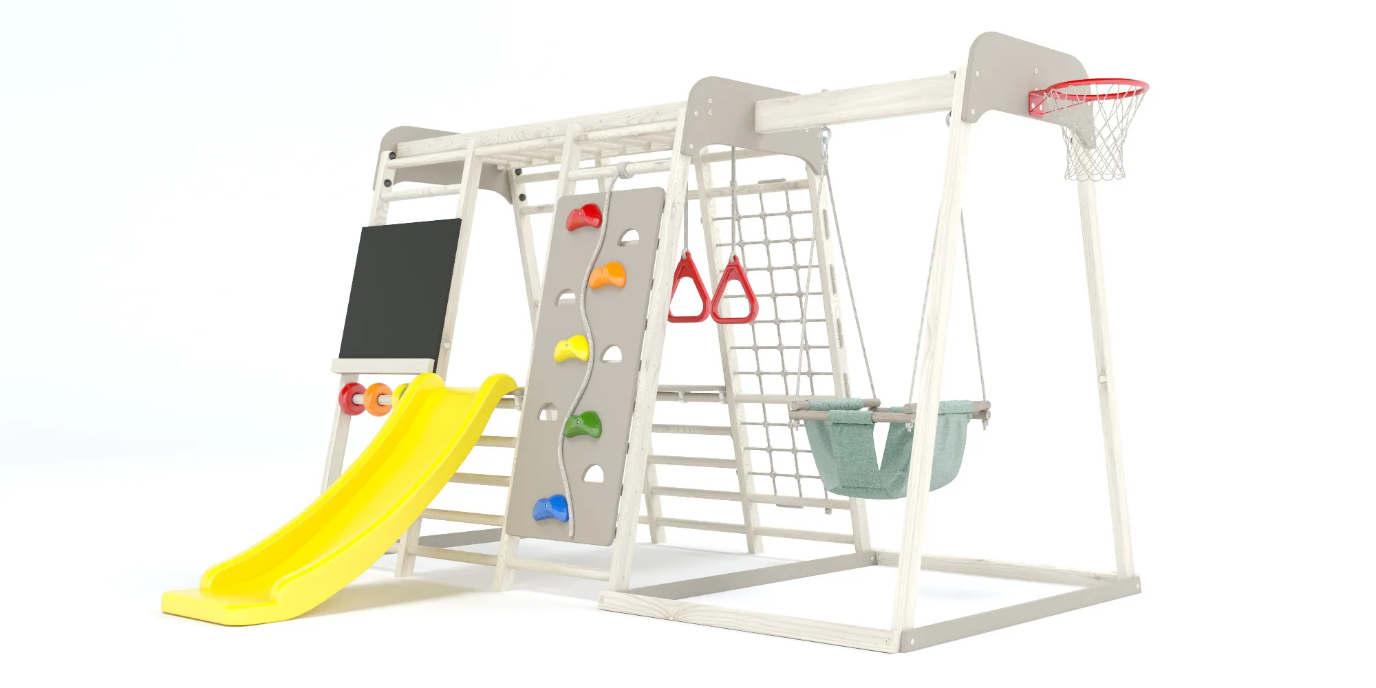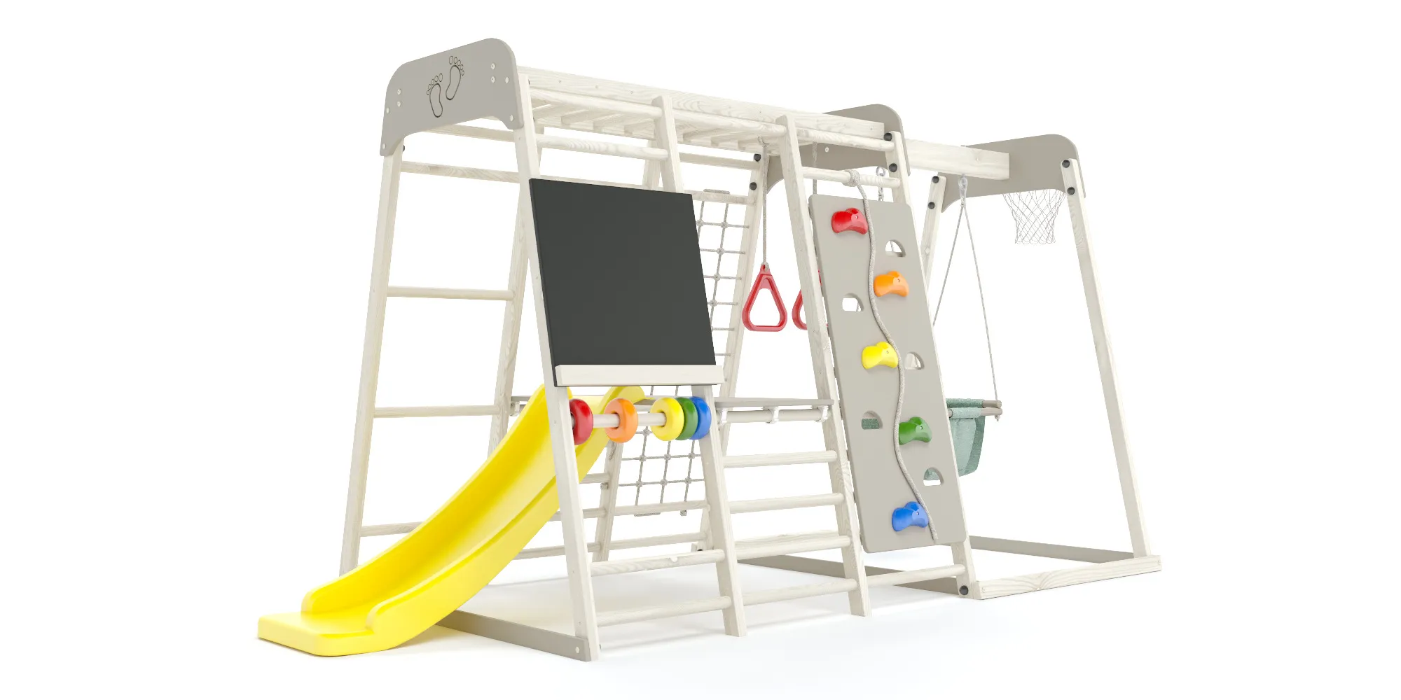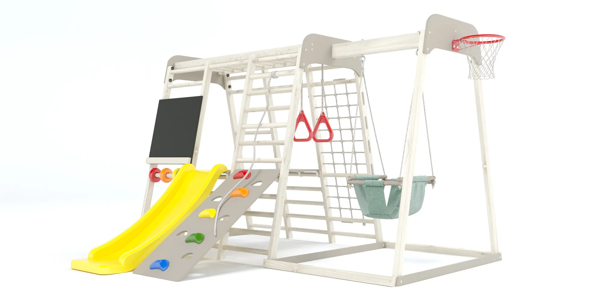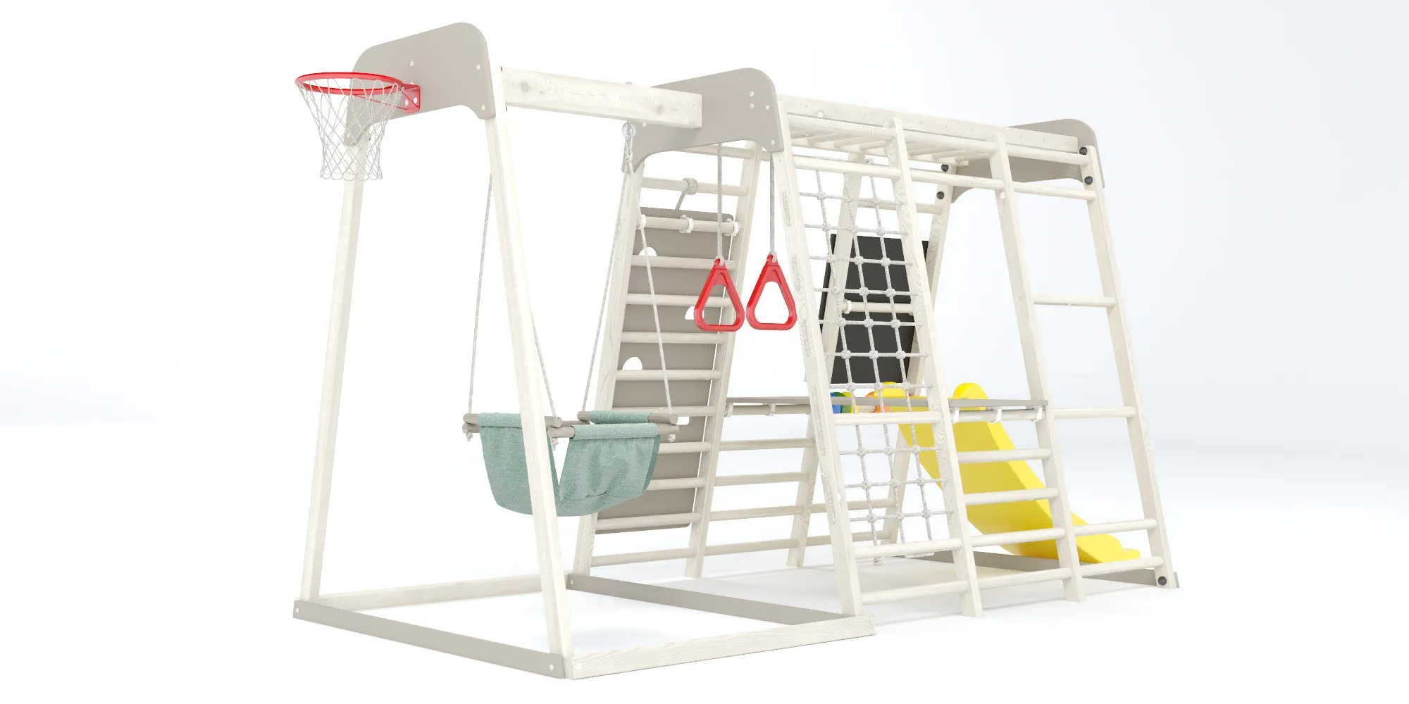 Основа игрового комплекса прочный деревянный каркас, сделанный из сосны (сечение 30 х 50 мм). Это экологичный, безопасный материал. Цвет и тип покрытия зависит от пожеланий клиента.Модели серии занимают небольшую площадь.