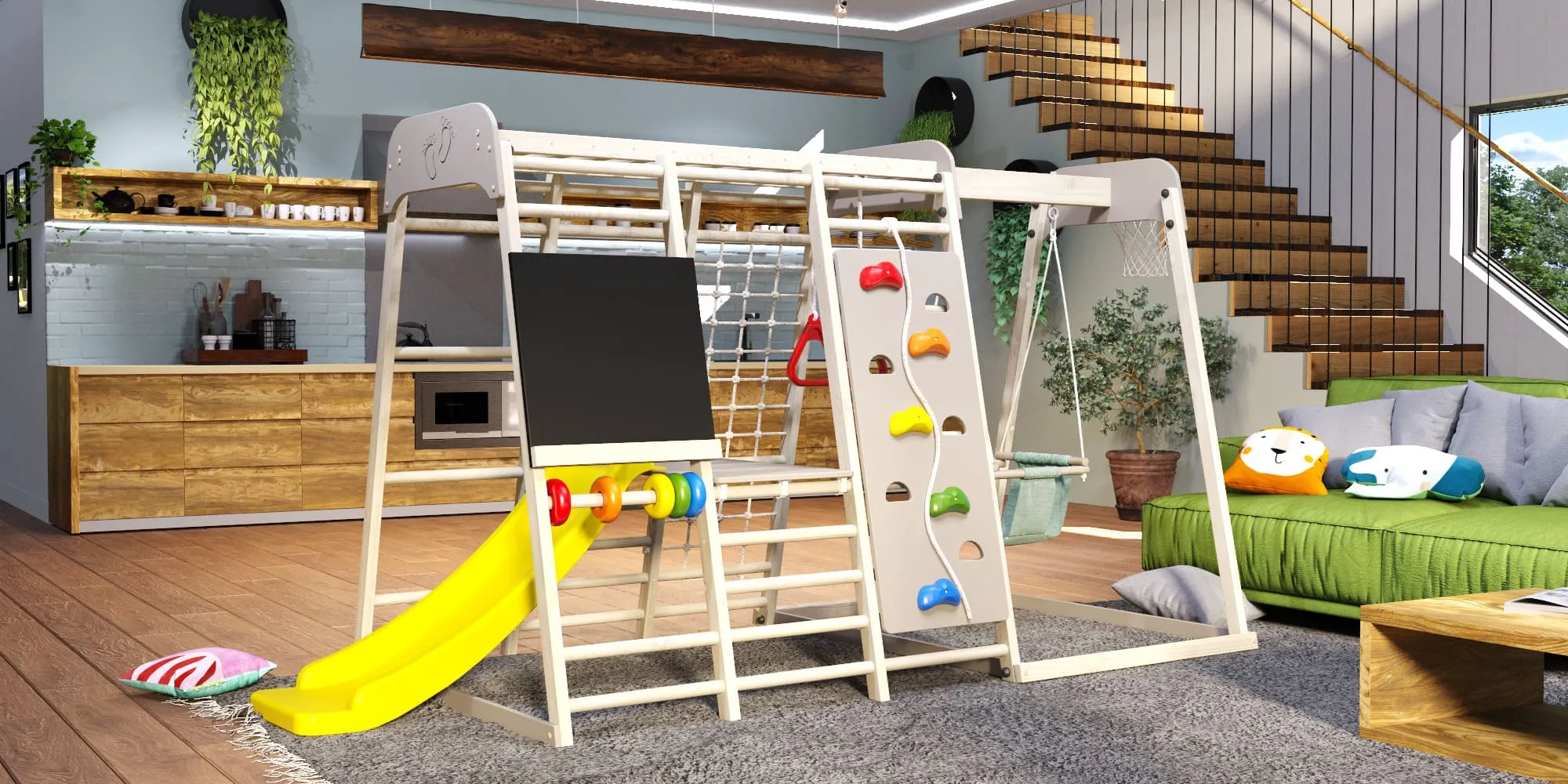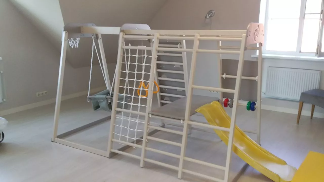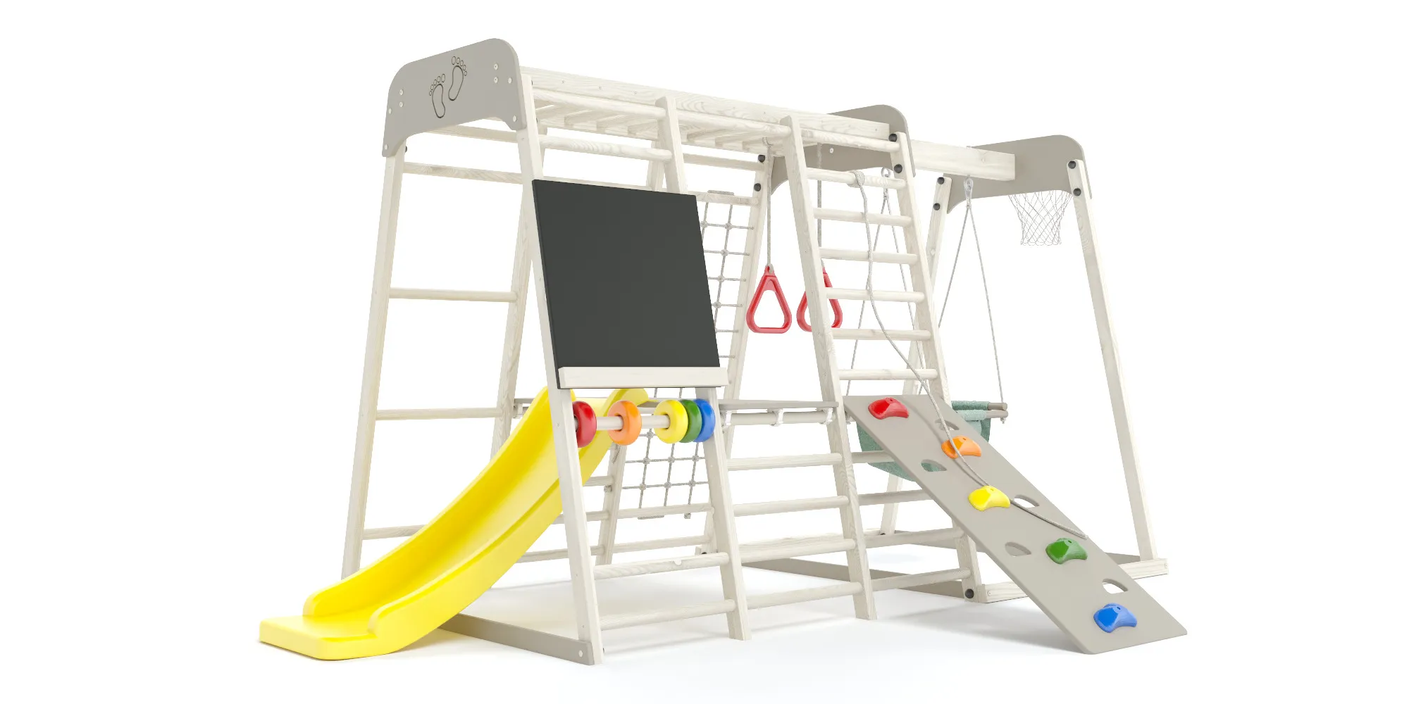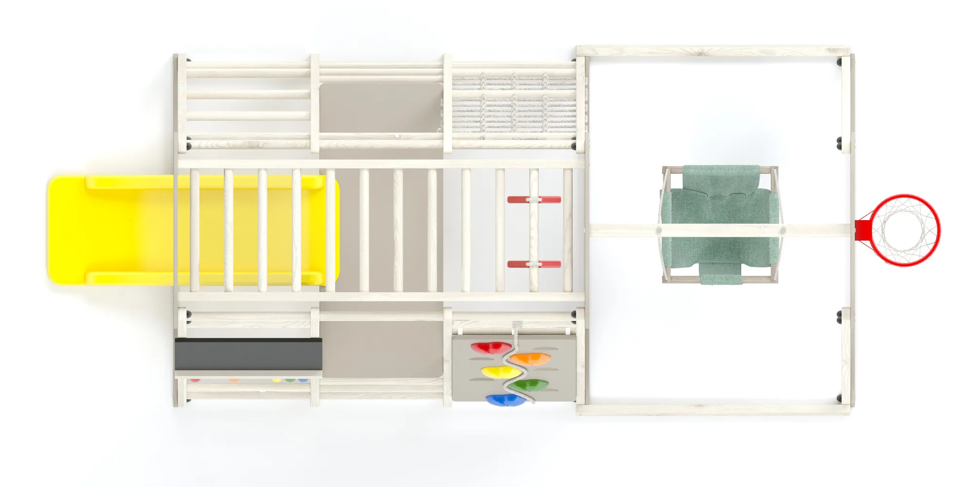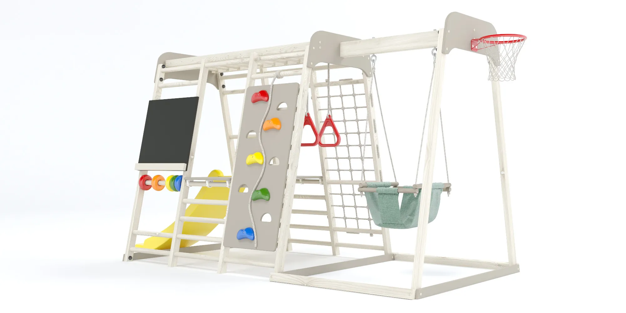 Основа игрового комплекса прочный деревянный каркас, сделанный из сосны (сечение 30 х 50 мм). Это экологичный, безопасный материал. Цвет и тип покрытия зависит от пожеланий клиента.Модели серии занимают небольшую площадь.