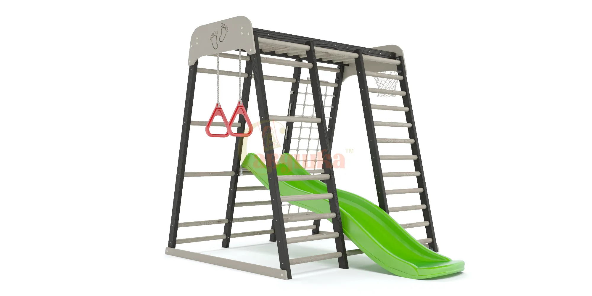 Основа игрового комплекса прочный деревянный каркас, сделанный из сосны (сечение 30 х 50 мм). Это экологичный, безопасный материал. Цвет и тип покрытия зависит от пожеланий клиента.