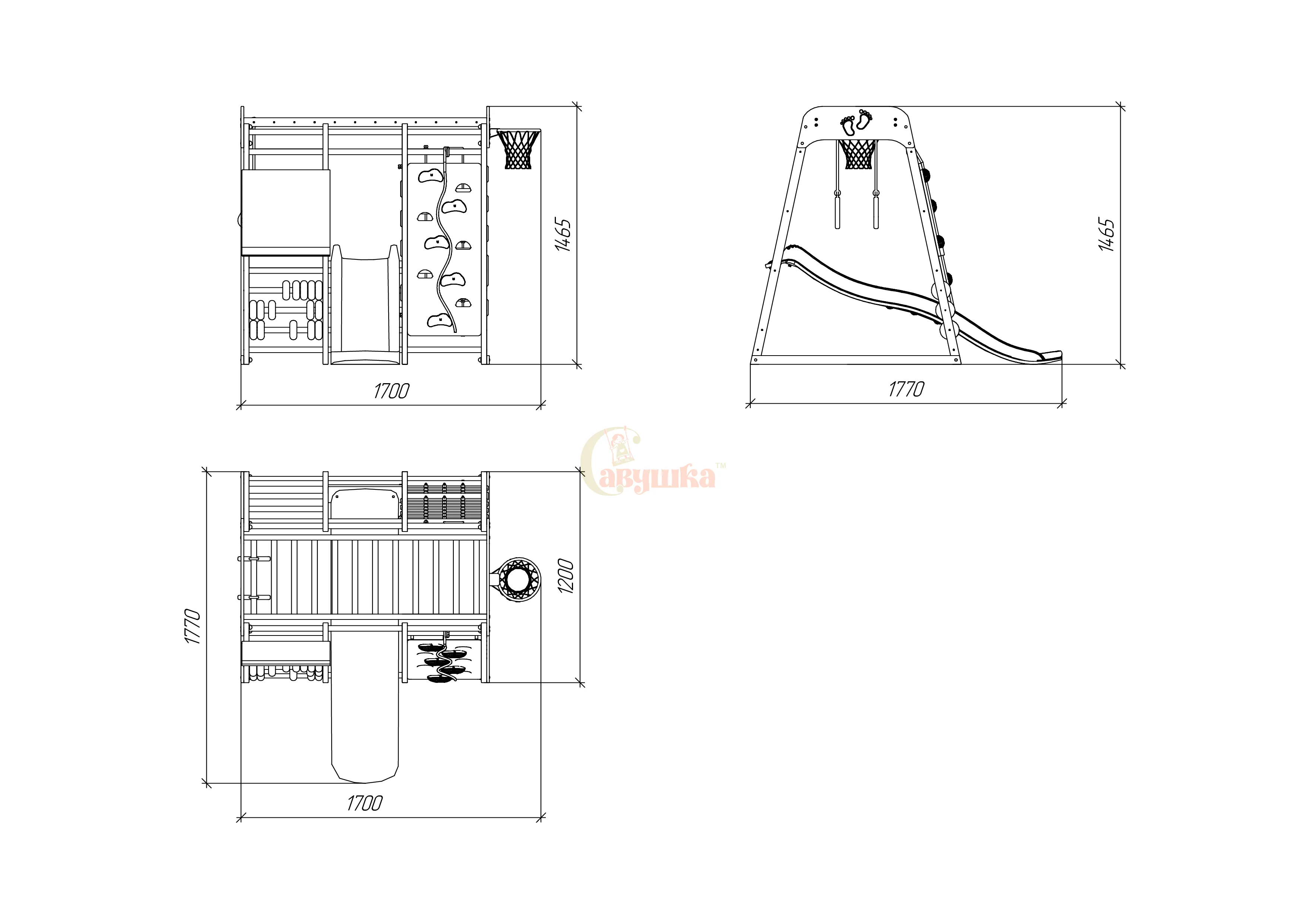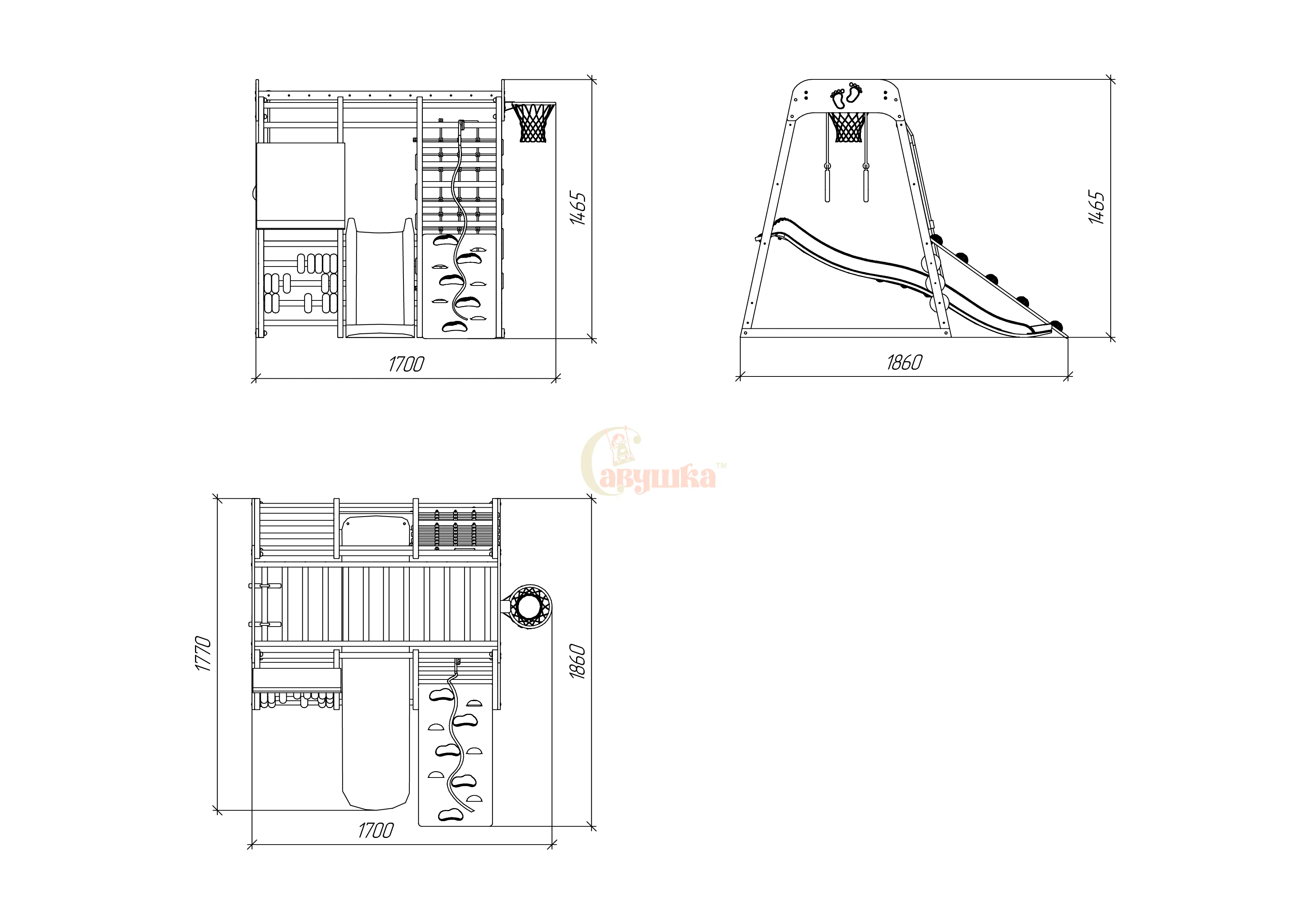 Основа игрового комплекса прочный деревянный каркас, сделанный из сосны (сечение 30 х 50 мм). Это экологичный, безопасный материал. Цвет и тип покрытия зависит от пожеланий клиента.