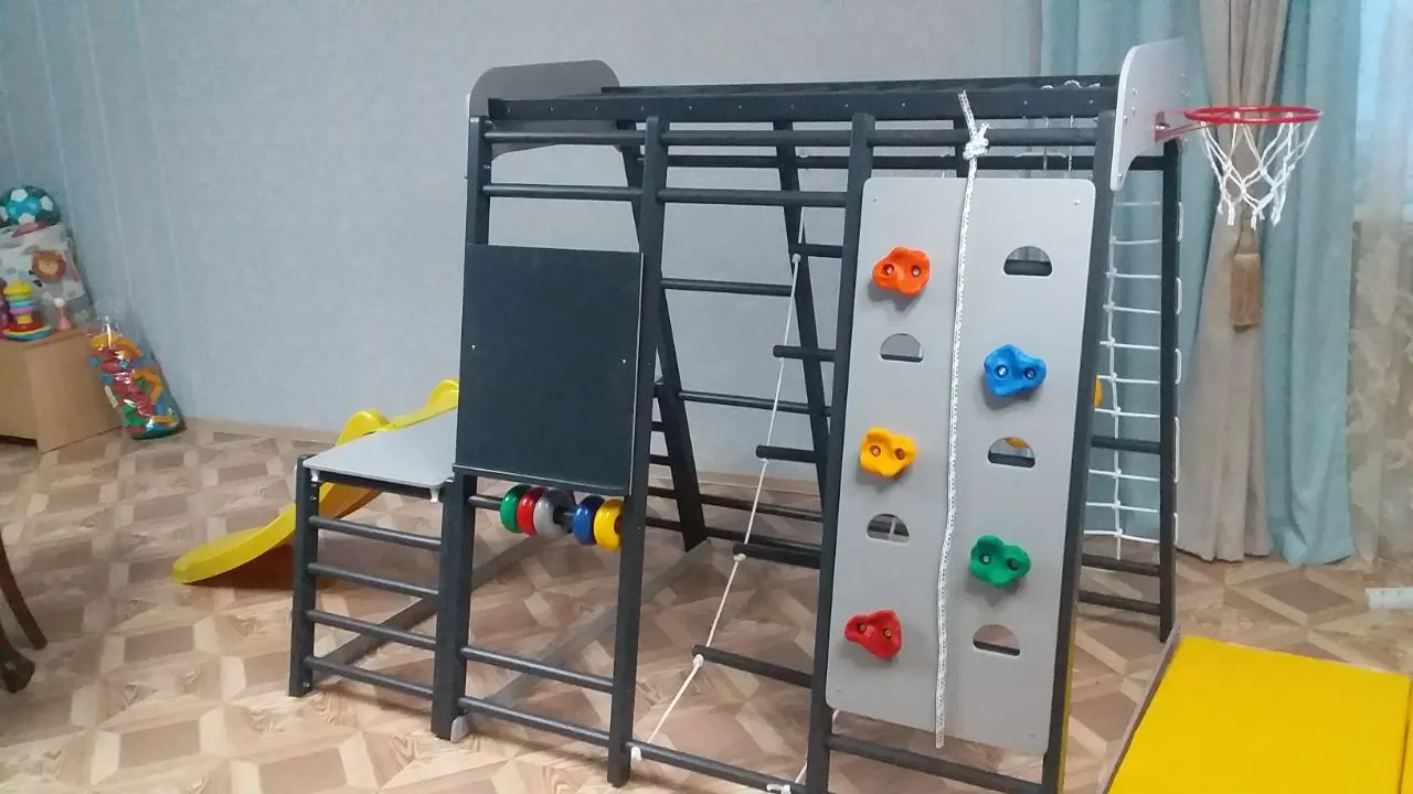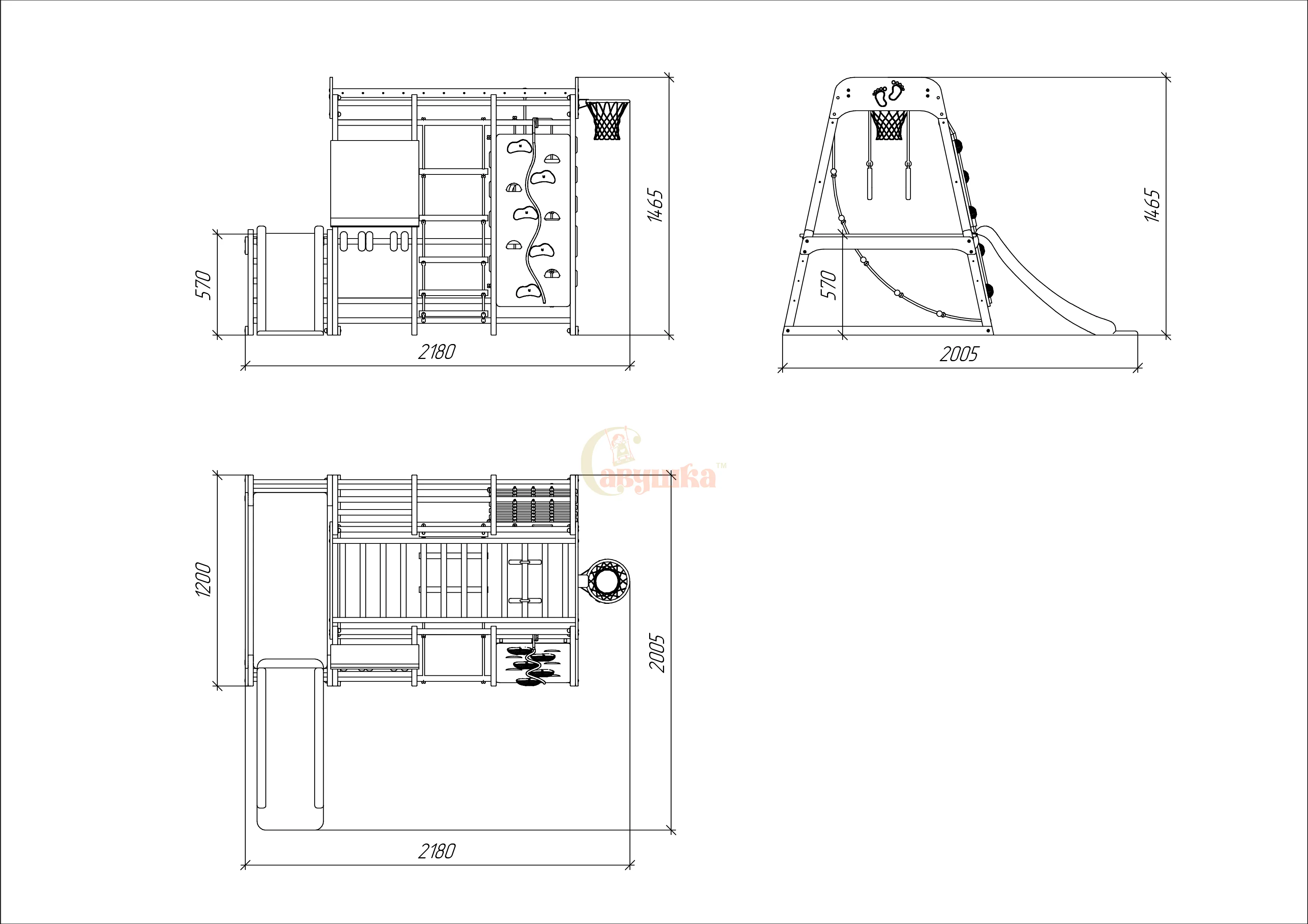 Основа игрового комплекса прочный деревянный каркас, сделанный из сосны (сечение 30 х 50 мм). Это экологичный, безопасный материал. Цвет и тип покрытия зависит от пожеланий клиента.