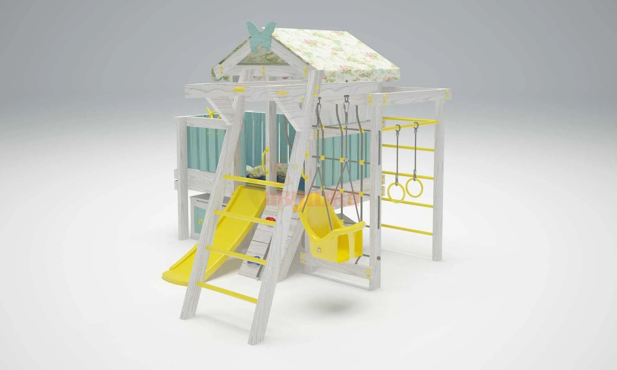 Комплекс включает игровую и спортивную зоны. В первой расположен уютный домик с крышей, декоративным тюлем и балконом. Забраться в него можно по мини-скалодрому с канатом и пластиковыми зацепами. Ваш ребенок сможет укрепить мышцы рук и ног! Спускается с комплекса вниз малыш по яркой пластиковой горке длиной 118 см.Чтобы сделать игры еще интереснее мы предусмотрели штурвал и бинокль. Сам дом стоит на платформе высотой 60 см. Это позволяет складывать под нее ящики с игрушками.