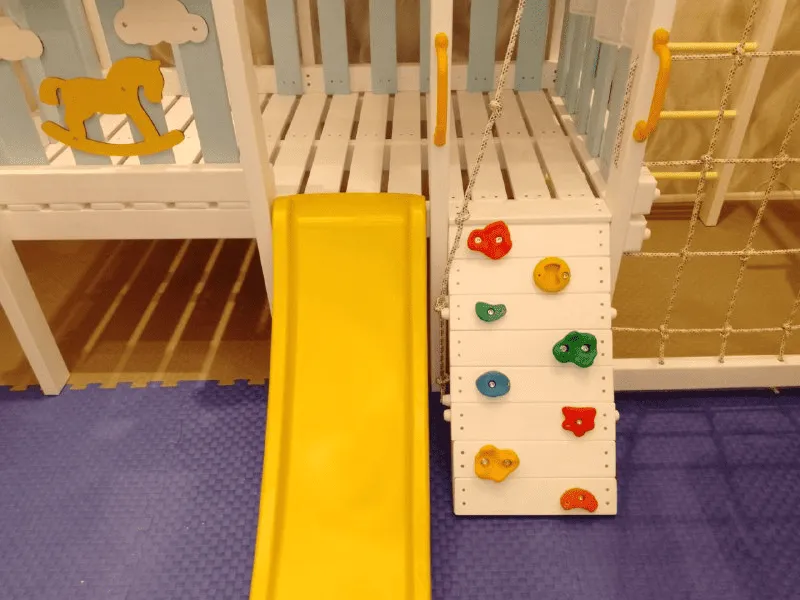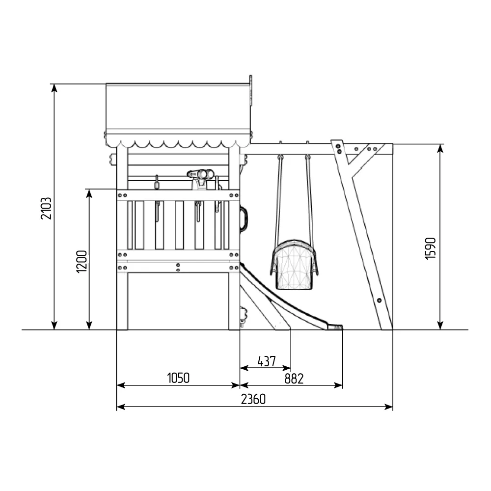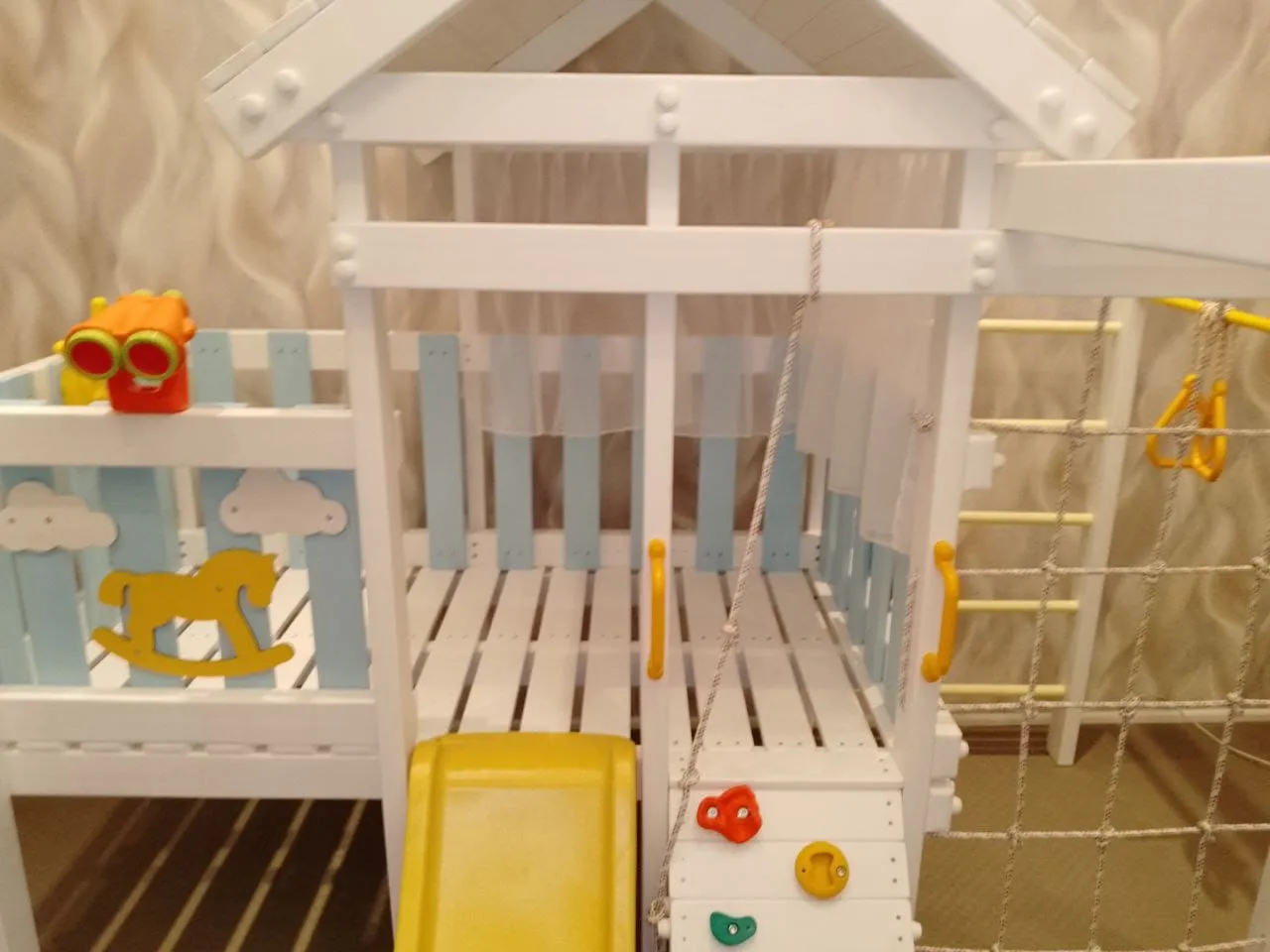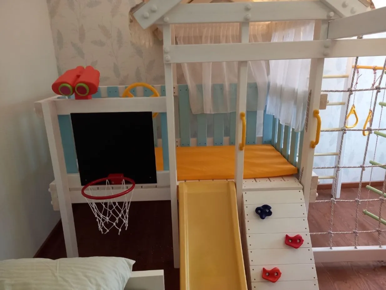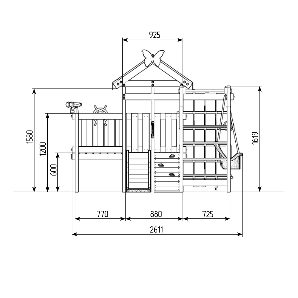 Комплекс включает игровую и спортивную зоны. В первой расположен уютный домик с крышей, декоративным тюлем и балконом. Забраться в него можно по мини-скалодрому с канатом и пластиковыми зацепами. Ваш ребенок сможет укрепить мышцы рук и ног! Спускается с комплекса вниз малыш по яркой пластиковой горке длиной 118 см.Чтобы сделать игры еще интереснее мы предусмотрели штурвал и бинокль. Сам дом стоит на платформе высотой 60 см. Это позволяет складывать под нее ящики с игрушками.