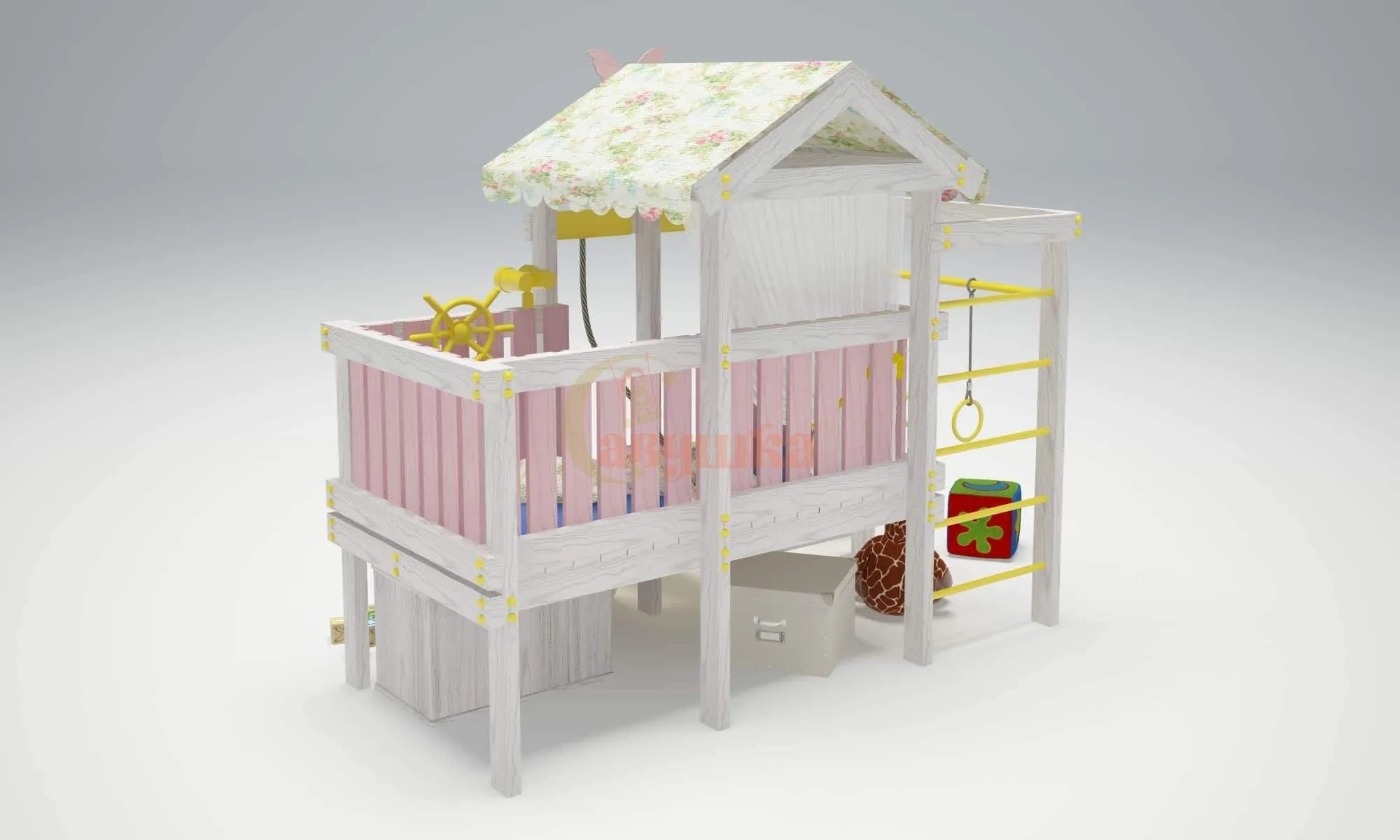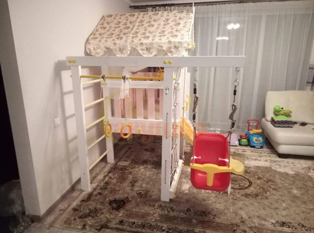 «Савушка Baby-6» станет хорошим вариантом для дачи или квартиры! В комплектацию входит домик с балконом и крышей, расположенный на платформе, на высоте 60 см от пола и спортивная зона. Благодаря белоснежному легкому тюлю ваши малыши будут чувствовать себя уютно и спокойно в домике.При желании его можно оборудовать под кровать, а в свободном пространстве снизу удобно хранить коробки с вещами и игрушками. Вход наверх - по пластиковым зацепам мини-скалодрома. Канат позволит вашему ребенку развить силу рук.