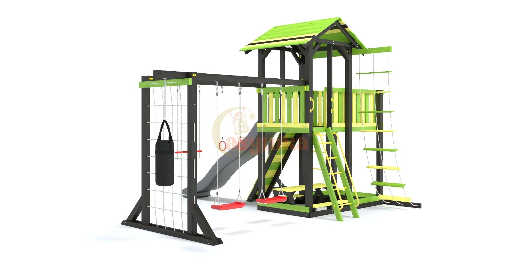 Особенности площадки включают в себя усиленный качельный подвес "D+", который изготовлен из оцинкованной стали и не будет ржаветь во время эксплуатации. Конструкция подвеса включает в себя два зубчика, которые дают возможность фиксировать подвес к балке, что не позволяет ему разбалтываться и выдерживать взрослых. Более того, дерево обработано лакокрасочным покрытием на водной основе с разрешающим сертификатом для покрытия детских игровых площадок в 2 слоя, что подтверждает безопасность состава.