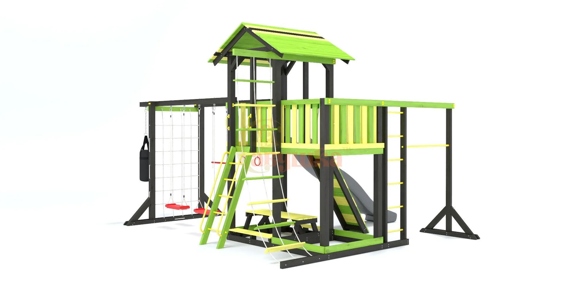 На площадке есть возможность замен и дополнений (более 20 дополнительных опций, рассчитанных на разный возраст и интересы детей), что позволяет выбирать вместе с детьми дополнительное оборудование и получать приятные эмоции еще на этапе выбора. Вместе с этой площадкой детям будет легко и увлекательно проводить время, заниматься спортом и наслаждаться рисованием или игрой в куклы.