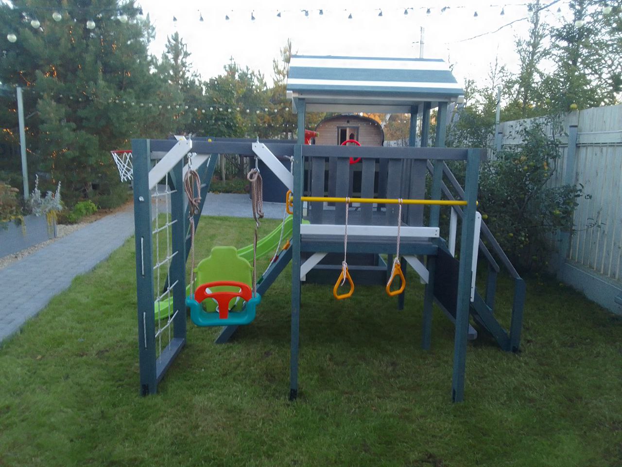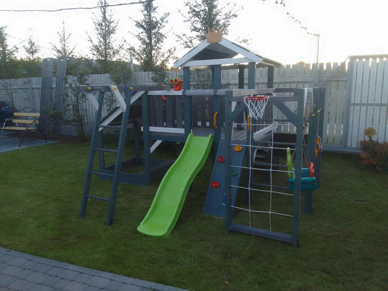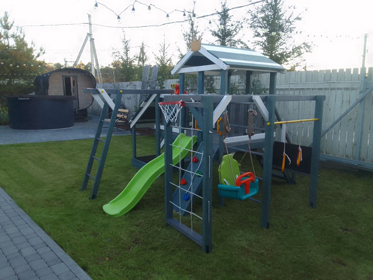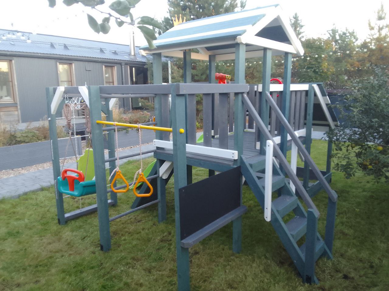 Компактная, но прочная игровая конструкция выдерживает высокие нагрузки. В домике с деревянной крышей можно играть, а пластиковая горка подойдет малышам. Удобная деревянная лестница с перилами обеспечивает легкий подъем.