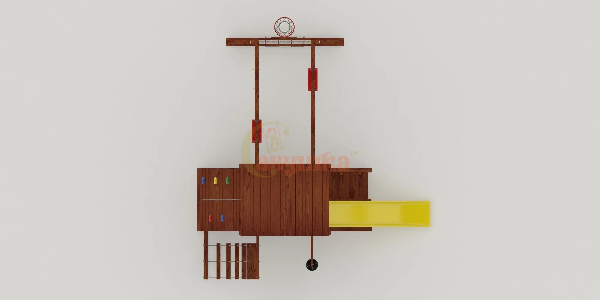 Конструкция выполнена из прочного клееного бруса, соответствующего стандартам ГОСТ. Все металлические соединения скрыты под пластиковыми заглушками, что повышает безопасность использования.