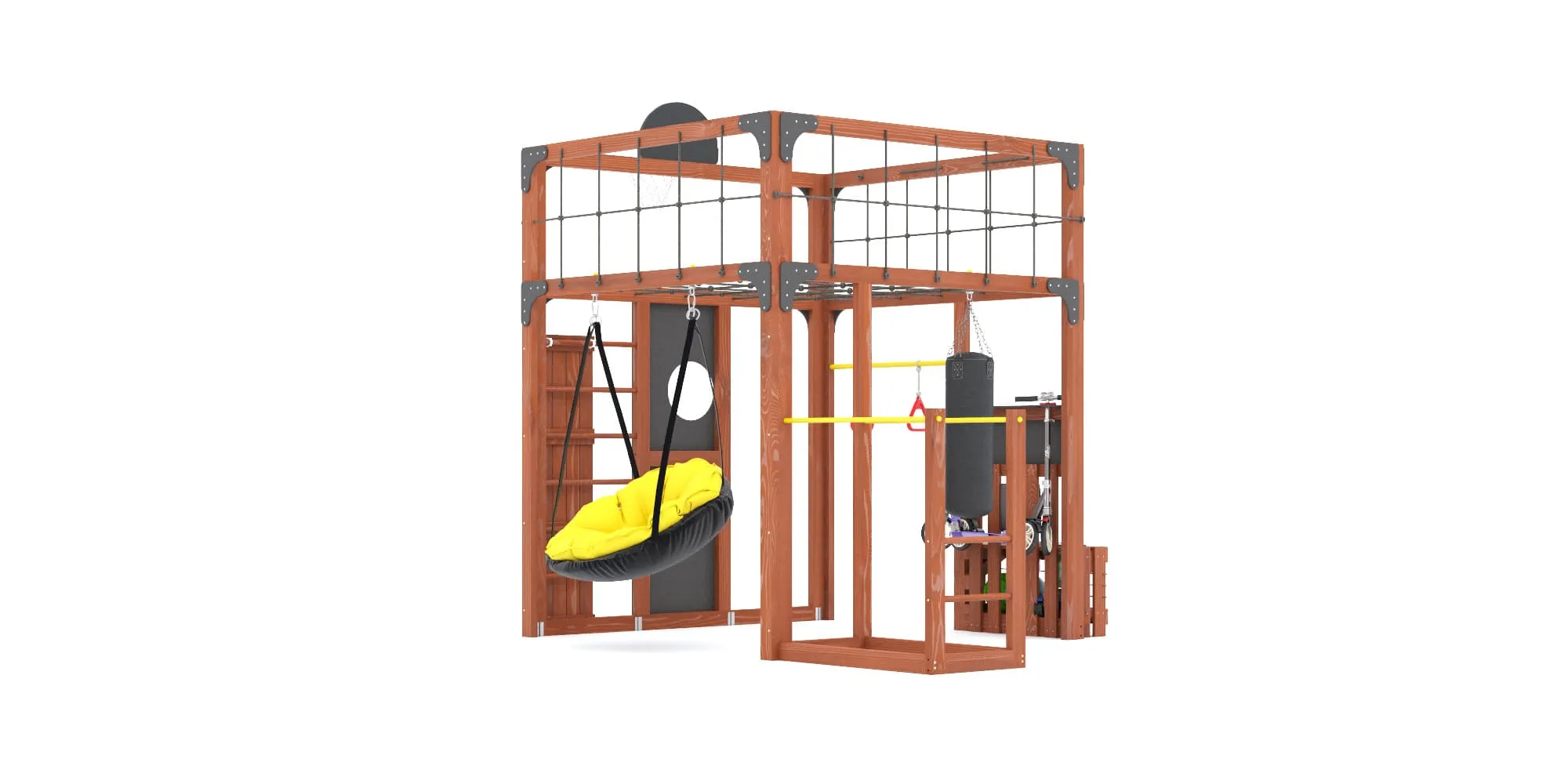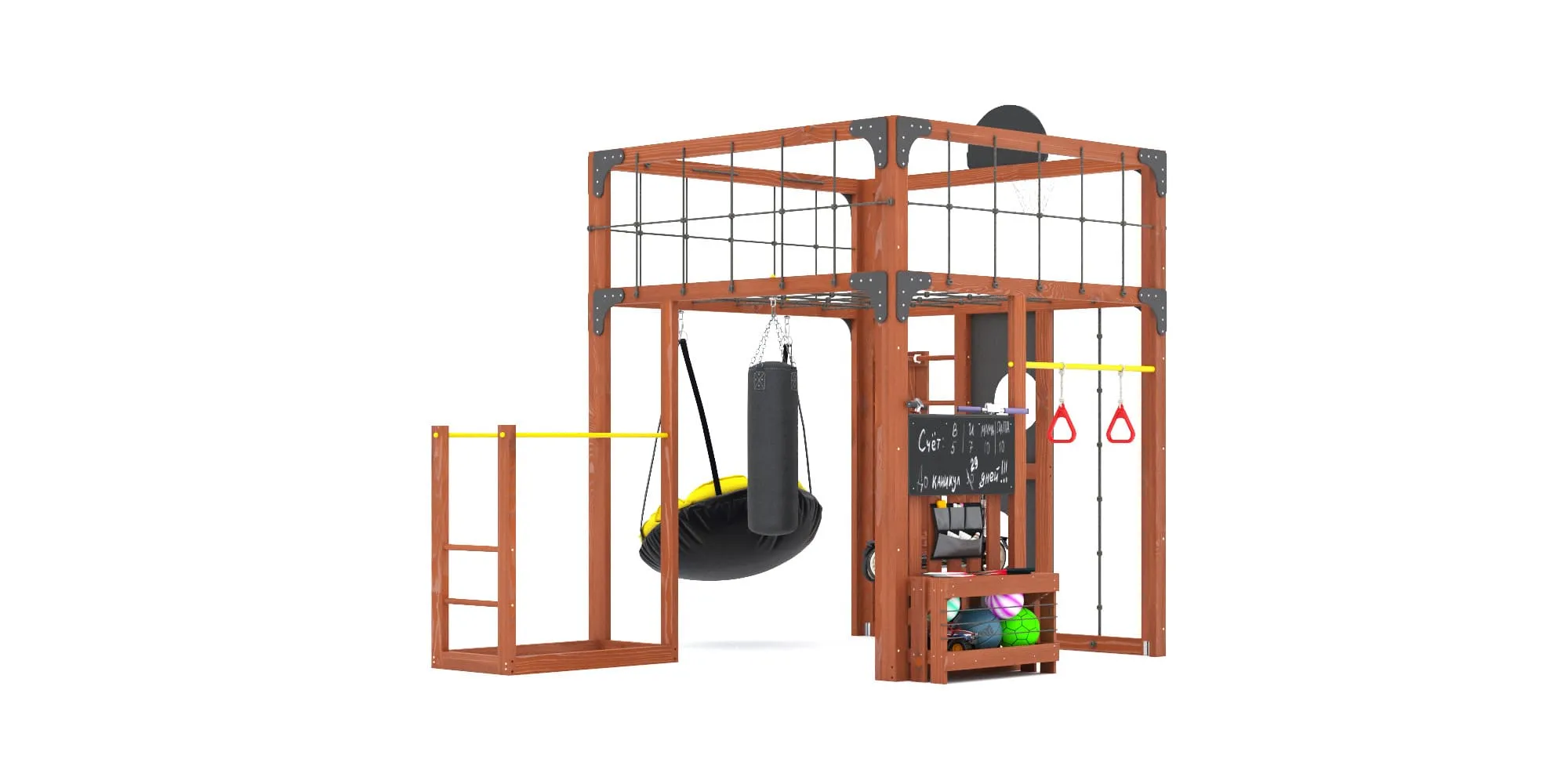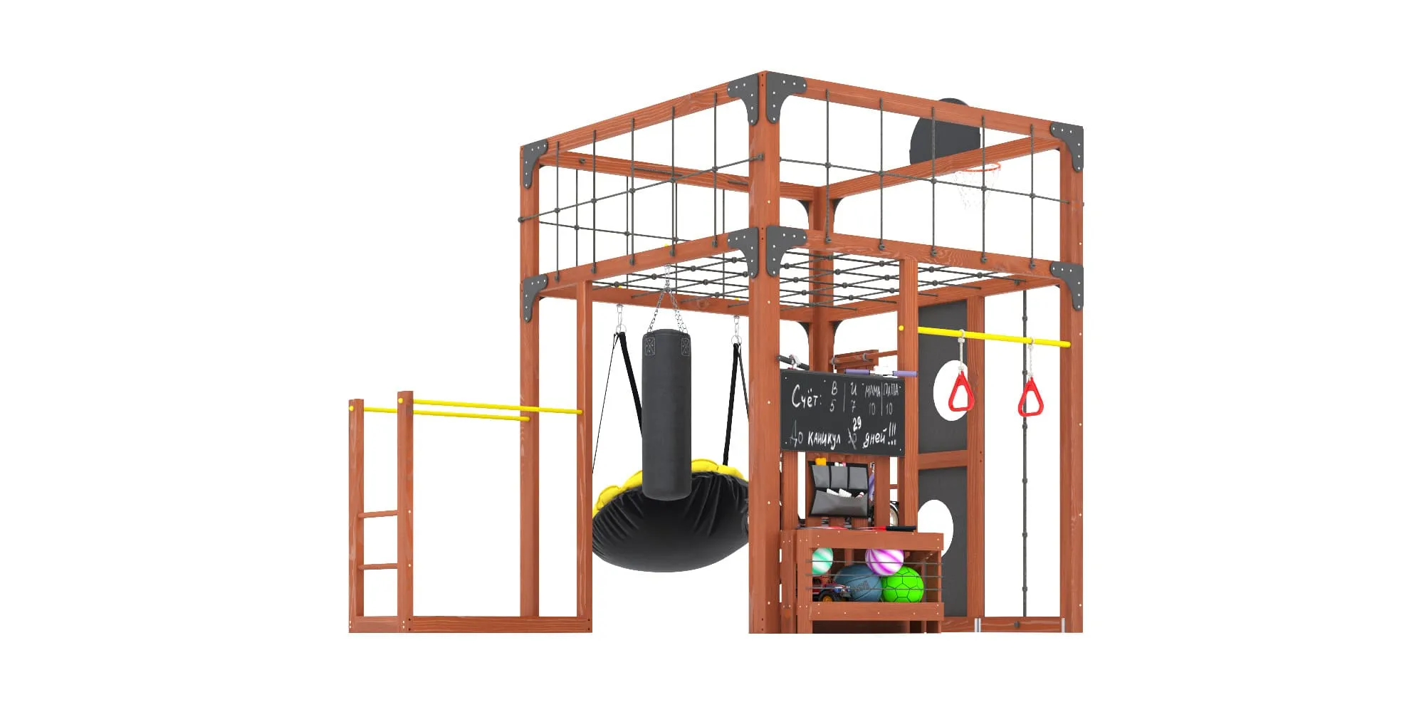 - Нижний спортивно-игровой уровень: включает боксерскую грушу, гимнастические кольца и параллельные брусья для разнообразных физических упражнений.
