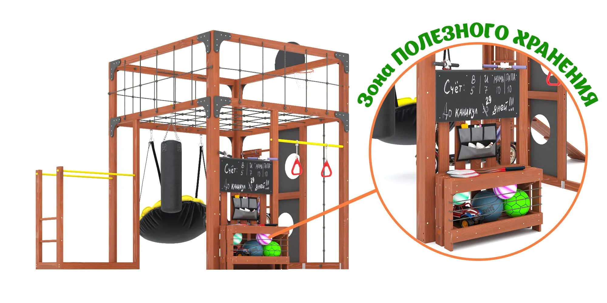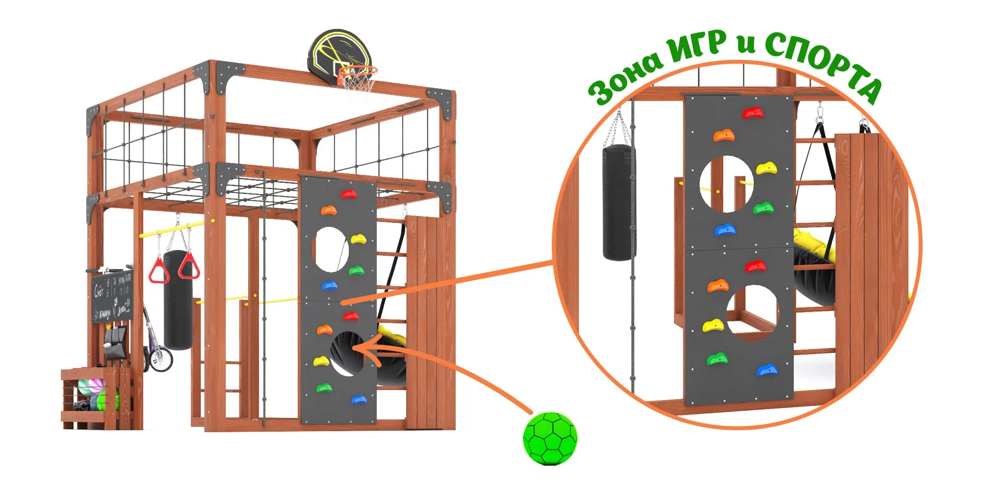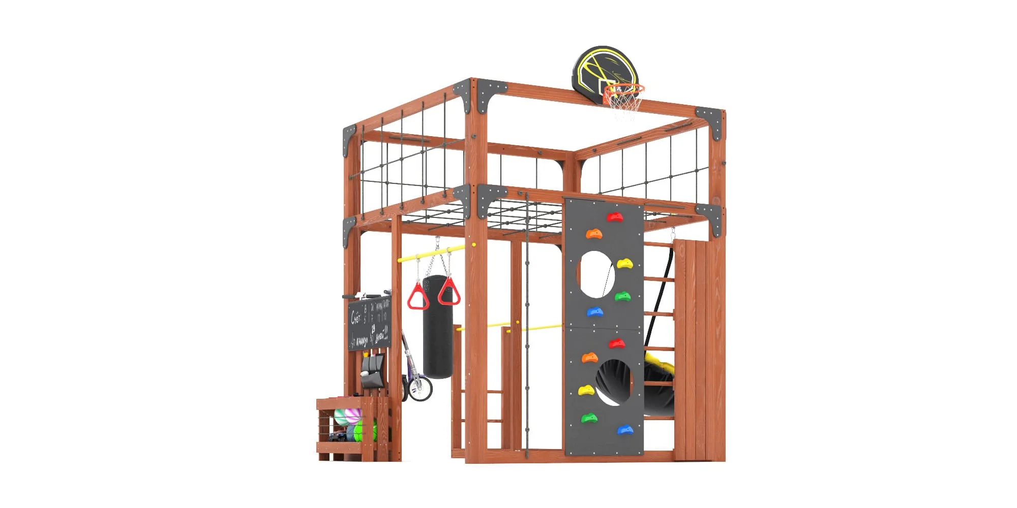 - Нижний спортивно-игровой уровень: включает боксерскую грушу, гимнастические кольца и параллельные брусья для разнообразных физических упражнений.