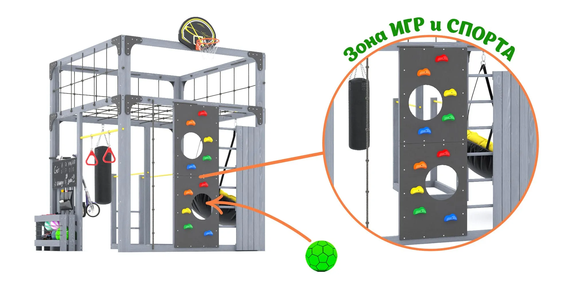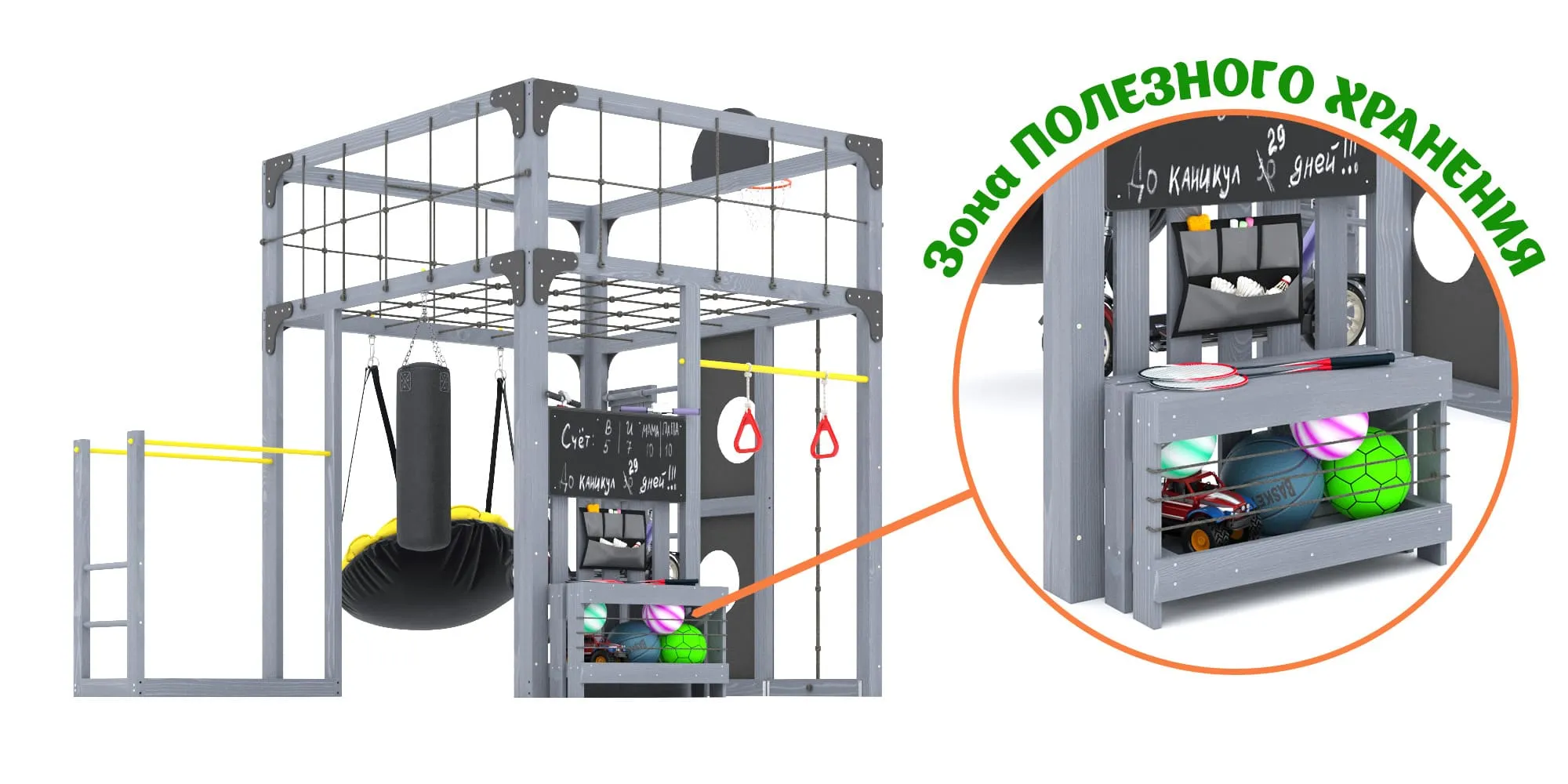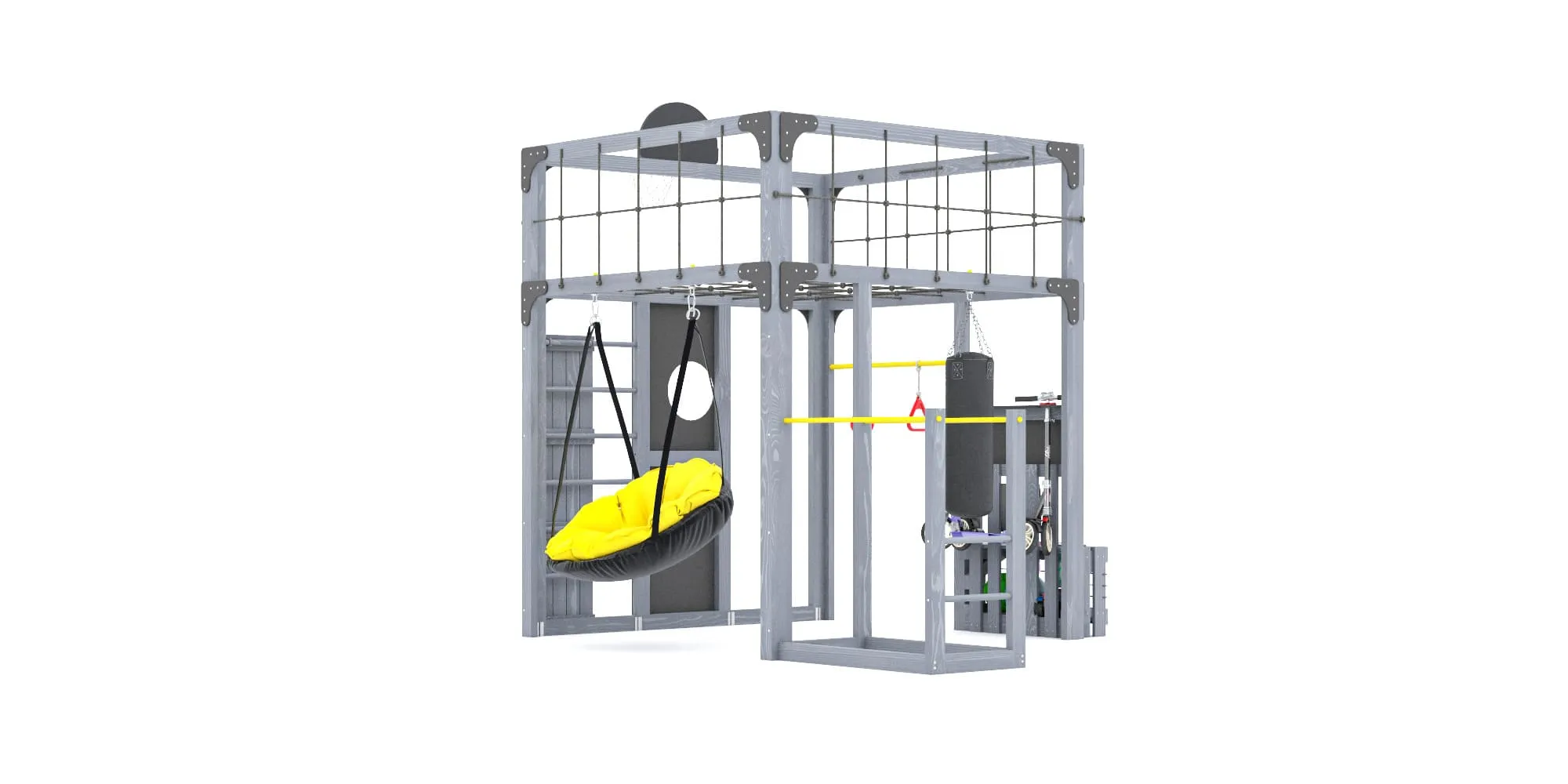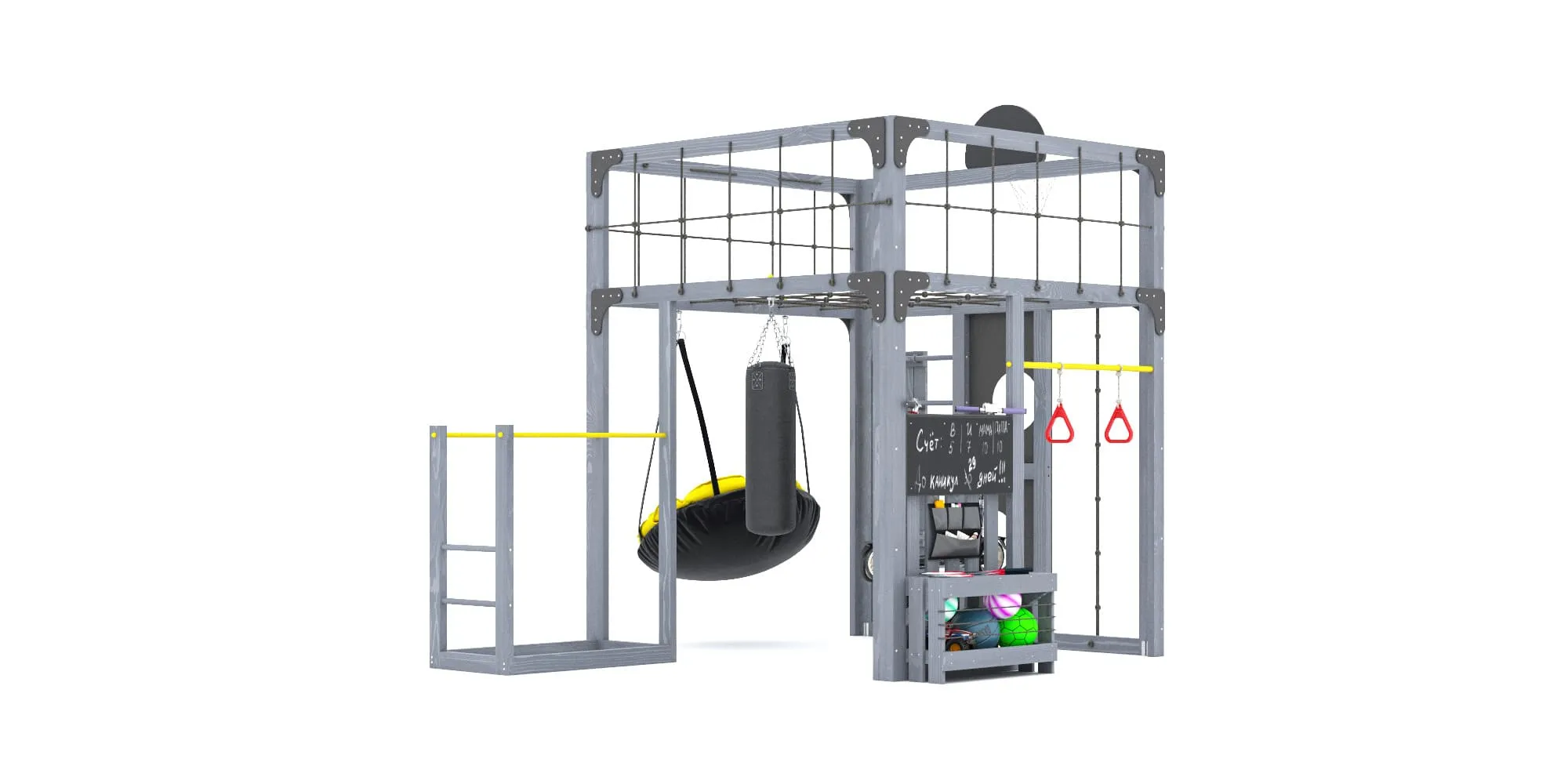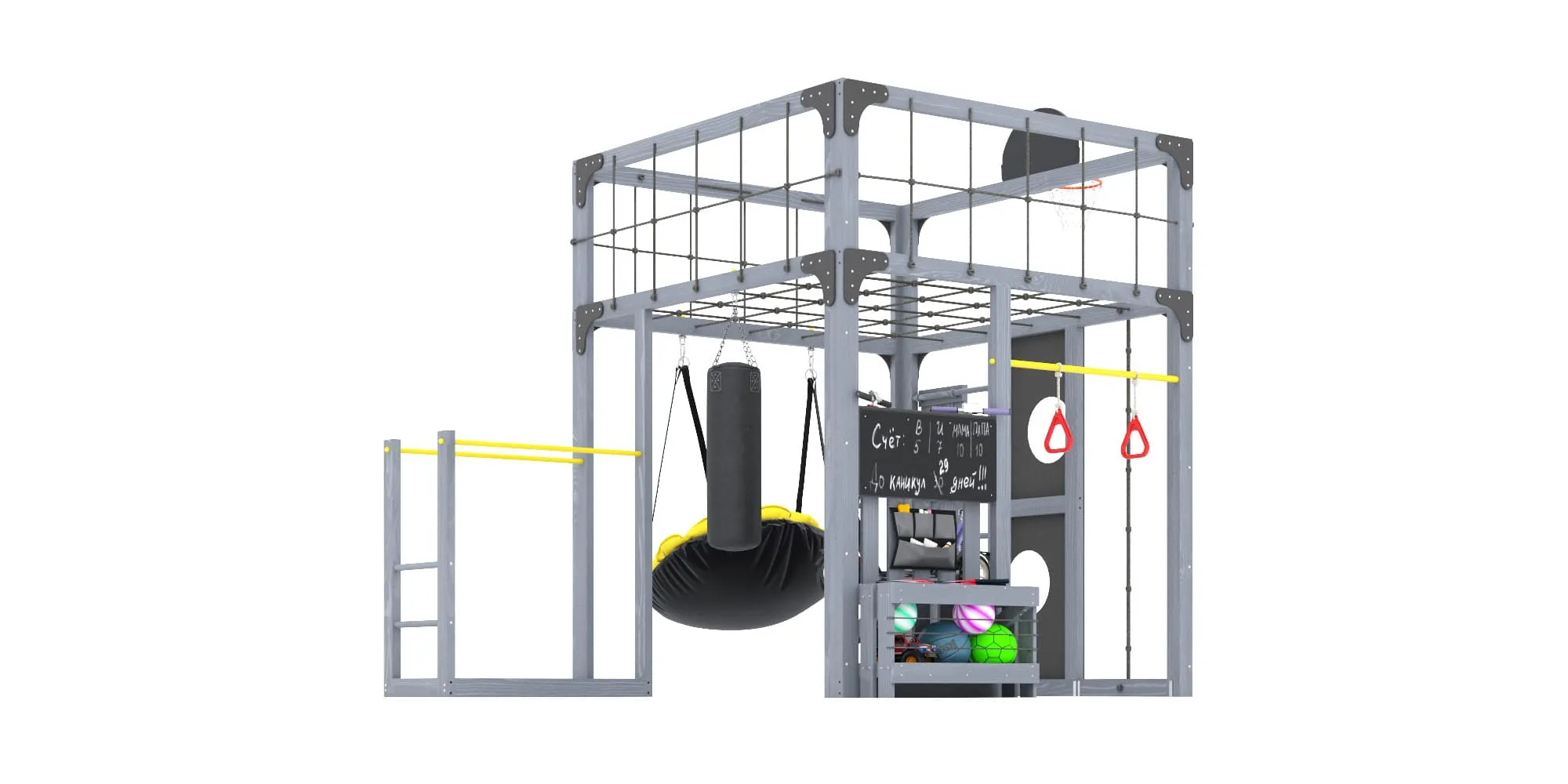 - Нижний спортивно-игровой уровень: включает боксерскую грушу, гимнастические кольца и параллельные брусья для разнообразных физических упражнений.