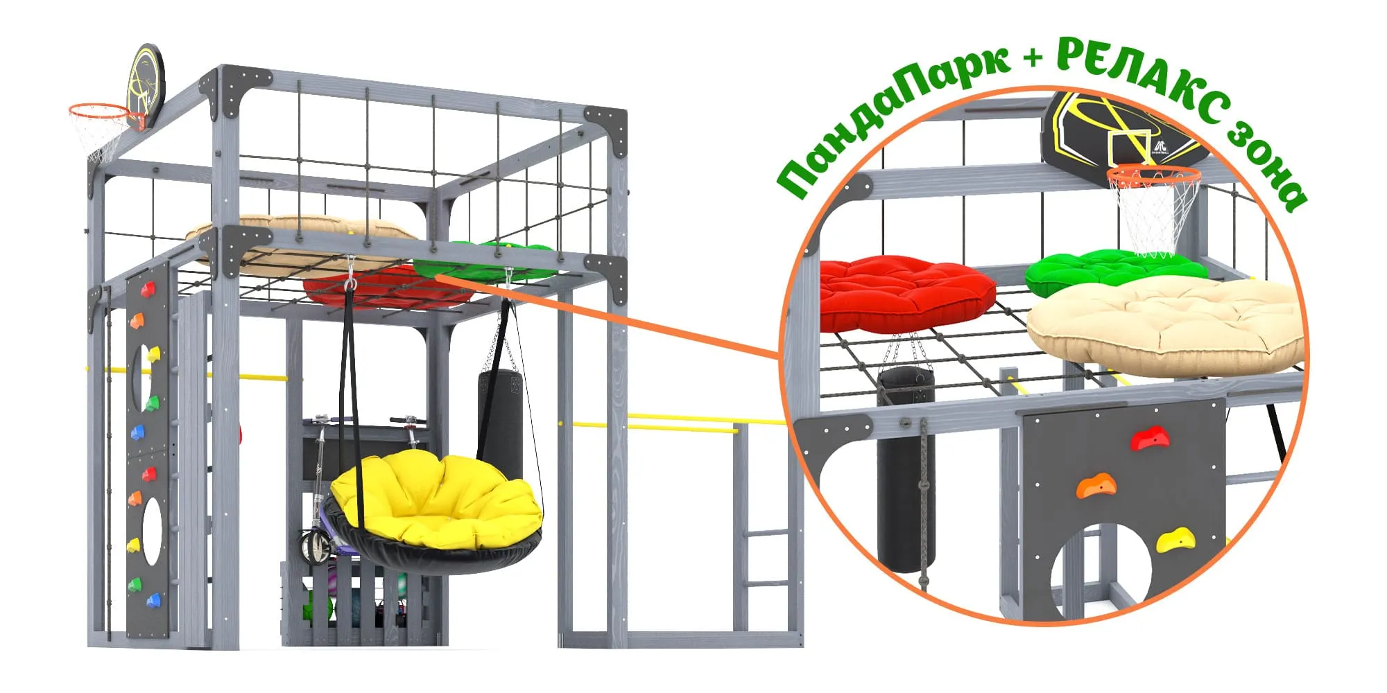 - Верхний спортивно-игровой уровень «ПандаПарк»: увлекательная зона для лазания, развивающая координацию и ловкость.