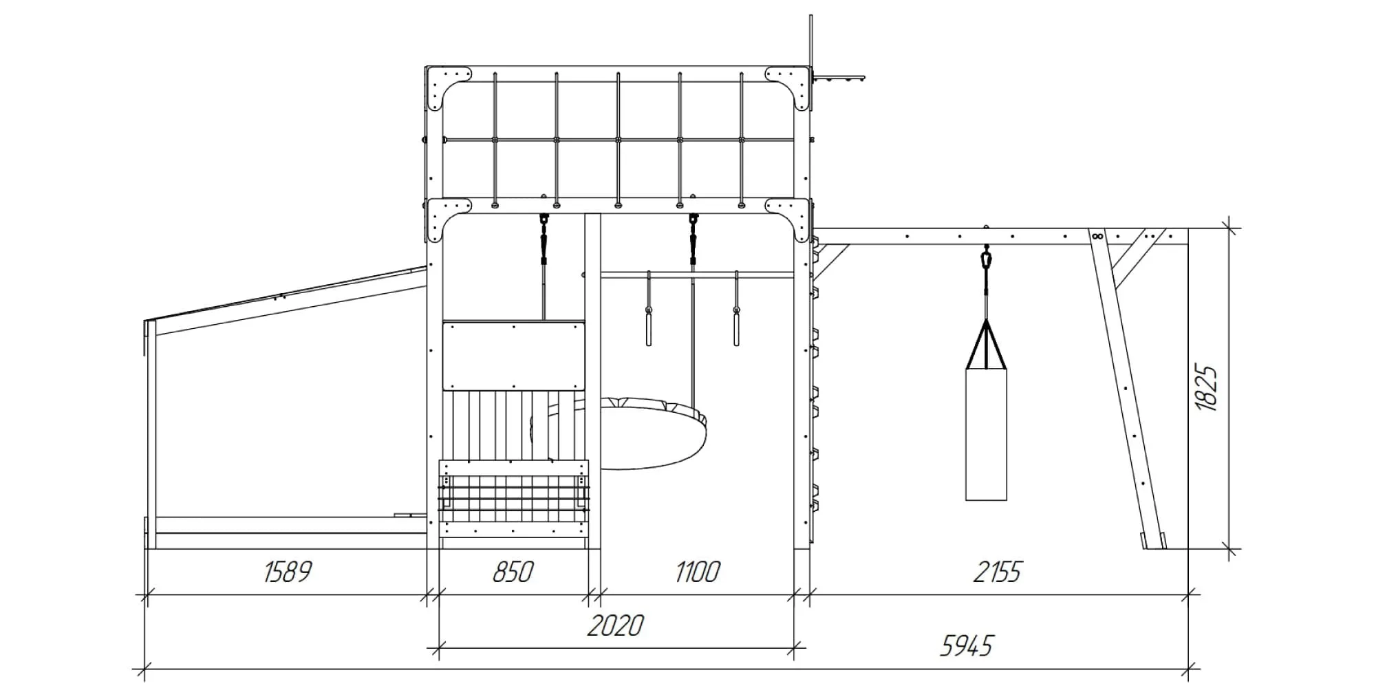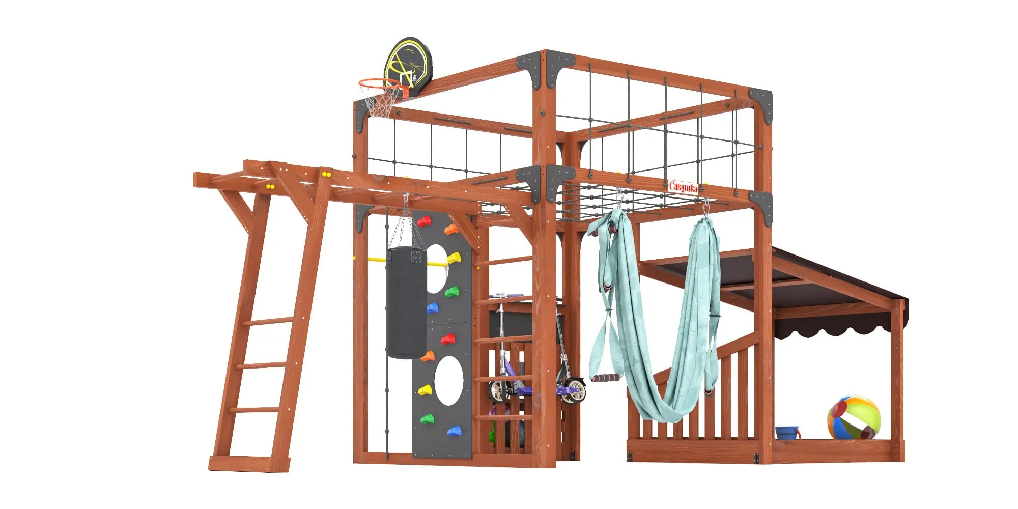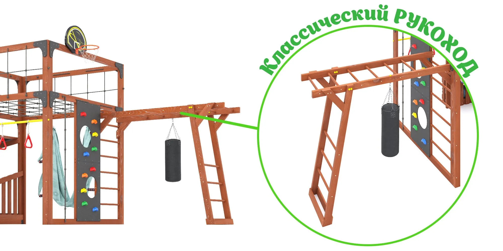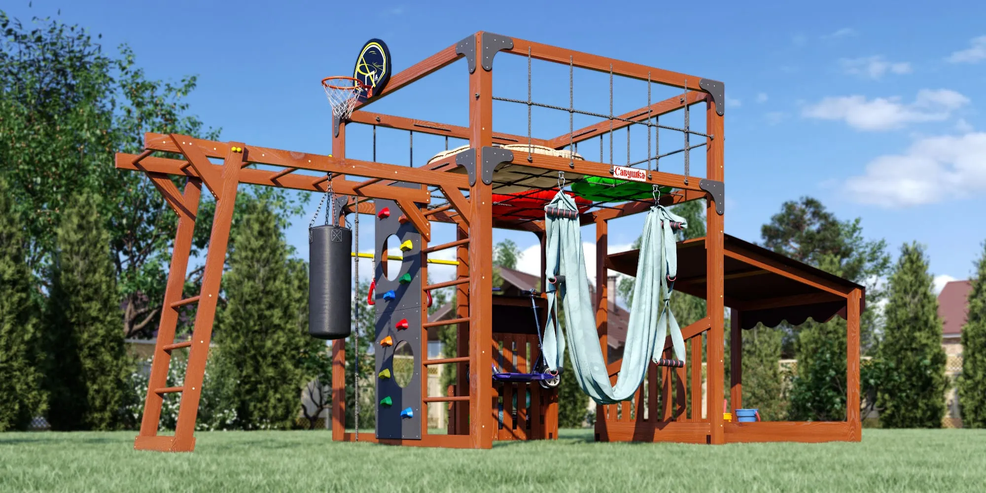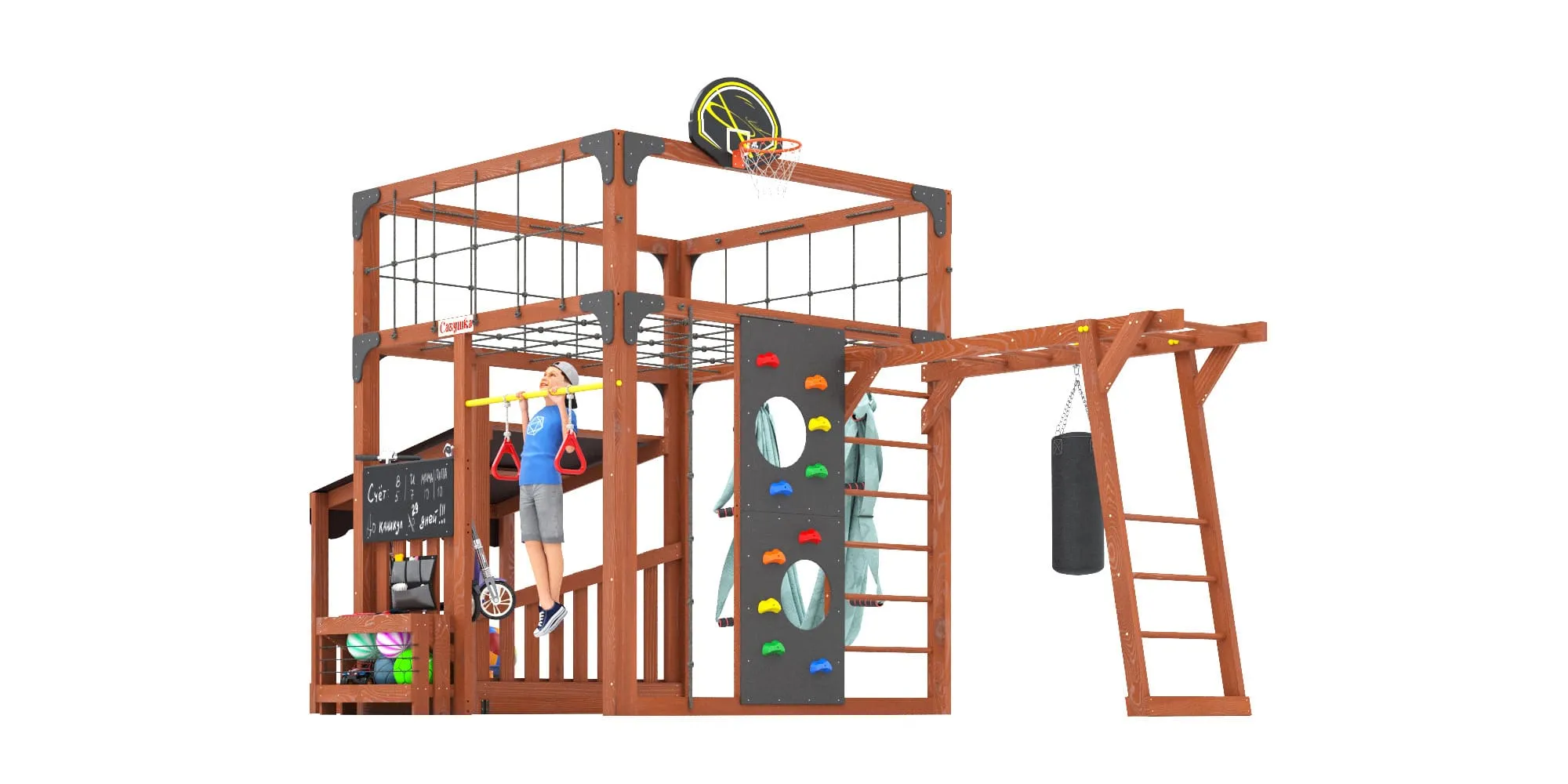- Многофункциональные спортивные элементы: турник, гимнастические кольца, боксерская груша, шведская стенка, рукоход — все для полноценной тренировки и семейных соревнований.