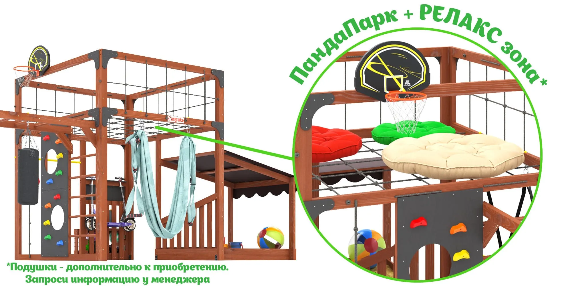 - Спорт и активность для всех: Верхний уровень «ПандаПарк» — сетка-лазалка, баскетбольное кольцо со щитом и скалодром развивают силу, ловкость и координацию как у детей, так и взрослых.