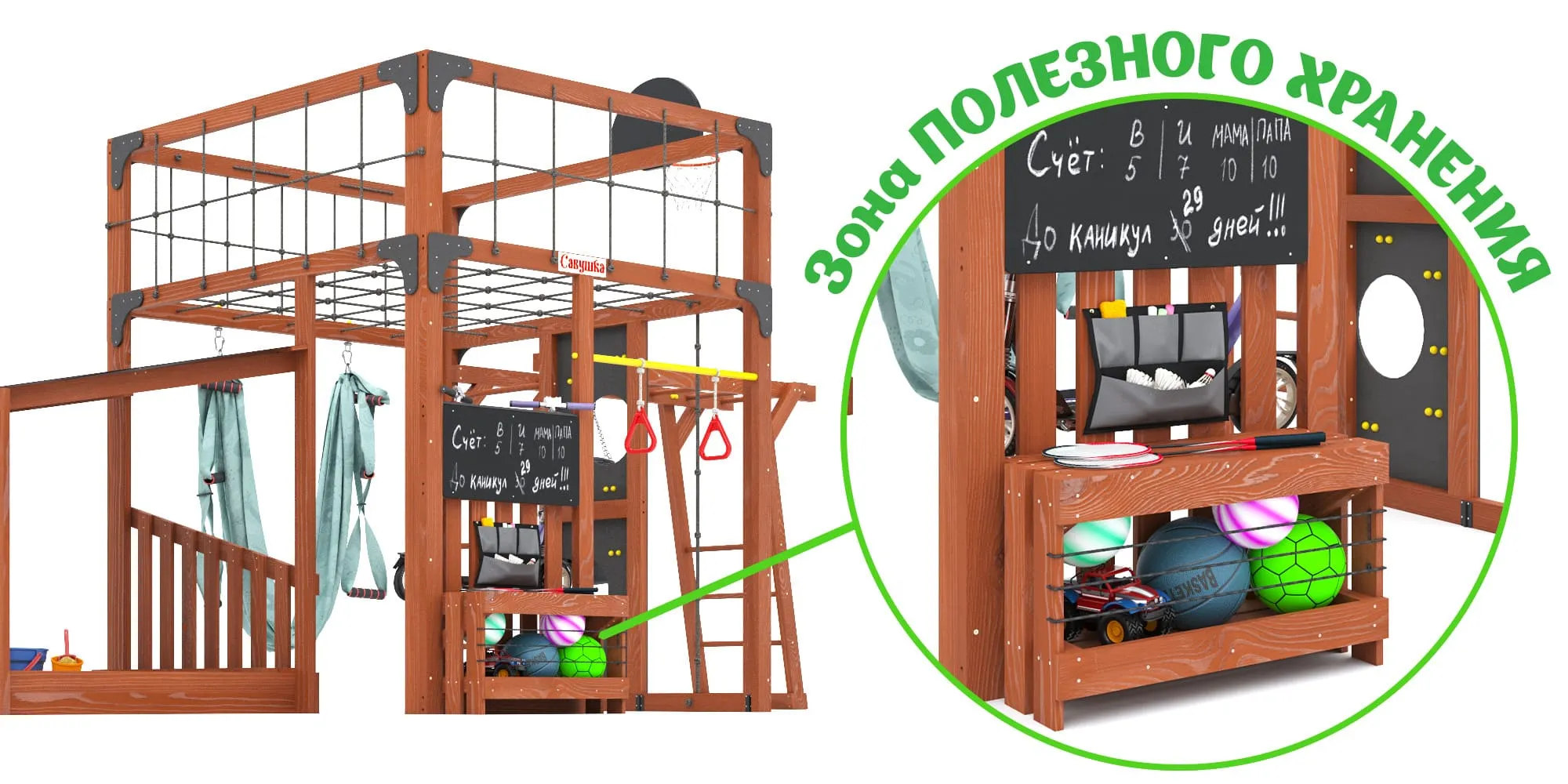 - Удобство и порядок: база для самокатов на 2 штуки и ящик-скамья для мячей с резинкой помогут сохранить порядок на площадке и в саду.