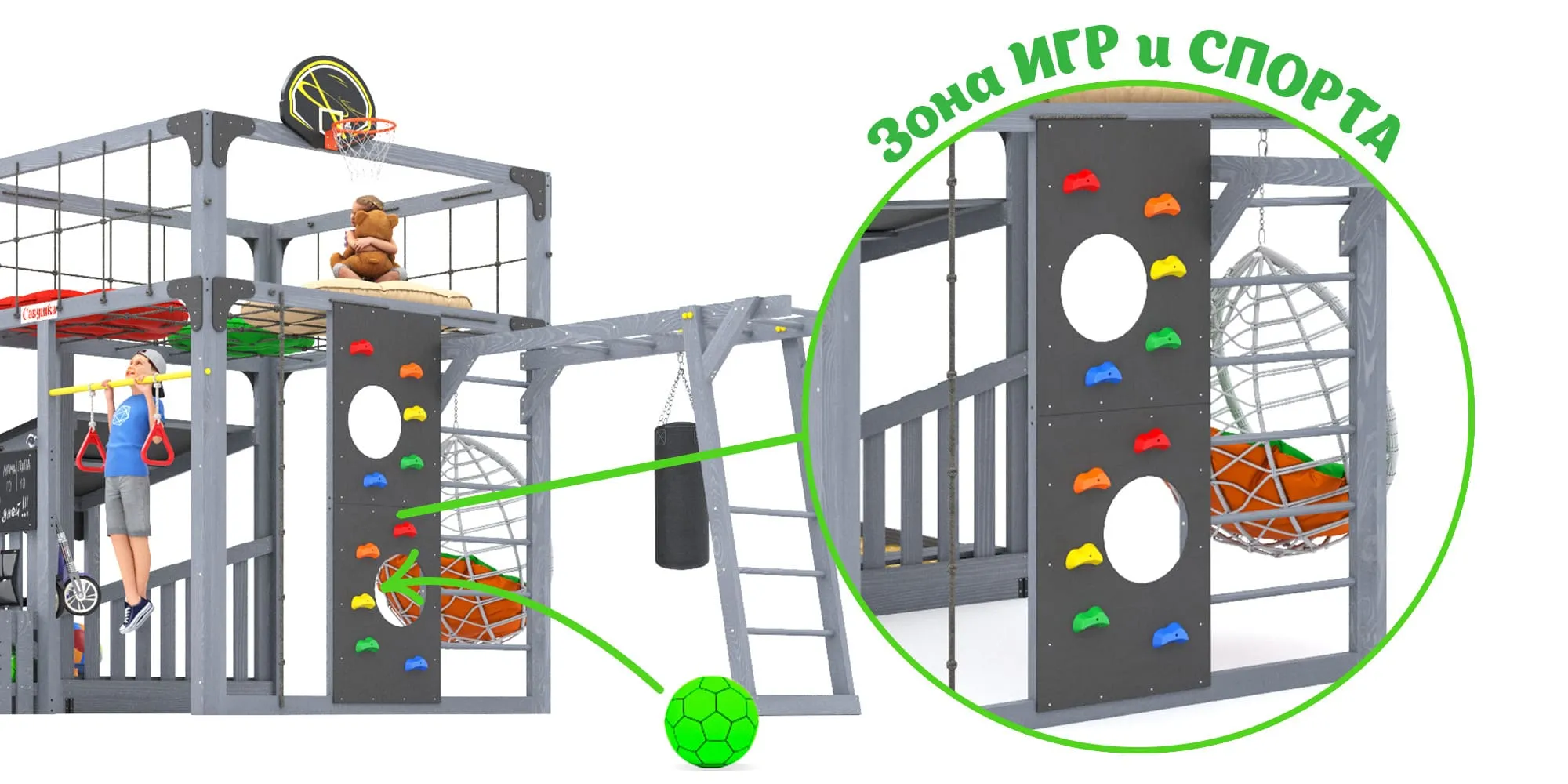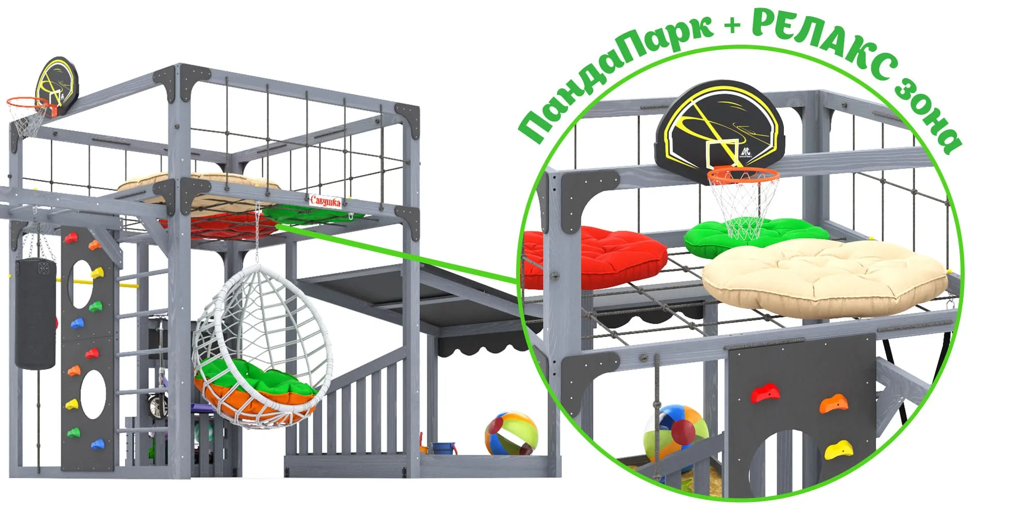 - Спорт и активность для всех: Верхний уровень «ПандаПарк» — сетка-лазалка, баскетбольное кольцо со щитом и скалодром развивают силу, ловкость и координацию как у детей, так и взрослых.