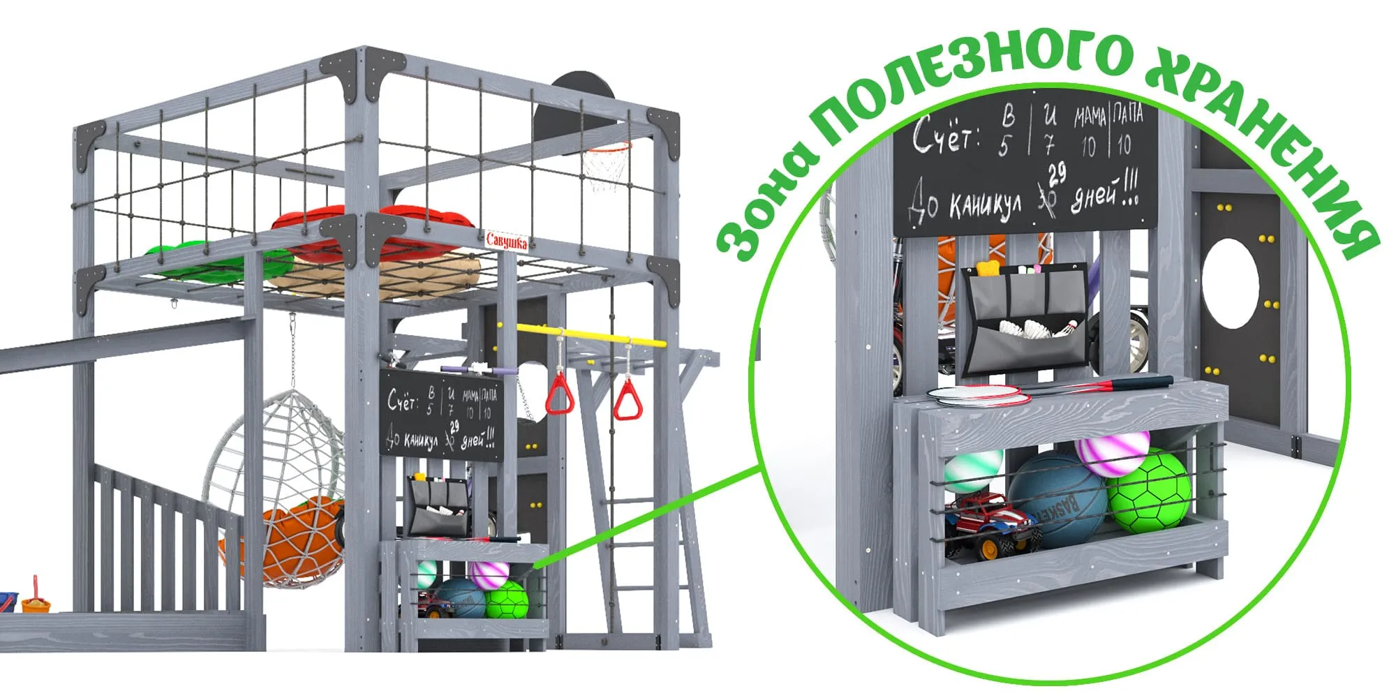 - Удобство и порядок: база для самокатов на 2 штуки и ящик-скамья для мячей с резинкой помогут сохранить порядок на площадке и в саду.