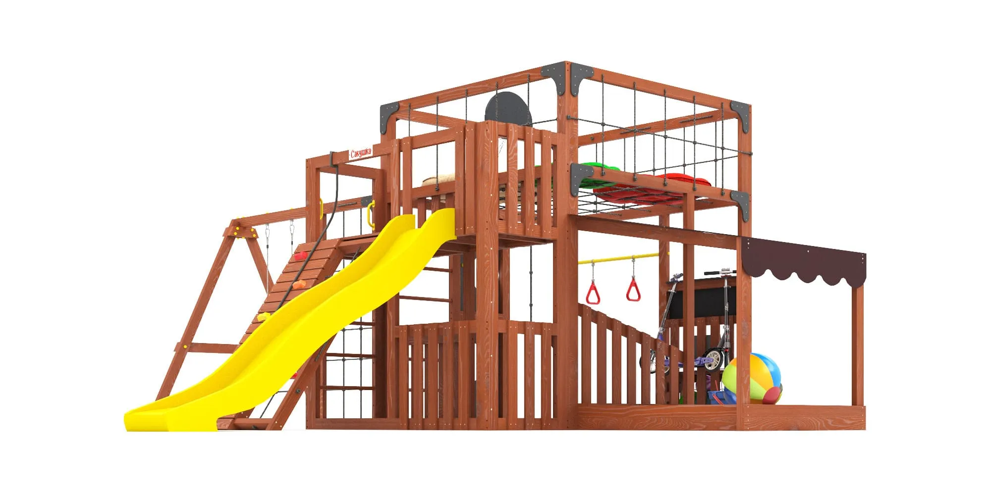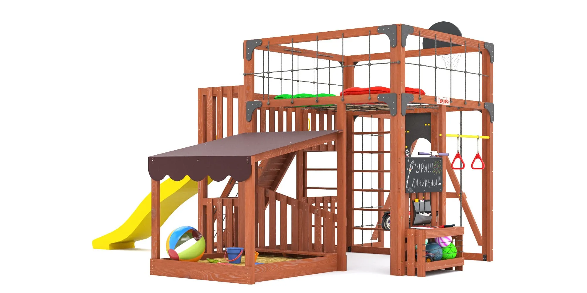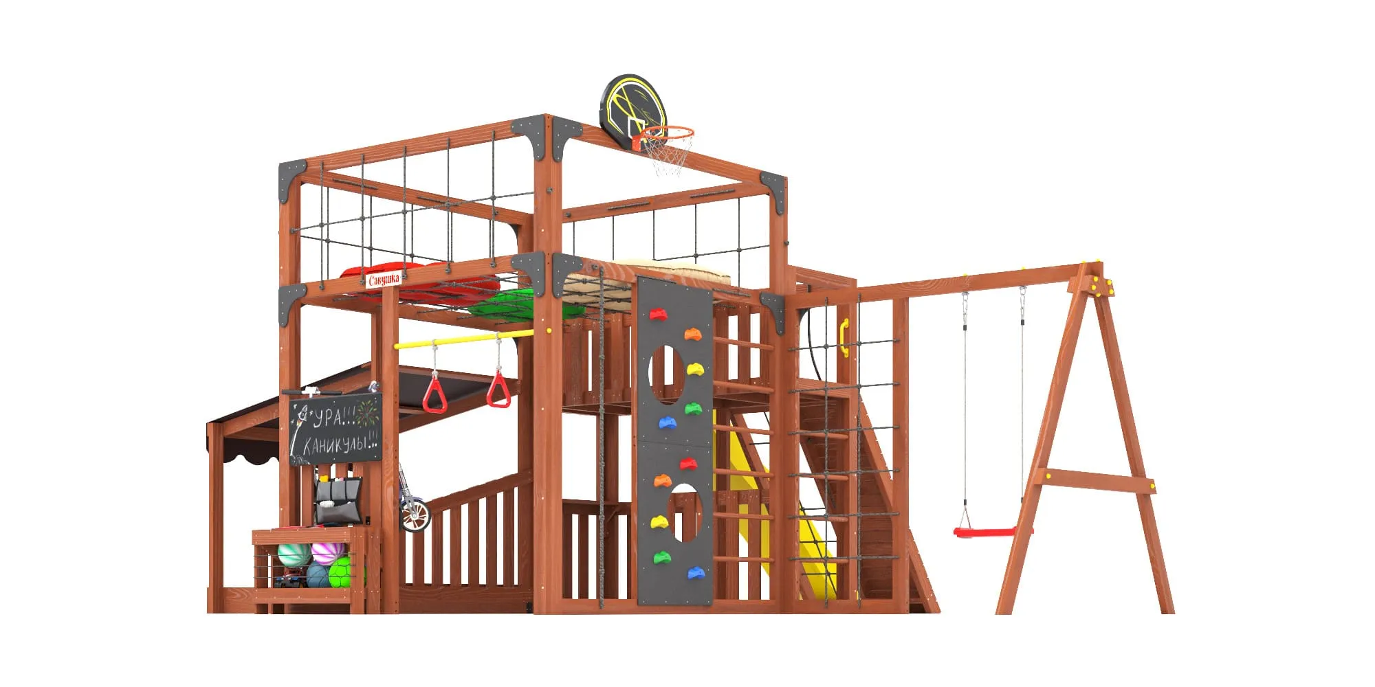 - Два уровня со спортивными элементами: вертикальный и наклонный скалодромы, сетка-лазалка, шведские стенки, турник, гимнастические кольца и баскетбольный щит PROFI — площадка становится местом силы и выносливости.