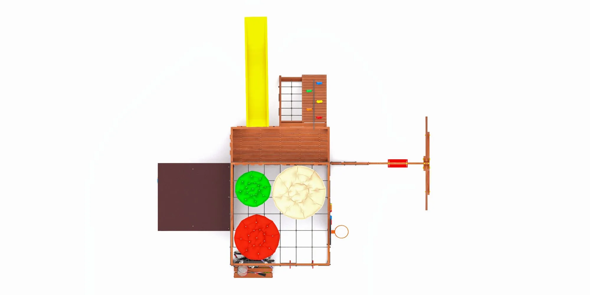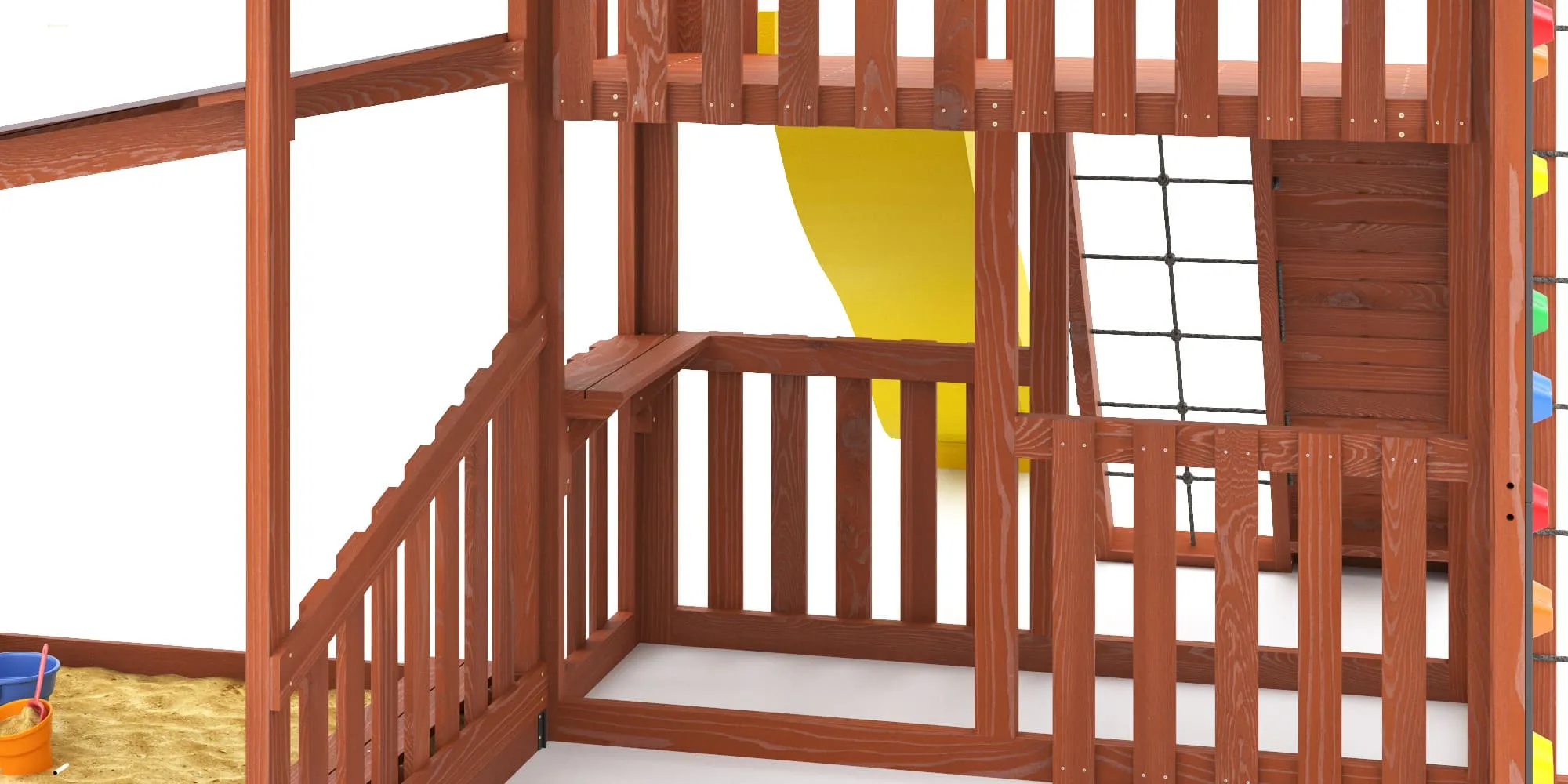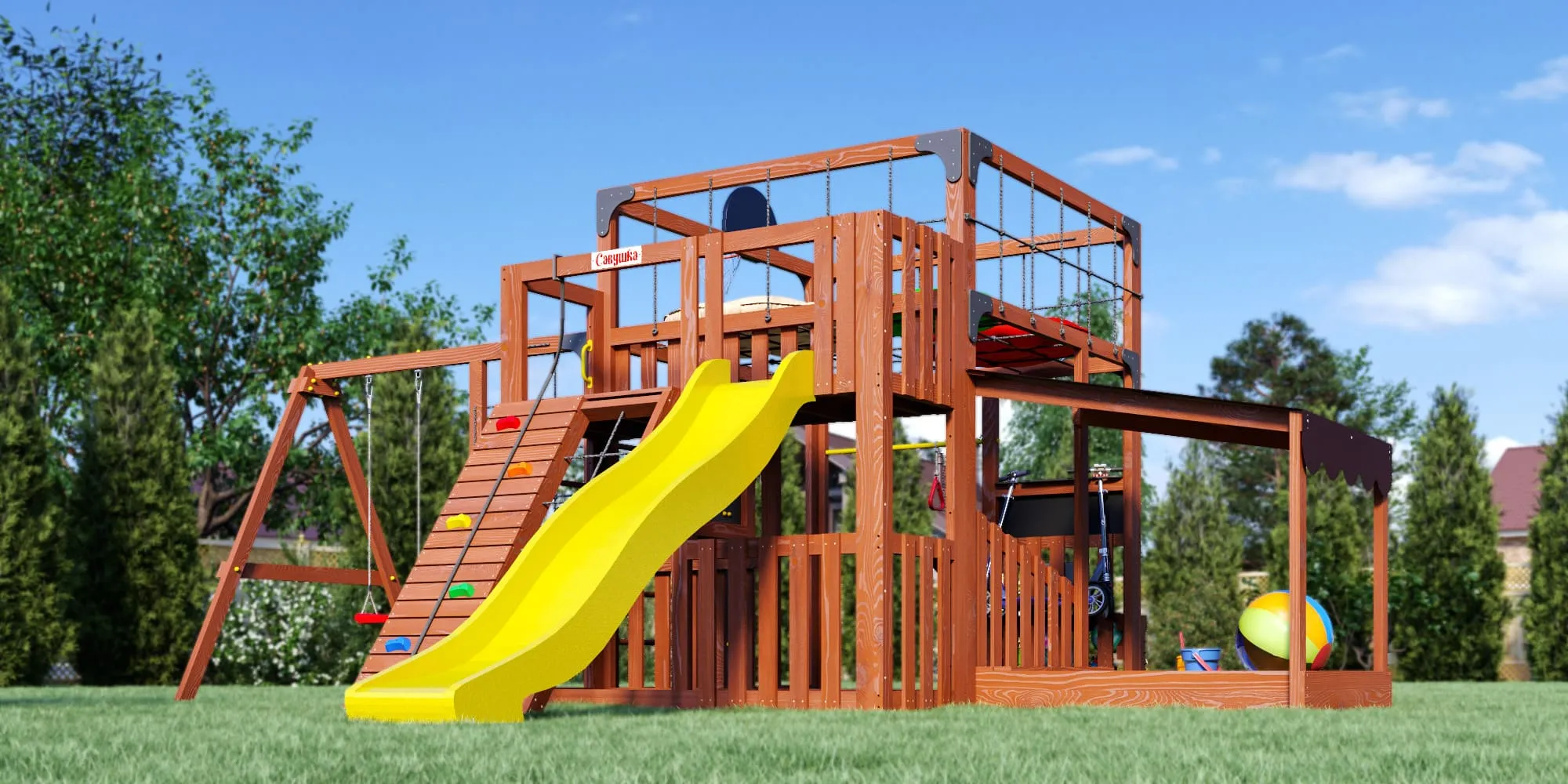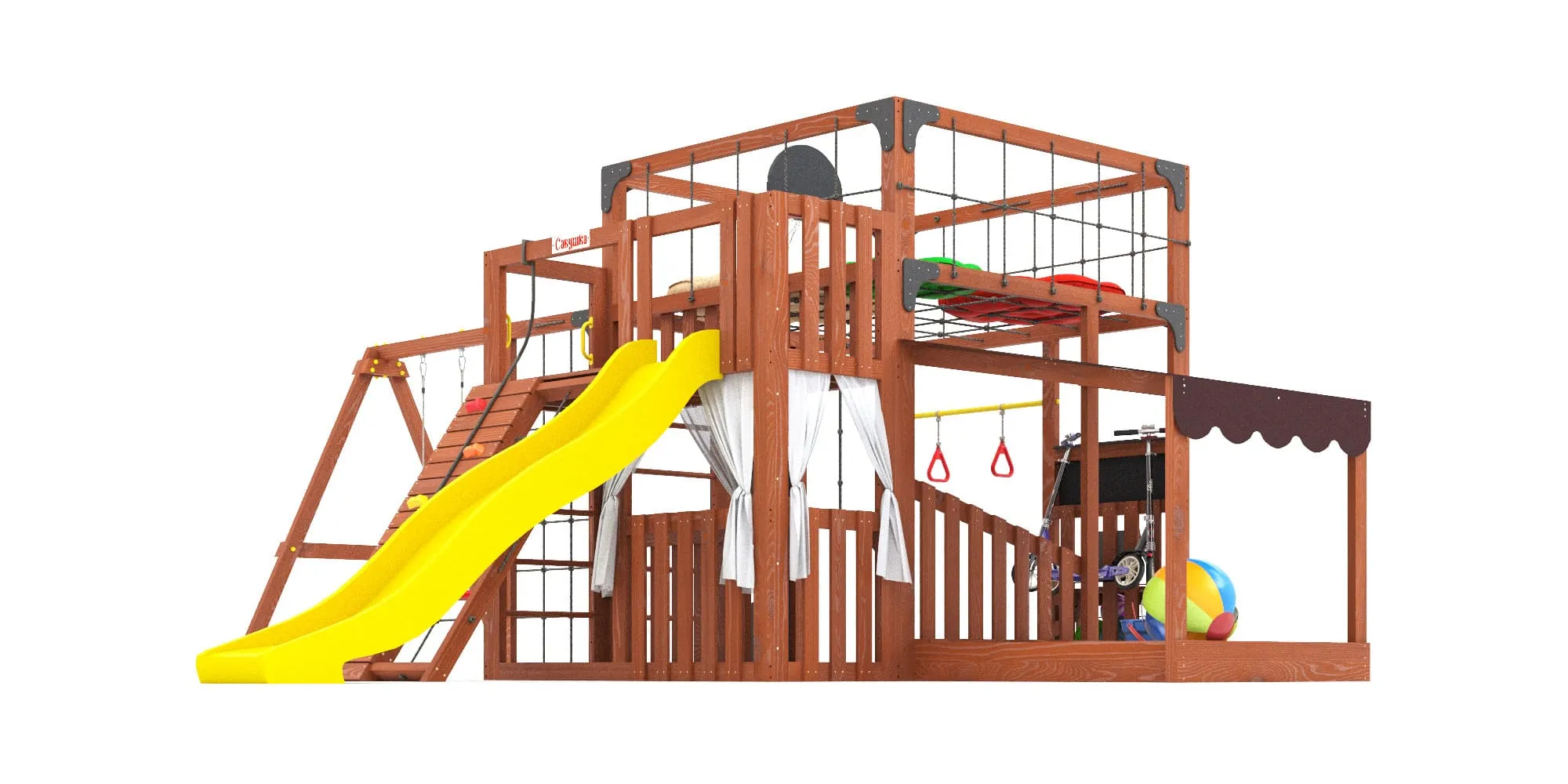 - Два уровня со спортивными элементами: вертикальный и наклонный скалодромы, сетка-лазалка, шведские стенки, турник, гимнастические кольца и баскетбольный щит PROFI — площадка становится местом силы и выносливости.