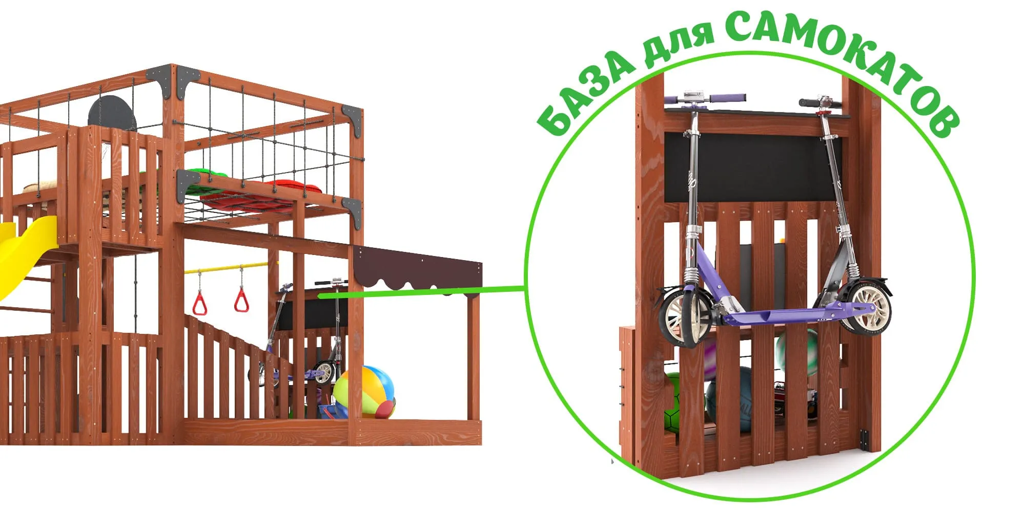 - База для самокатов (на 2 штуки), органайзер и ящик-скамья с резинкой для мячей — всё на своих местах, и ничего не потеряется.