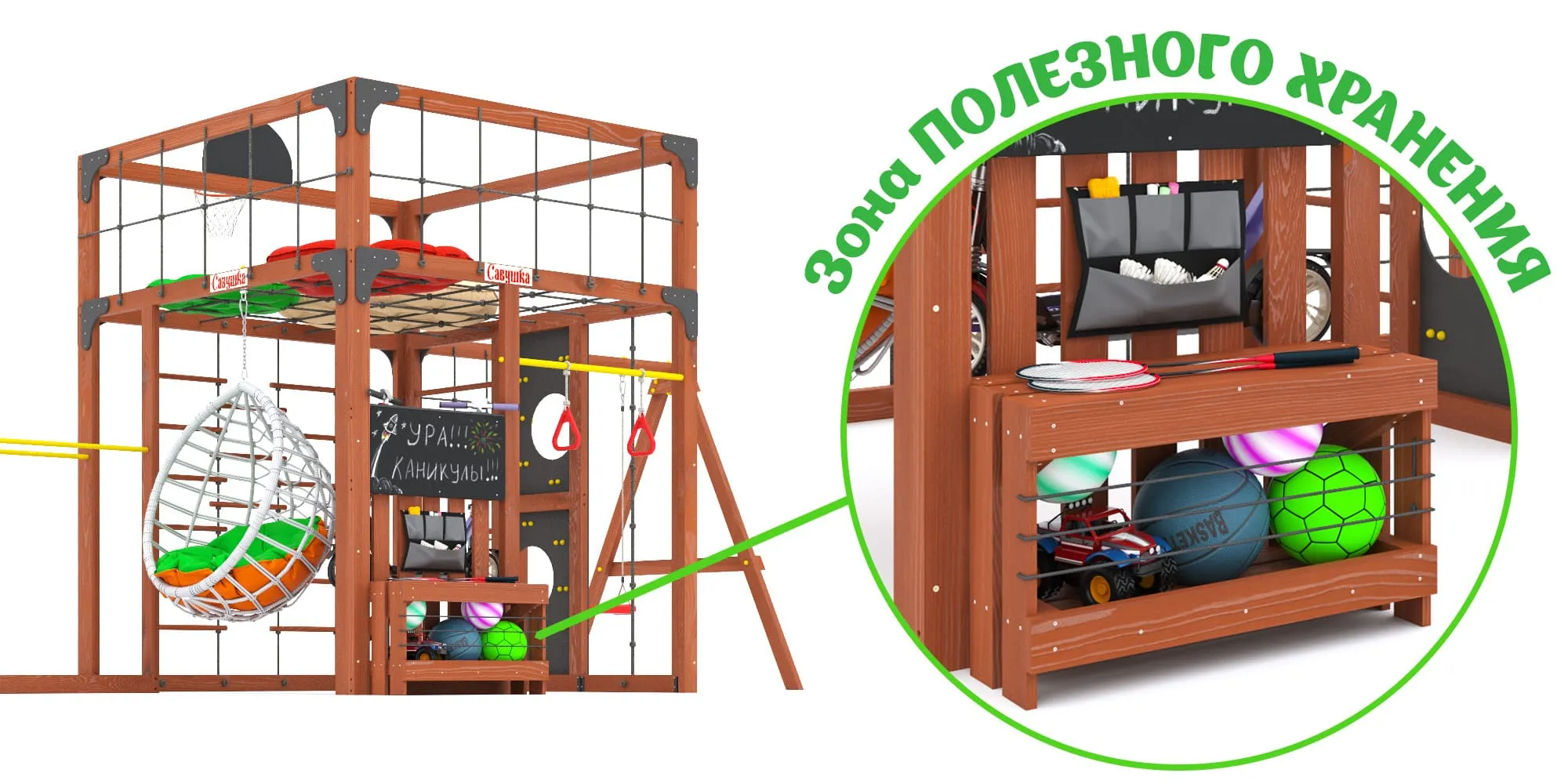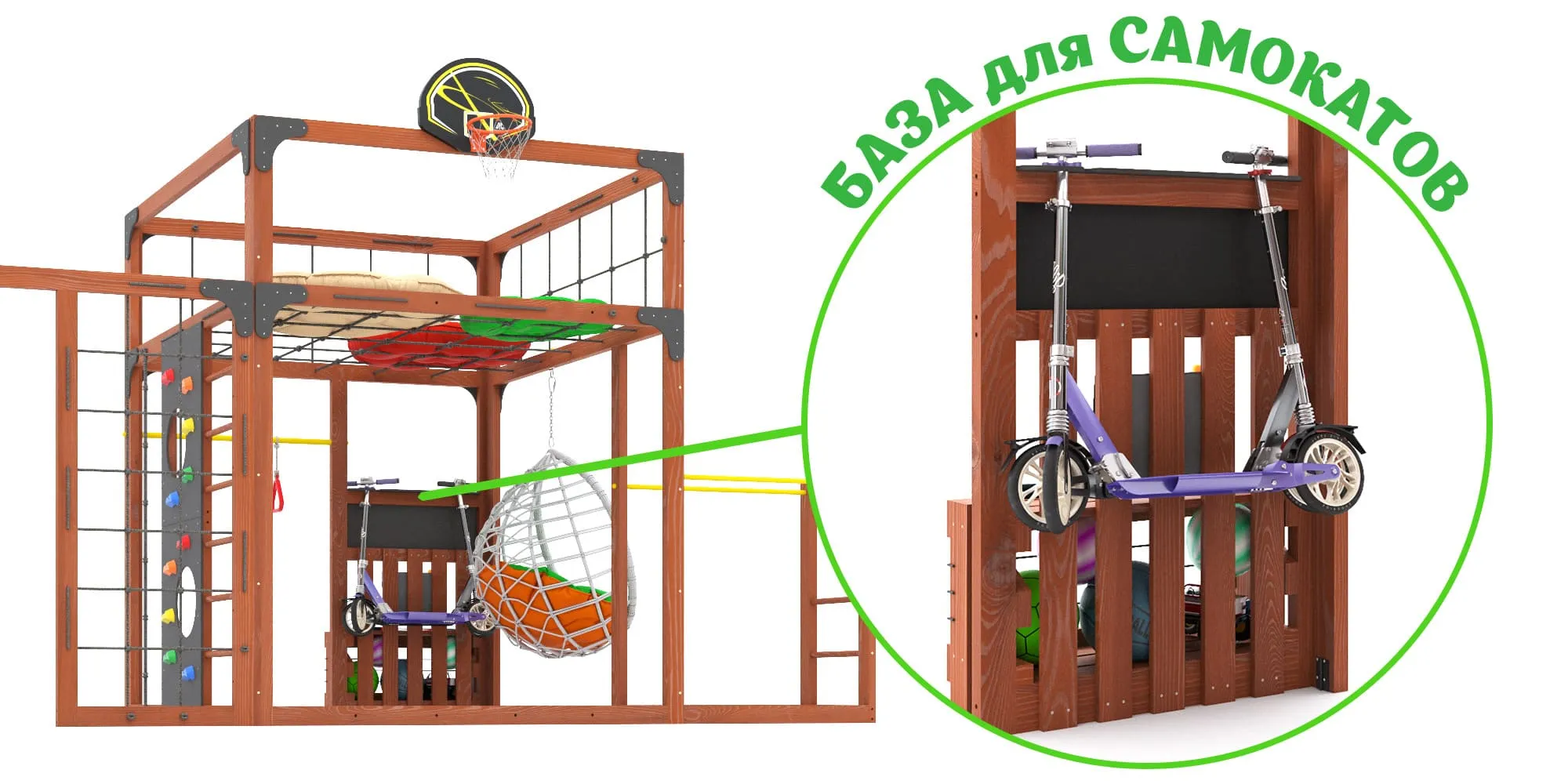 - База для самокатов (на 2 штуки), органайзер и ящик-скамья с резинкой для мячей — всё на своих местах, и ничего не потеряется.