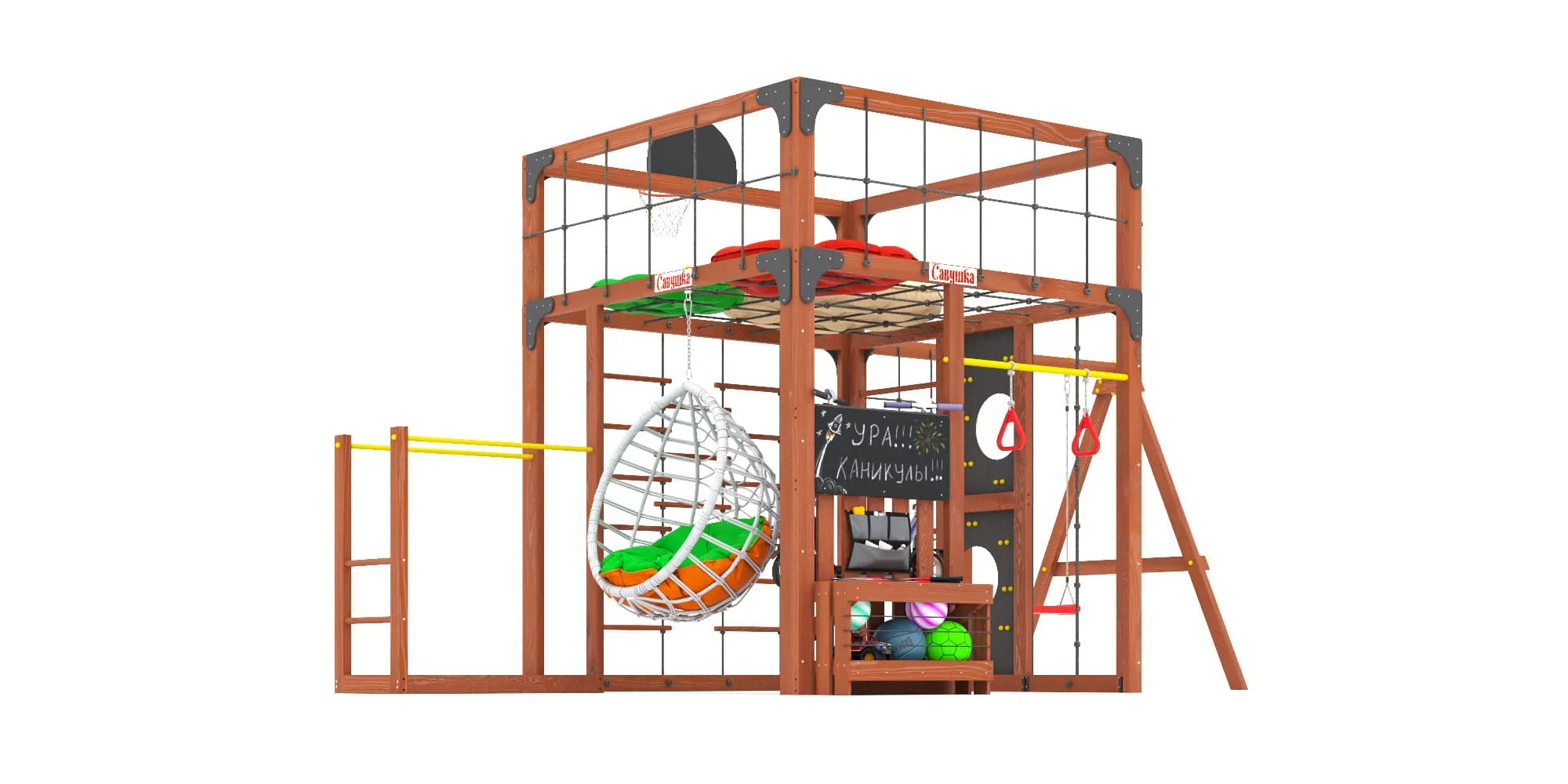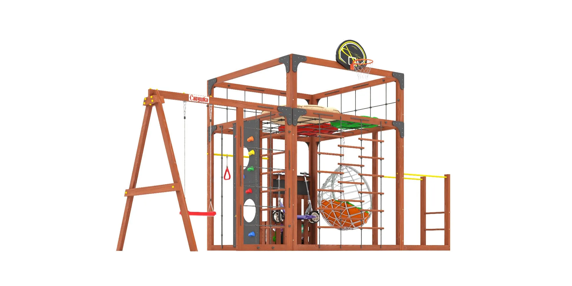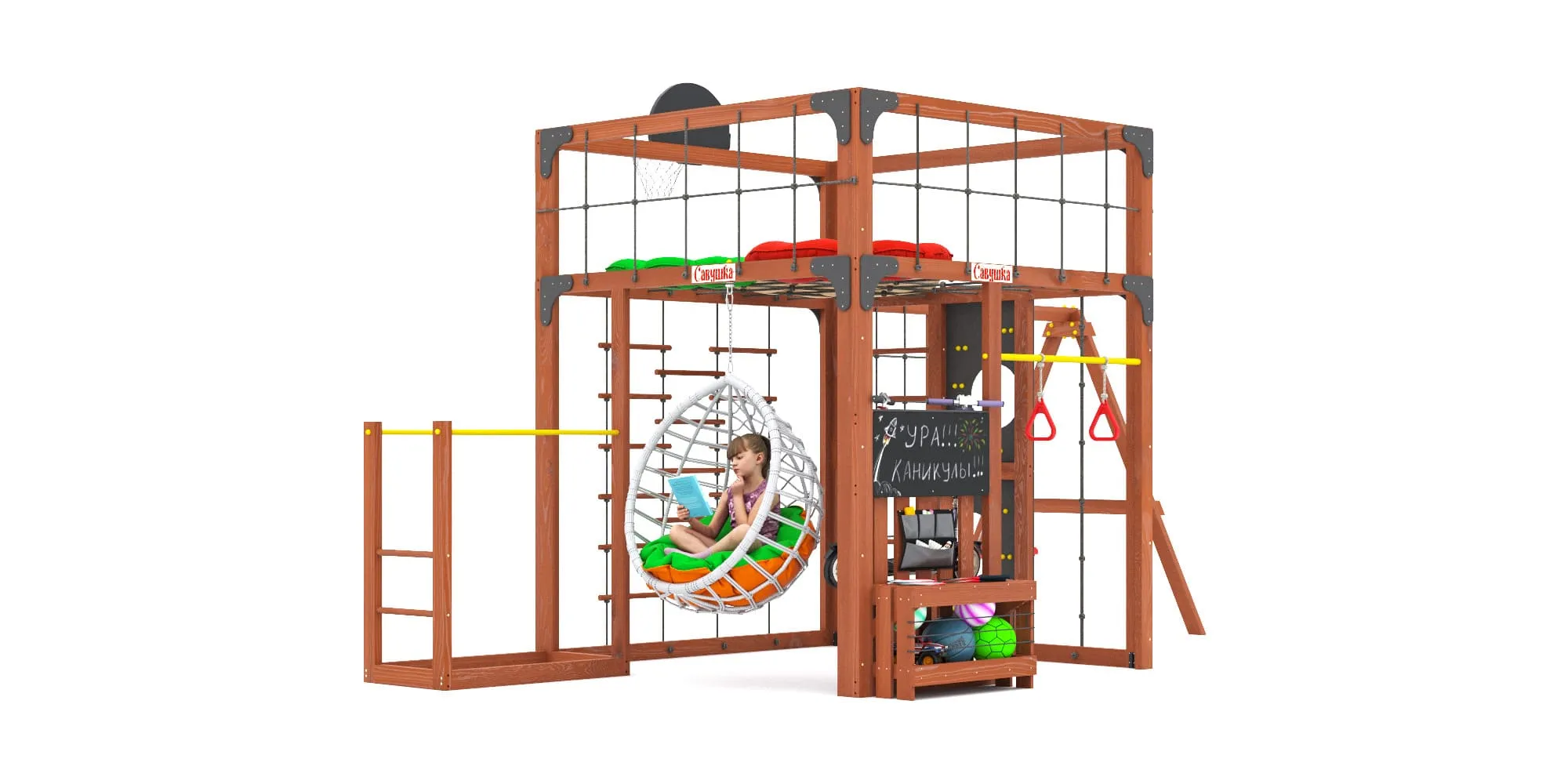 Представляем детскую игровую площадку Савушка КУБ-6 с подушками и коконом в цвете Махагон — инновационный комплекс, объединяющий спорт, игру и отдых для всей семьи. Этот многофункциональный комплекс создан для гармоничного физического развития детей и активного семейного досуга.