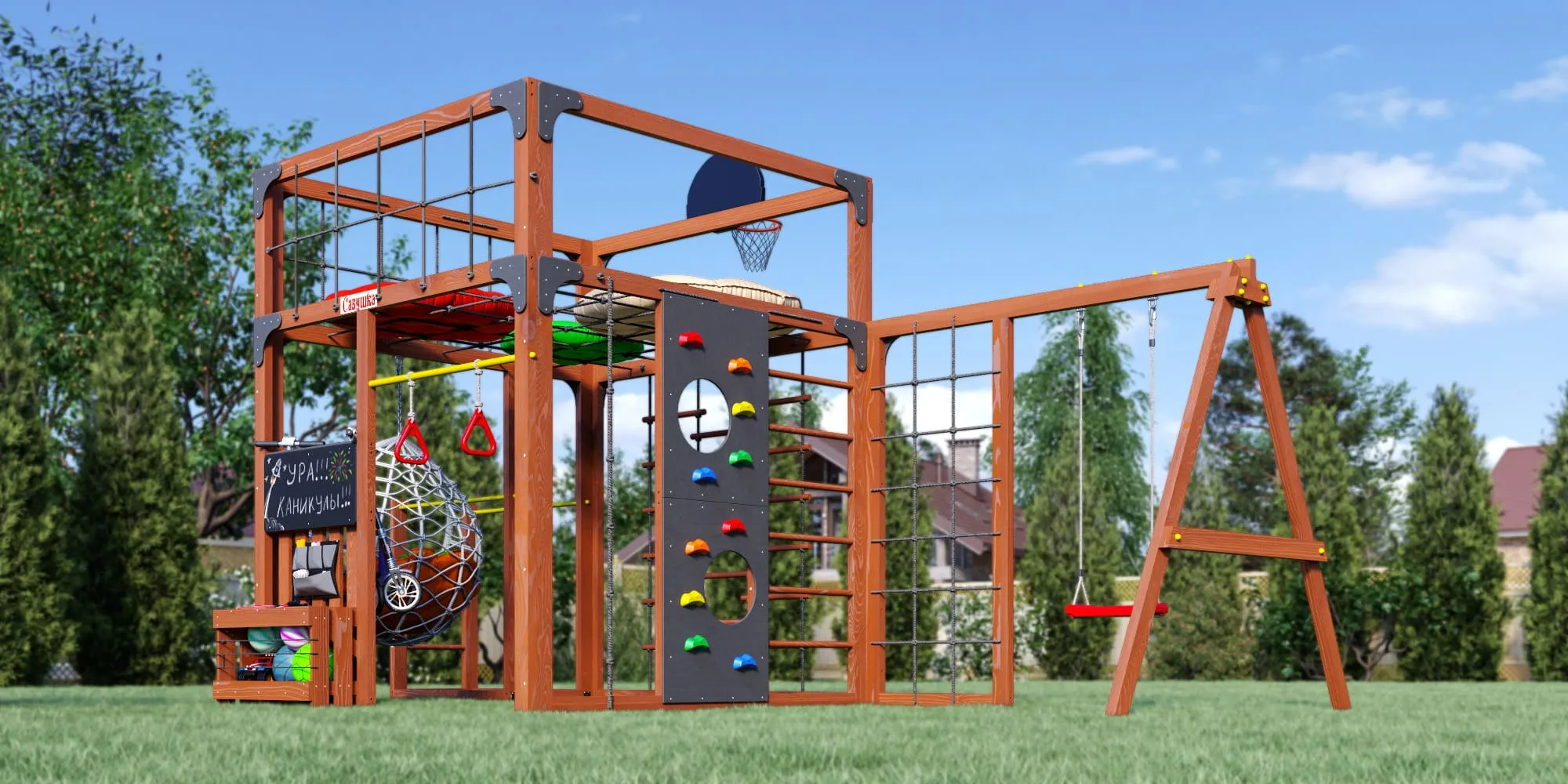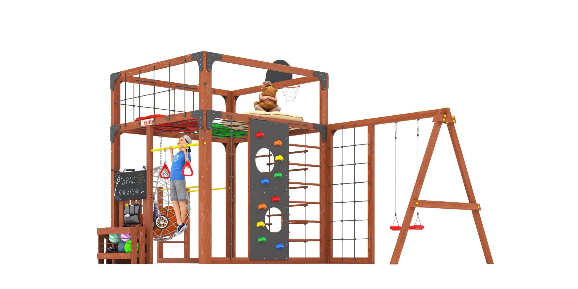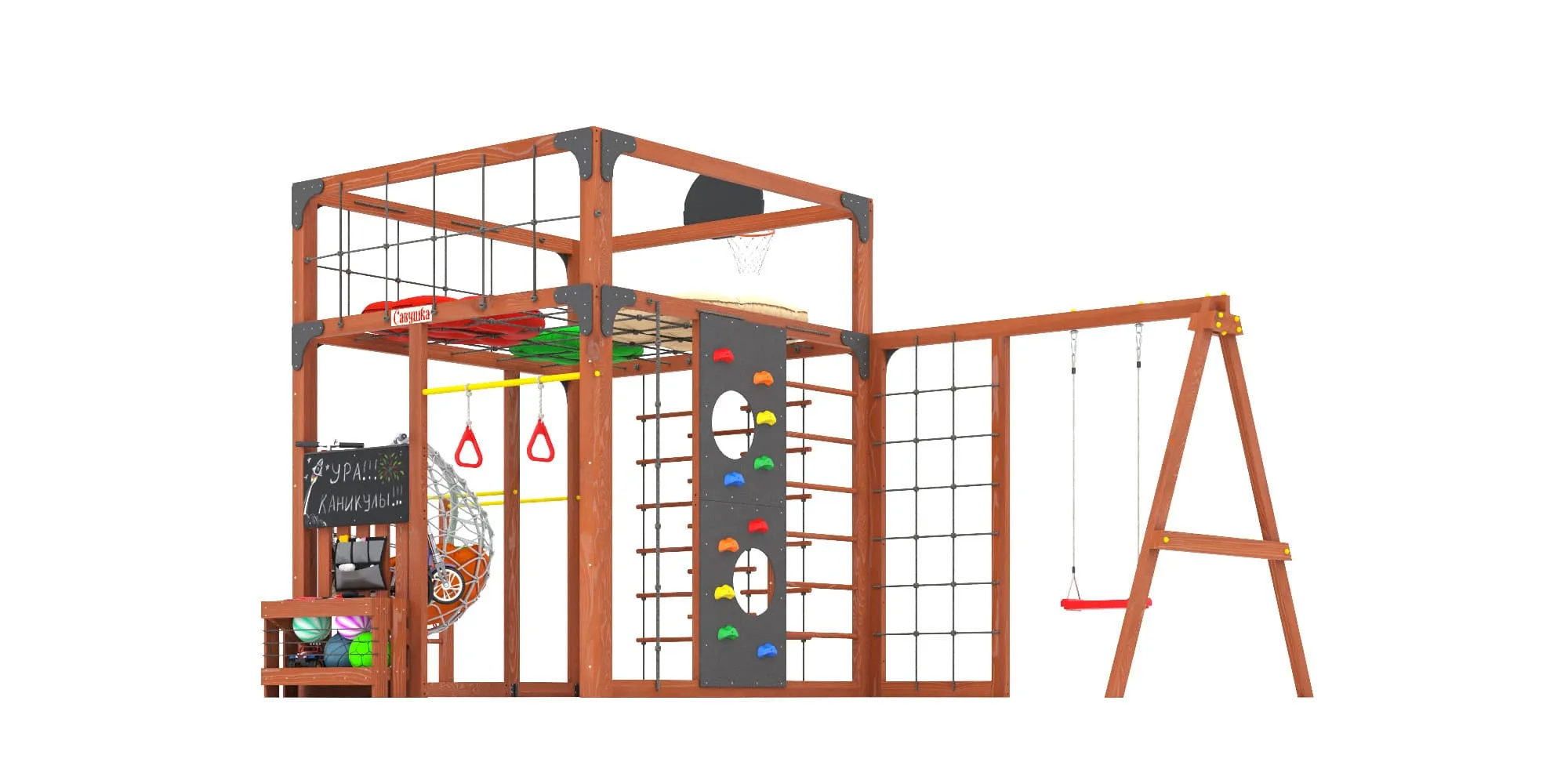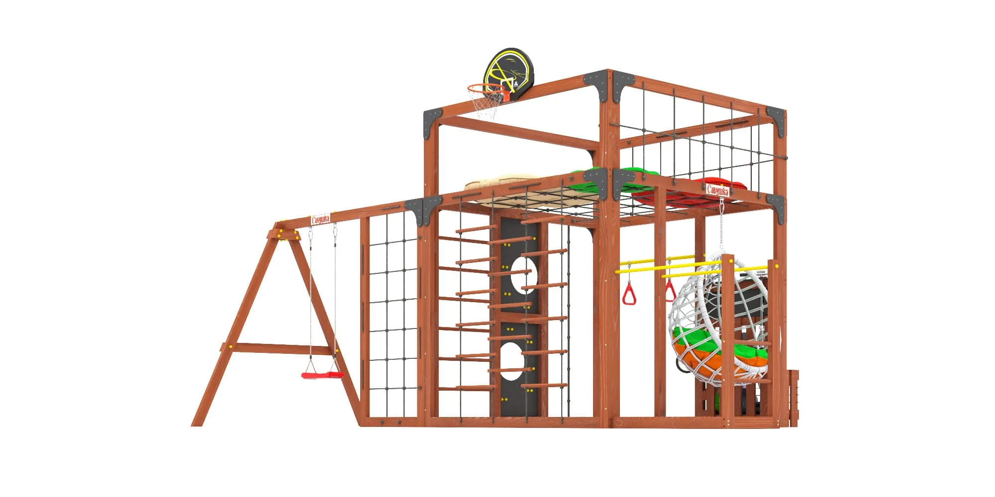 Представляем детскую игровую площадку Савушка КУБ-6 с подушками и коконом в цвете Махагон — инновационный комплекс, объединяющий спорт, игру и отдых для всей семьи. Этот многофункциональный комплекс создан для гармоничного физического развития детей и активного семейного досуга.