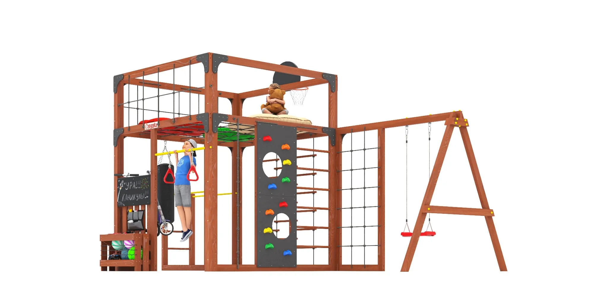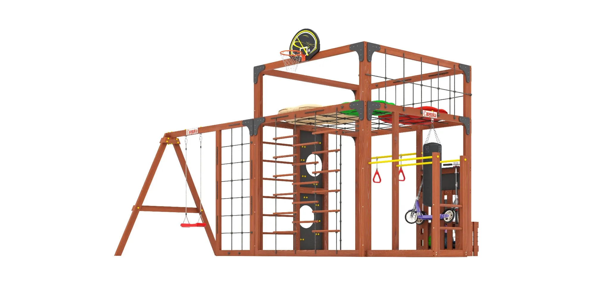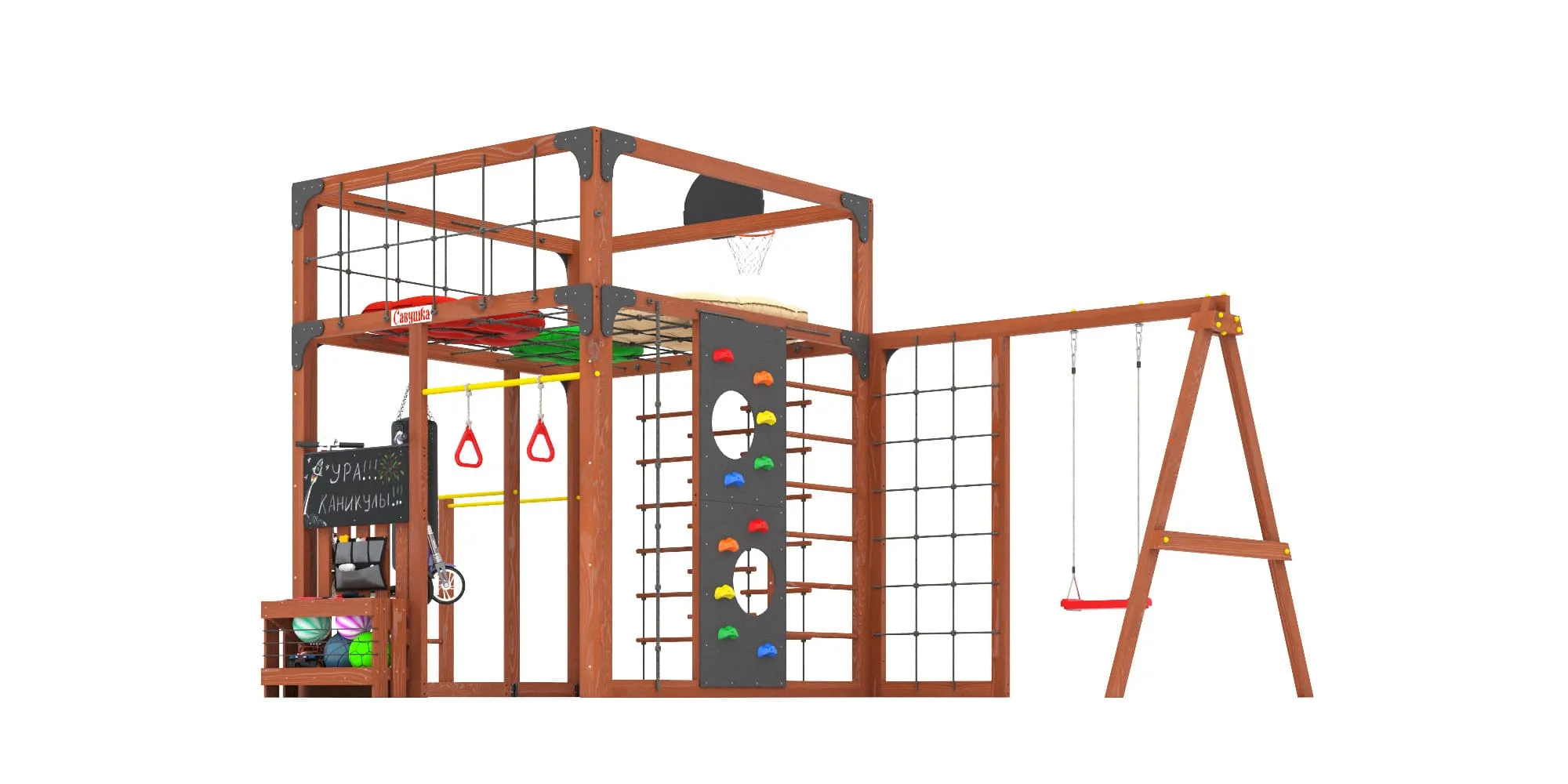 Представляем детскую игровую площадку Савушка КУБ-6 с подушками в цвете Махагон — инновационный комплекс, объединяющий спорт, игру и отдых для всей семьи. Этот многофункциональный комплекс создан для гармоничного физического развития детей и активного семейного досуга.