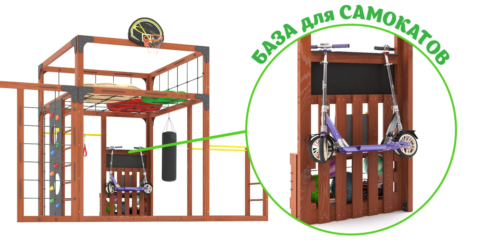 - База для самокатов (на 2 штуки), органайзер и ящик-скамья с резинкой для мячей — всё на своих местах, и ничего не потеряется.