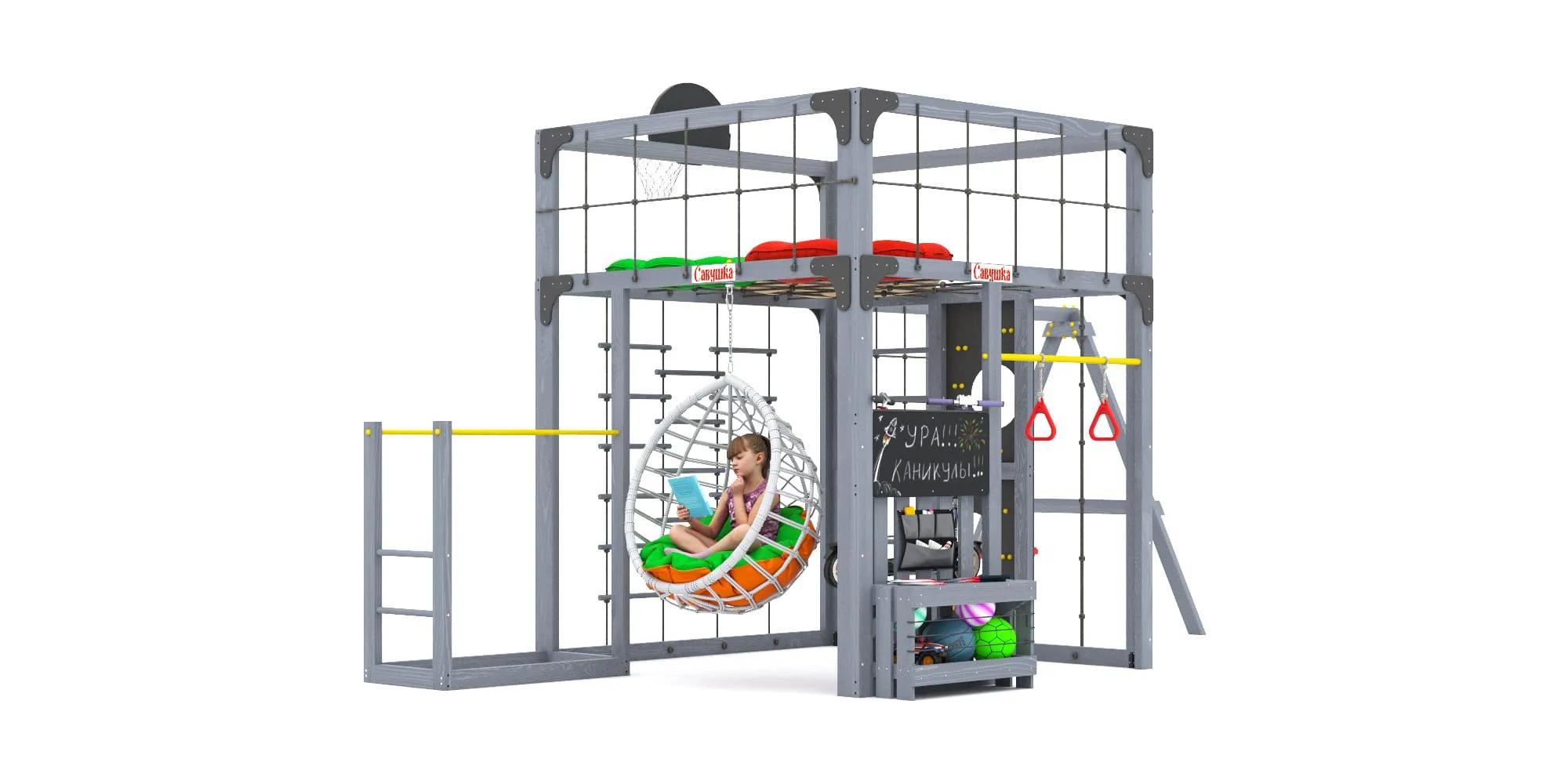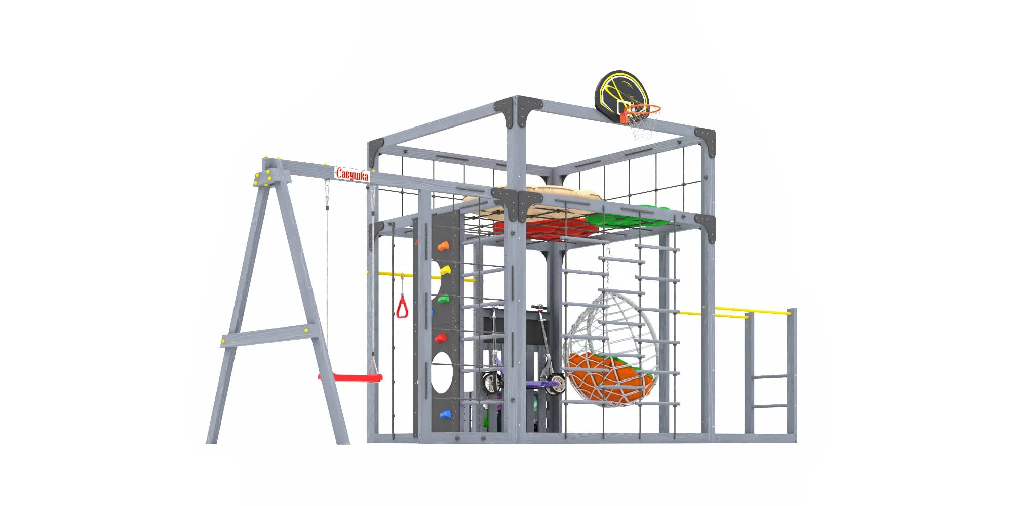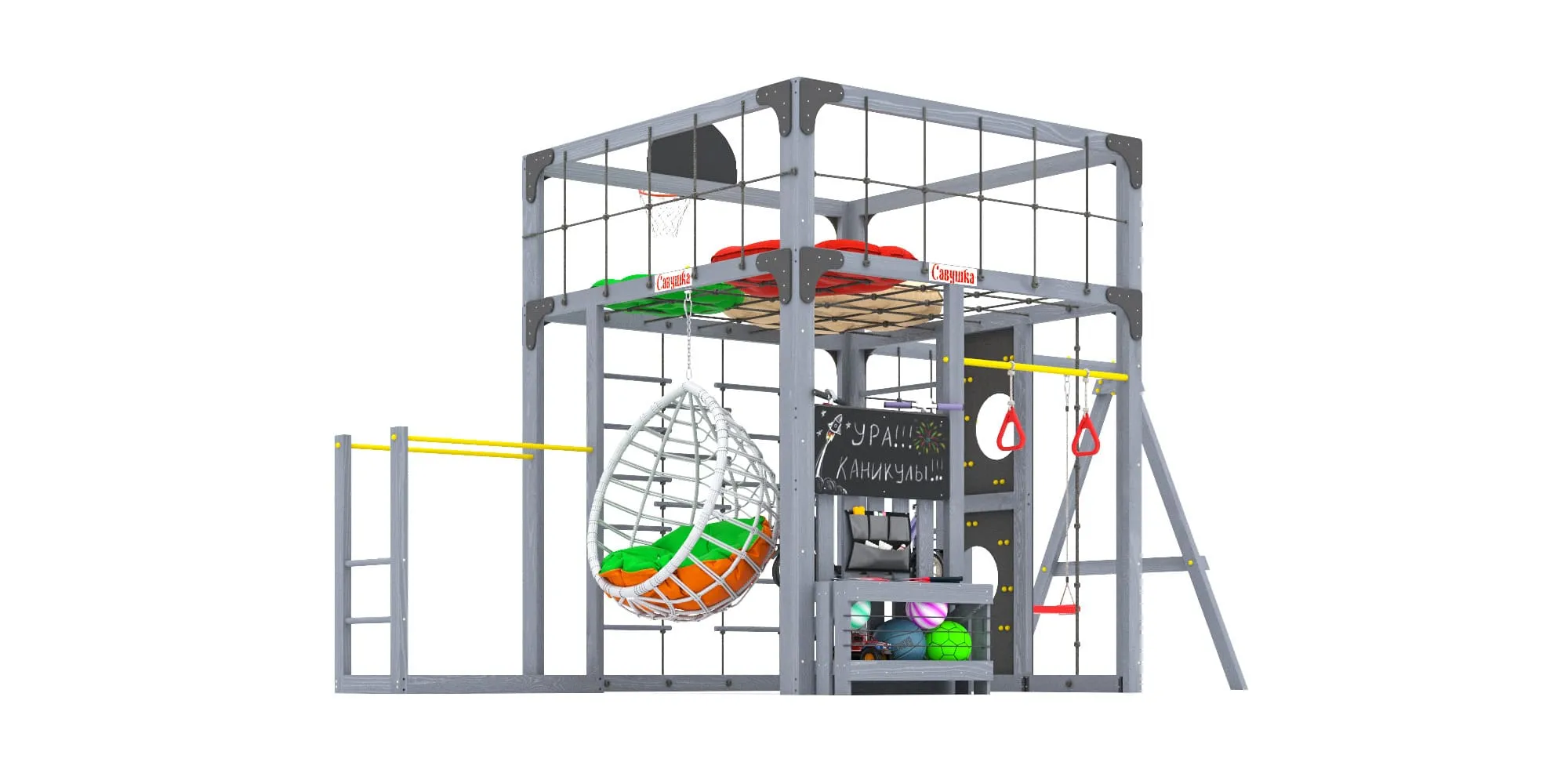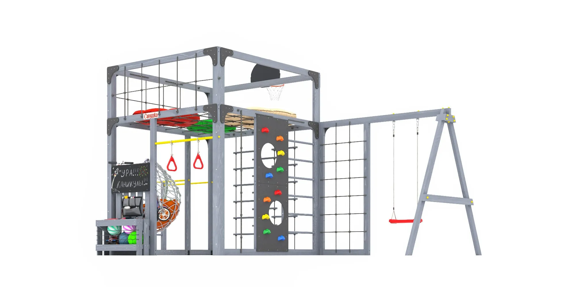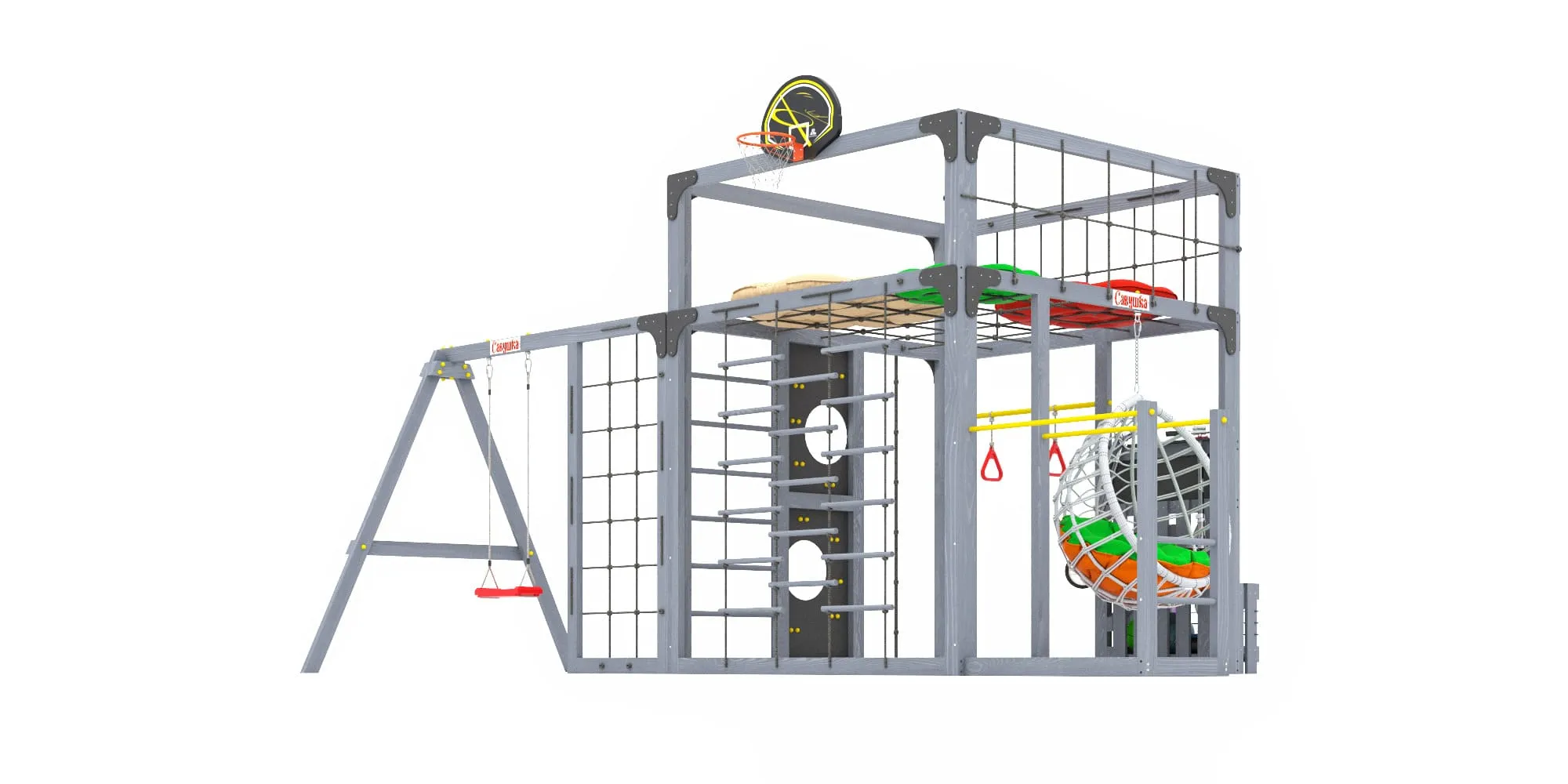 Представляем детскую игровую площадку Савушка КУБ-6 с подушками и коконом в цвете Серый — инновационный комплекс, объединяющий спорт, игру и отдых для всей семьи. Этот многофункциональный комплекс создан для гармоничного физического развития детей и активного семейного досуга.