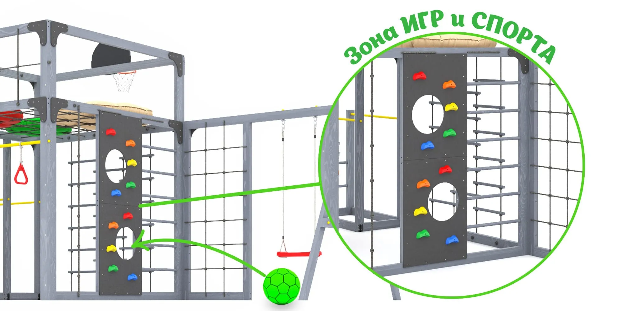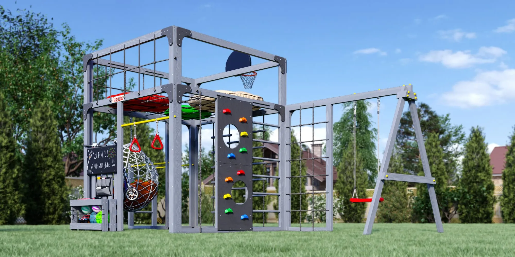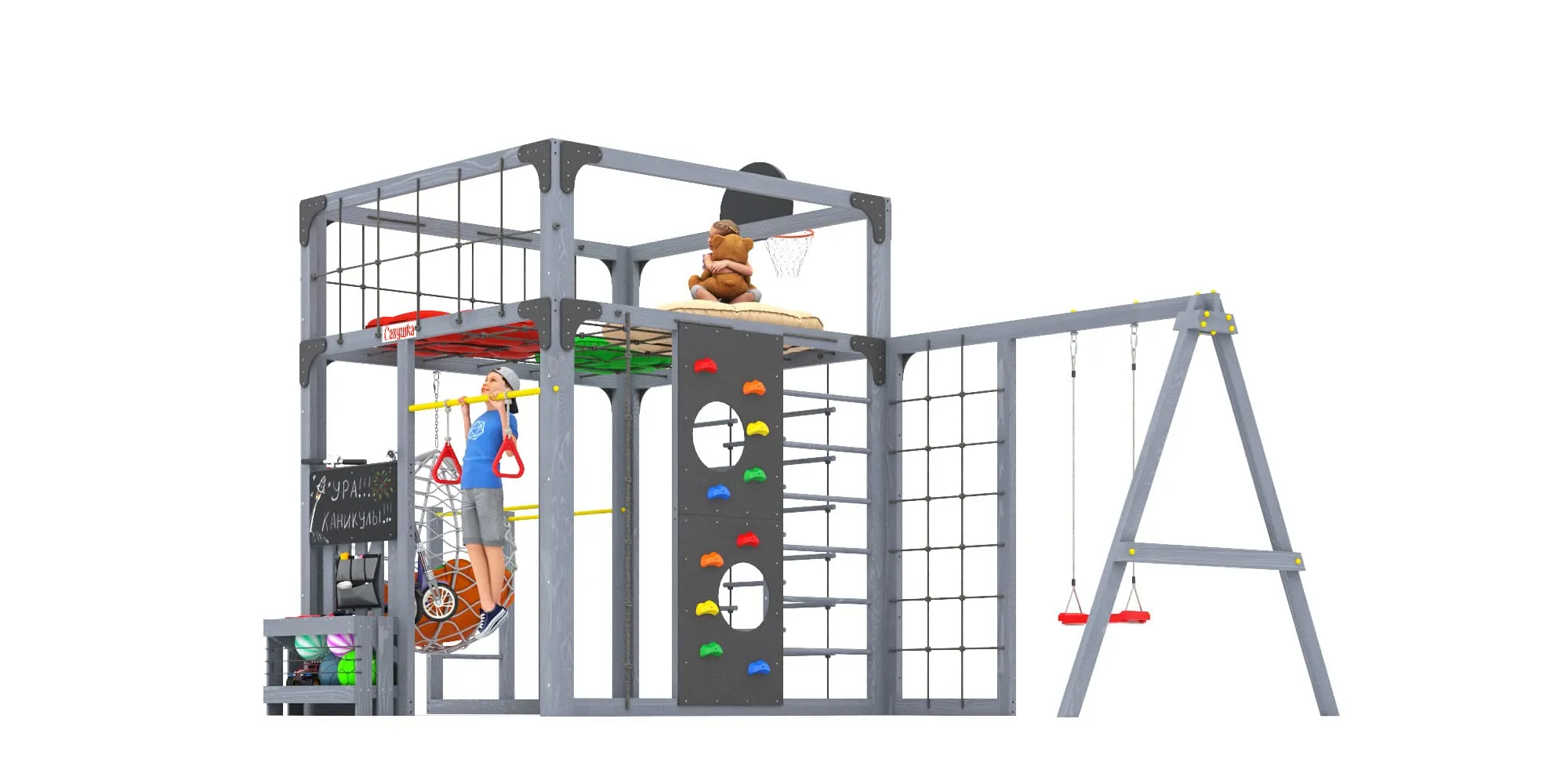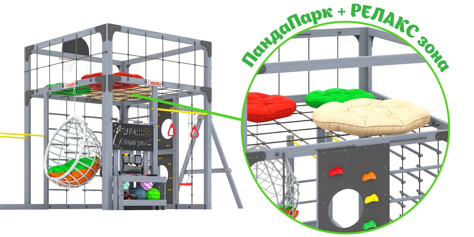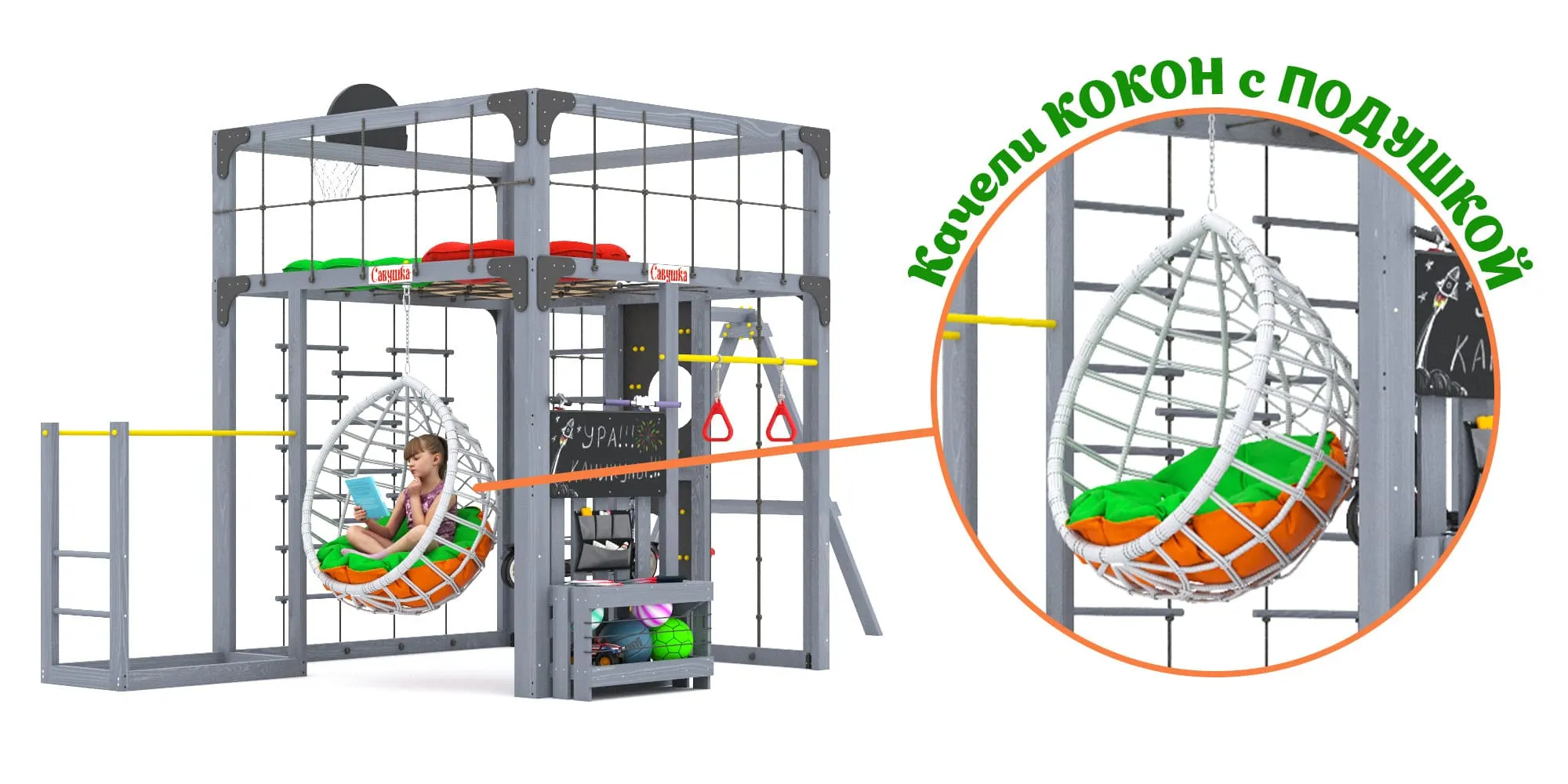 Представляем детскую игровую площадку Савушка КУБ-6 с подушками и коконом в цвете Серый — инновационный комплекс, объединяющий спорт, игру и отдых для всей семьи. Этот многофункциональный комплекс создан для гармоничного физического развития детей и активного семейного досуга.