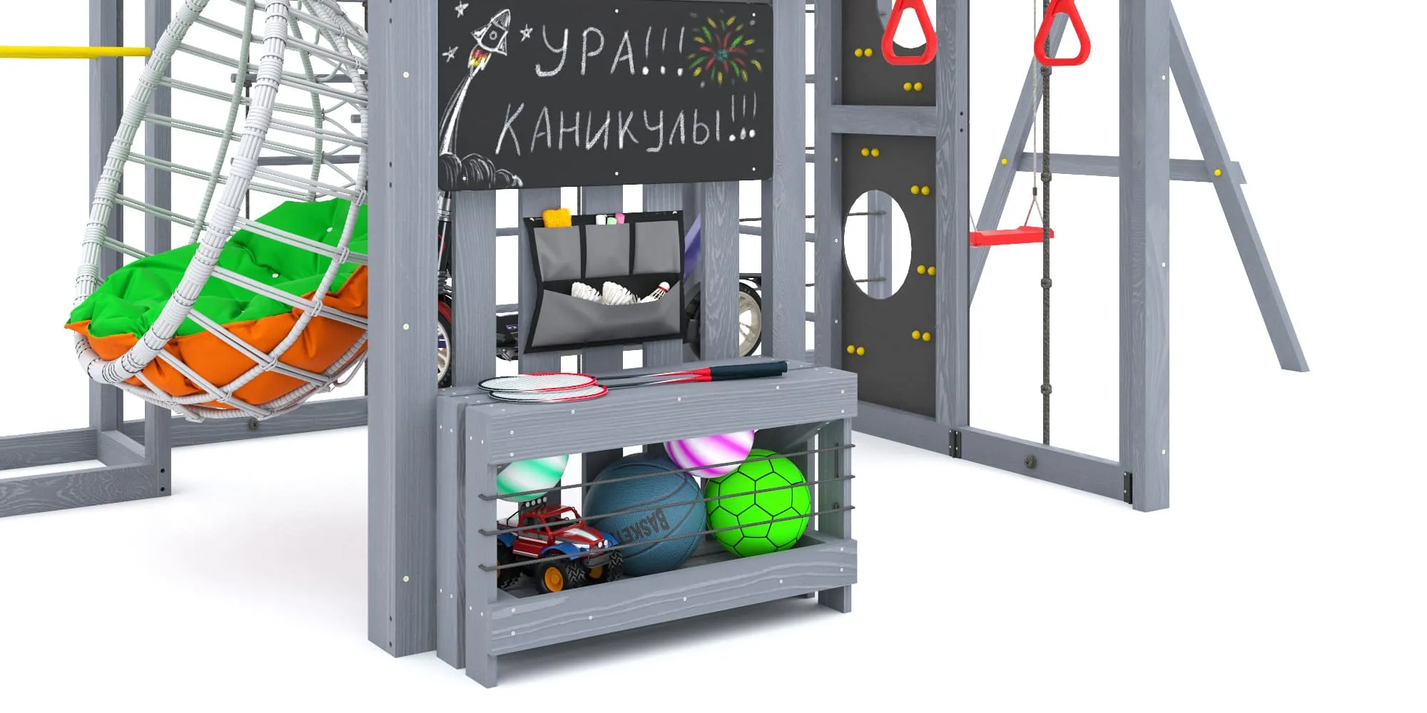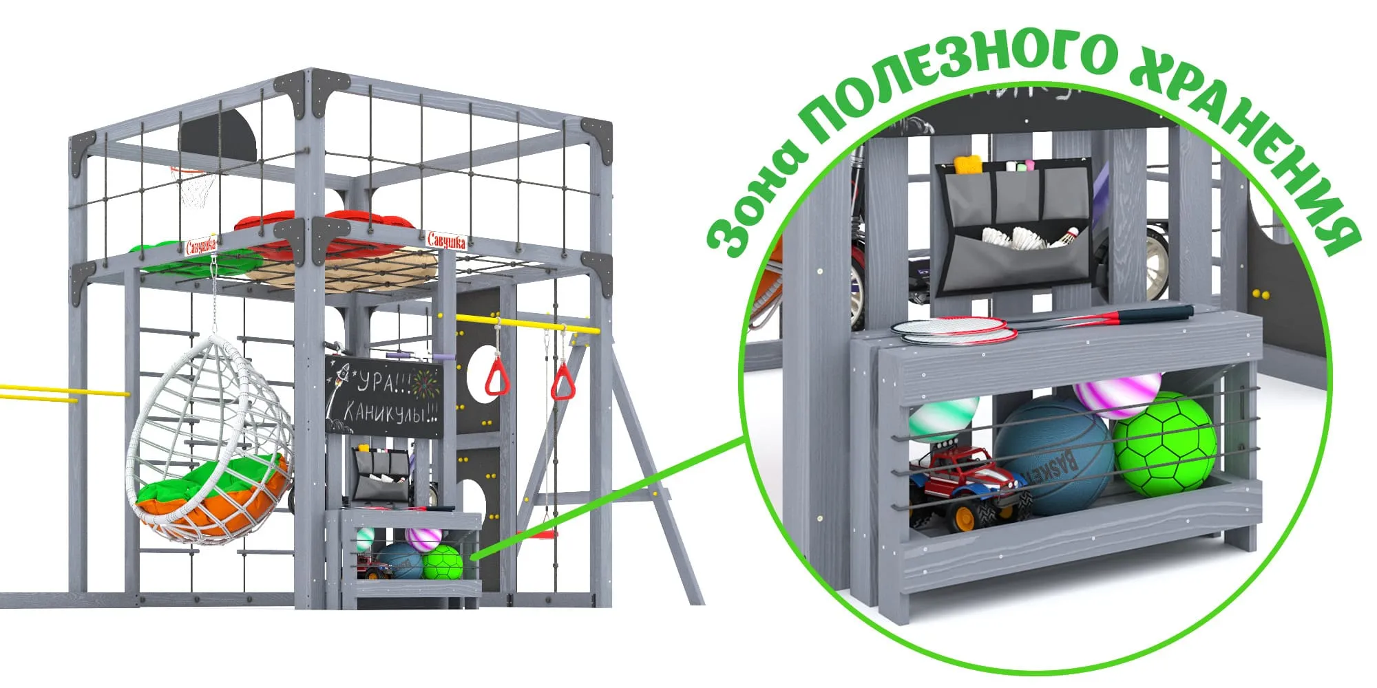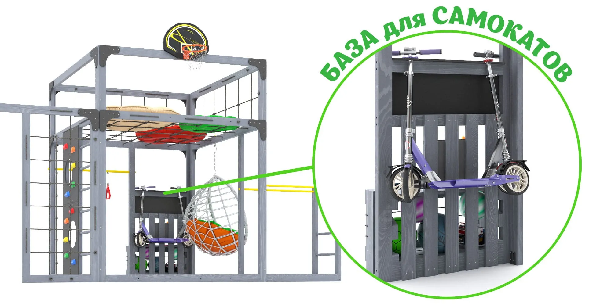 - База для самокатов (на 2 штуки), органайзер и ящик-скамья с резинкой для мячей — всё на своих местах, и ничего не потеряется.
