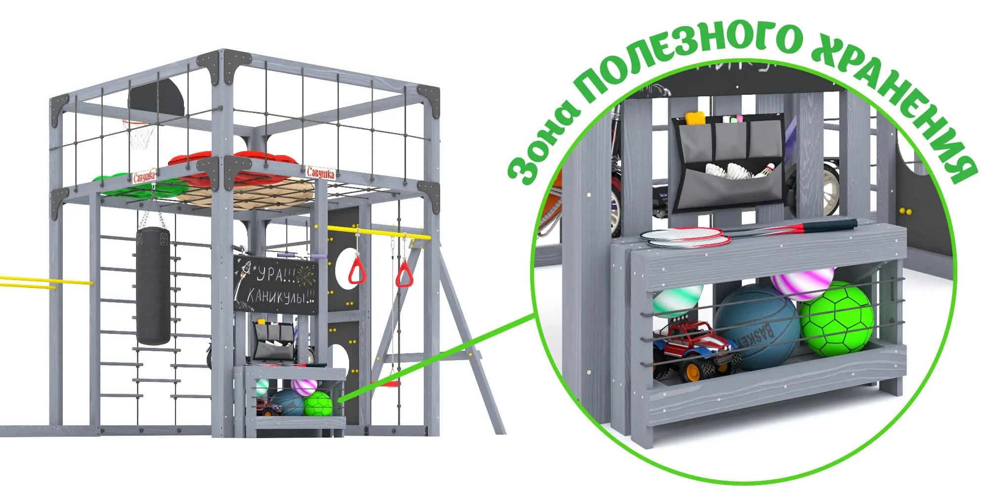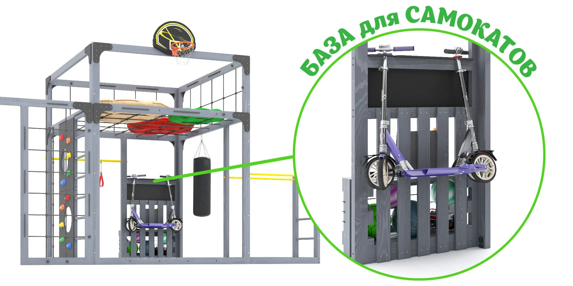 - База для самокатов (на 2 штуки), органайзер и ящик-скамья с резинкой для мячей — всё на своих местах, и ничего не потеряется.