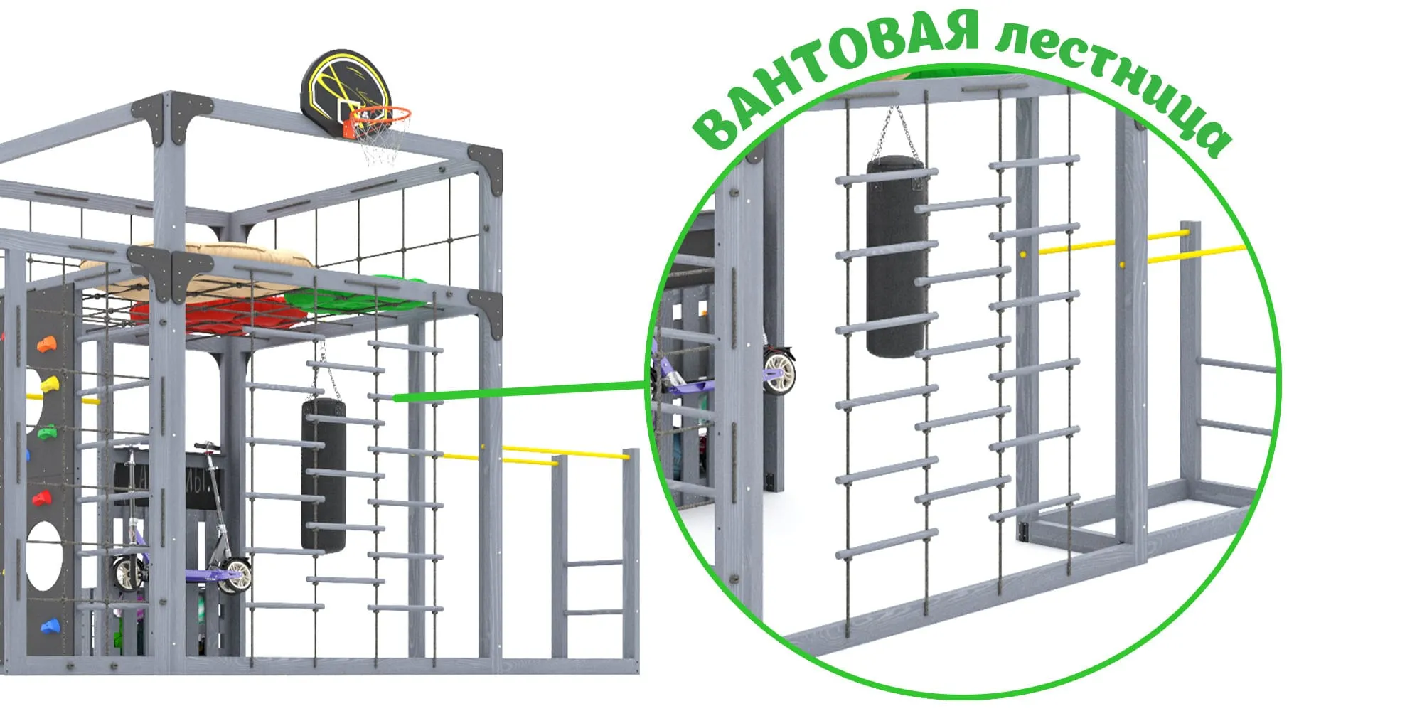 Вантовая лестница — лестница из прочных канатов и перекладин развивает равновесие, силу рук и уверенность в движении.