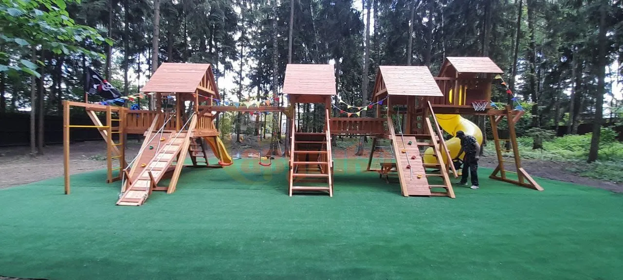 Каркас из клеёного бруса 130×90 мм, прочные узлы и сертифицированная краска в два слоя. Всё соответствует ГОСТ и выдерживает любые нагрузки. Безопасность — без компромиссов: все крепежи закрыты заглушками, углы скруглены.