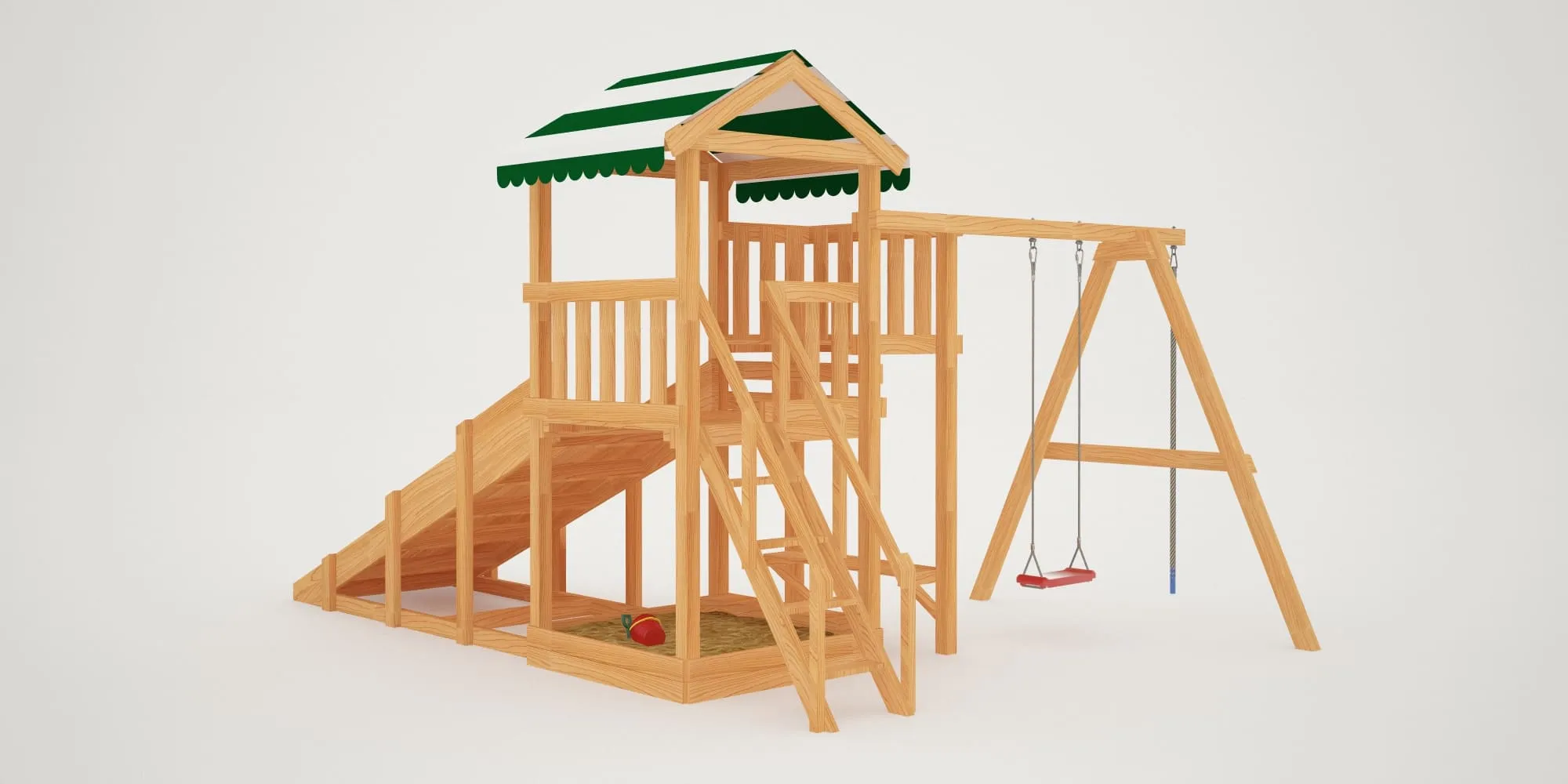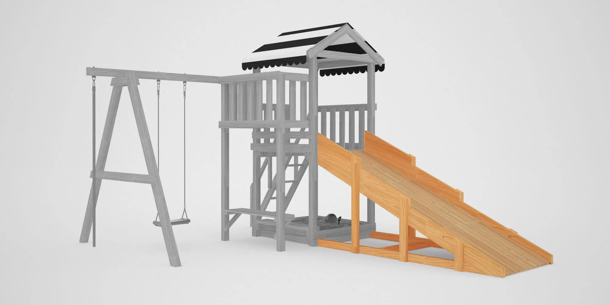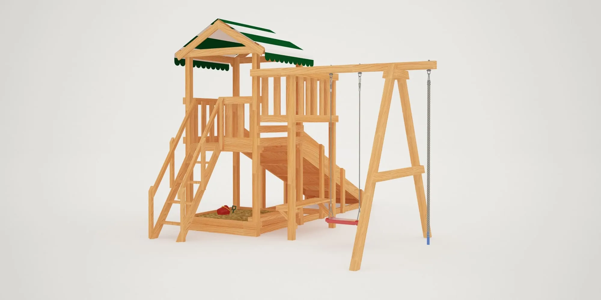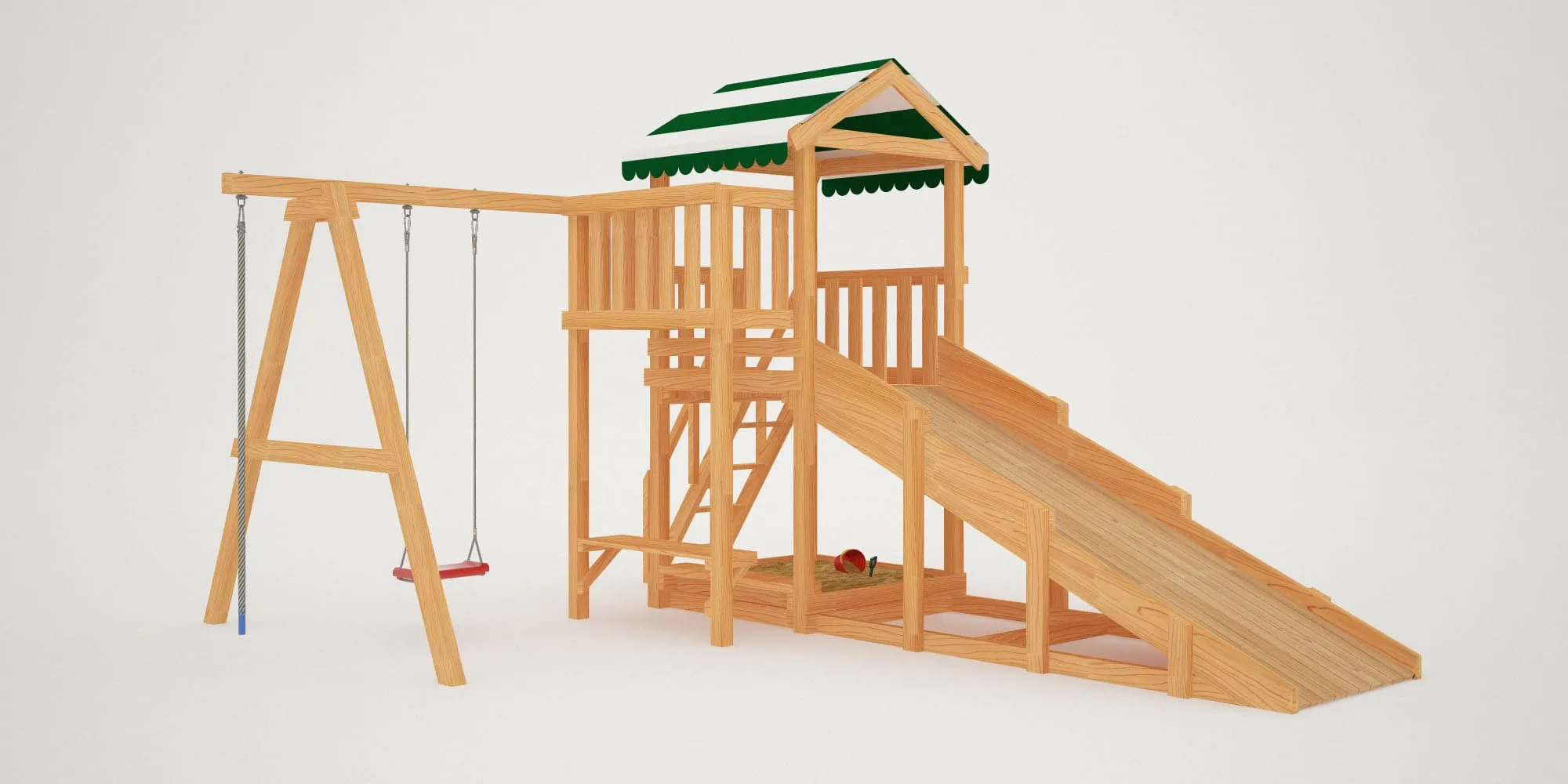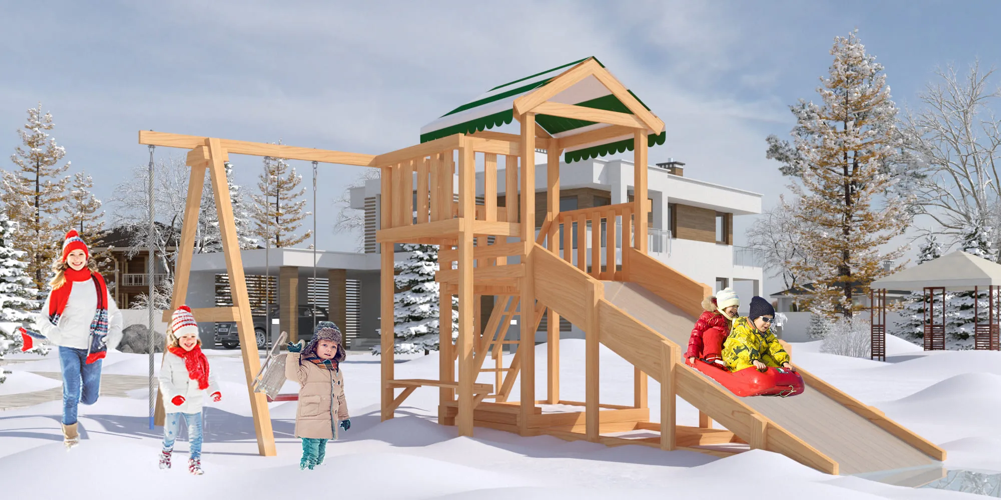 - Всесезонное использование: летом — горка и качели, зимой — скат для тюбинга.