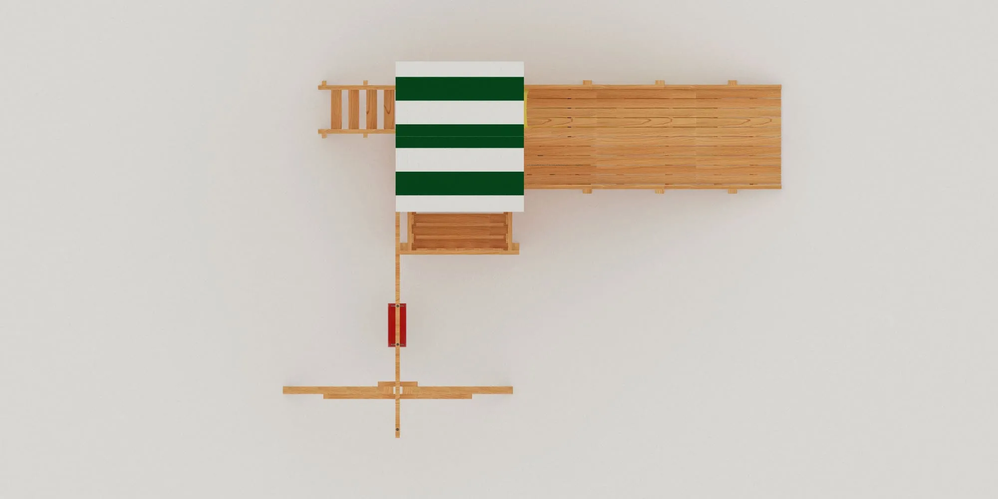 Каркас выполнен из клеёного бруса 75×75 мм — прочного, надёжного, устойчивого к деформации. Все детали тщательно отшлифованы, углы скруглены, болты закрыты заглушками. Конструкция соответствует ГОСТ и полностью безопасна.
