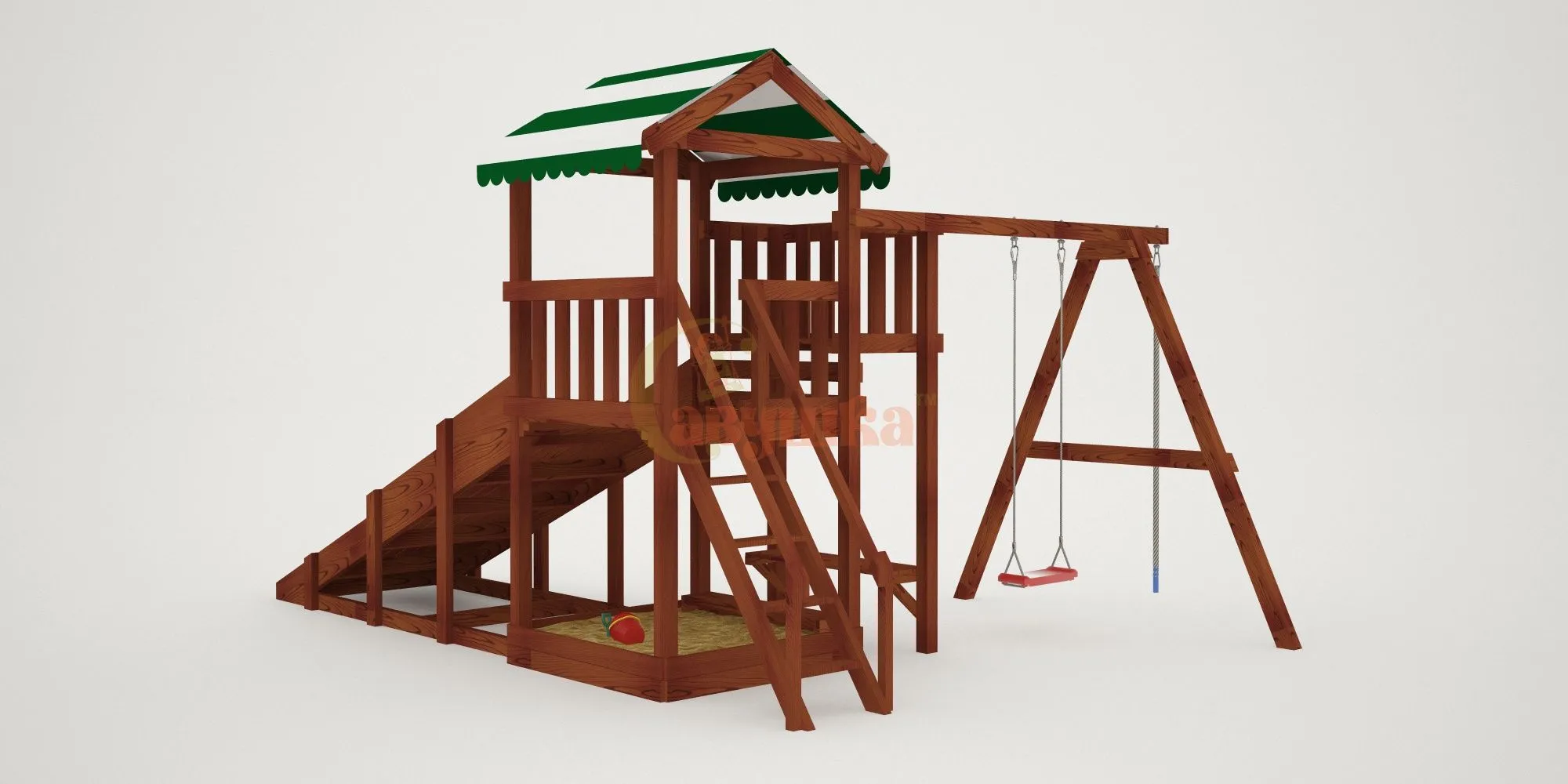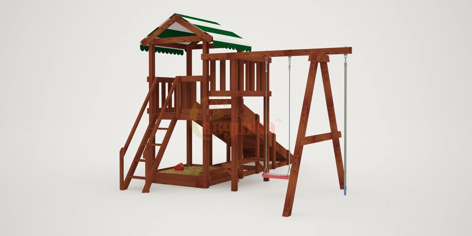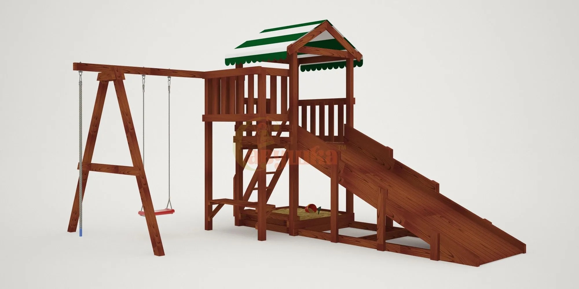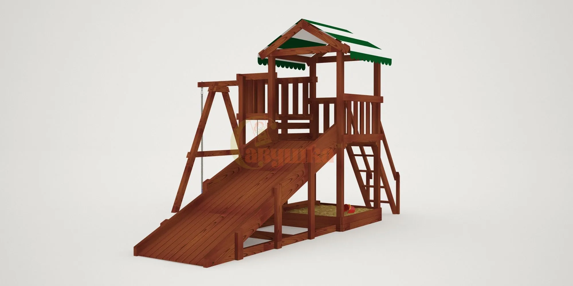 - Всесезонное использование: летом — горка и качели, зимой — скат для тюбинга.