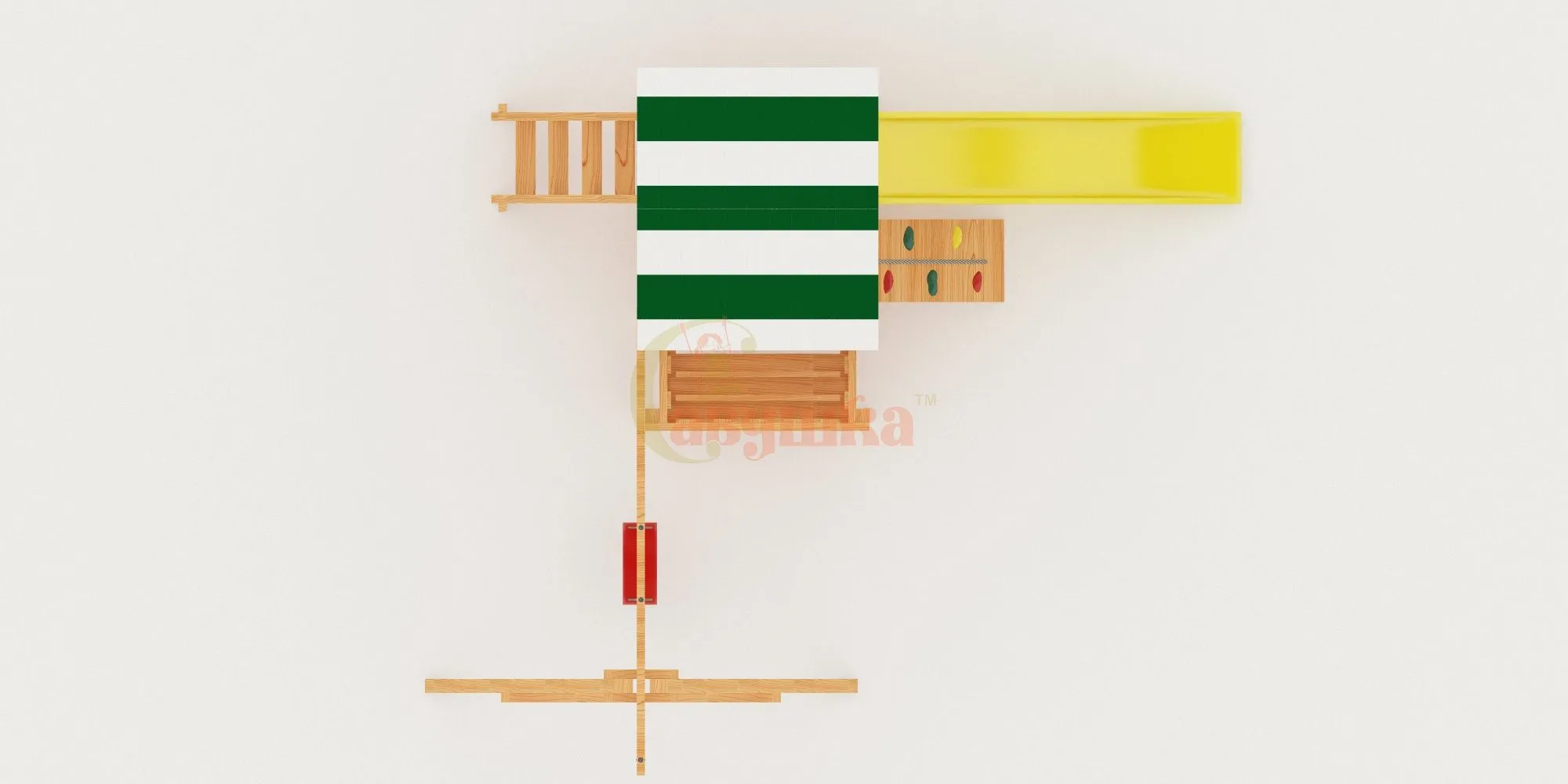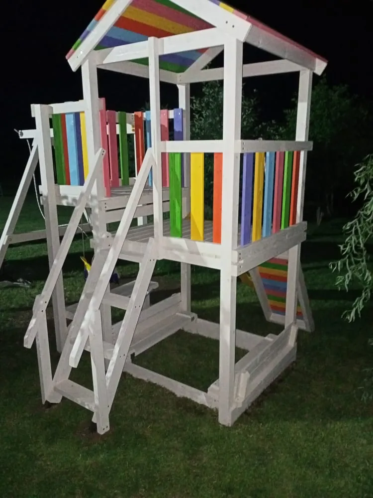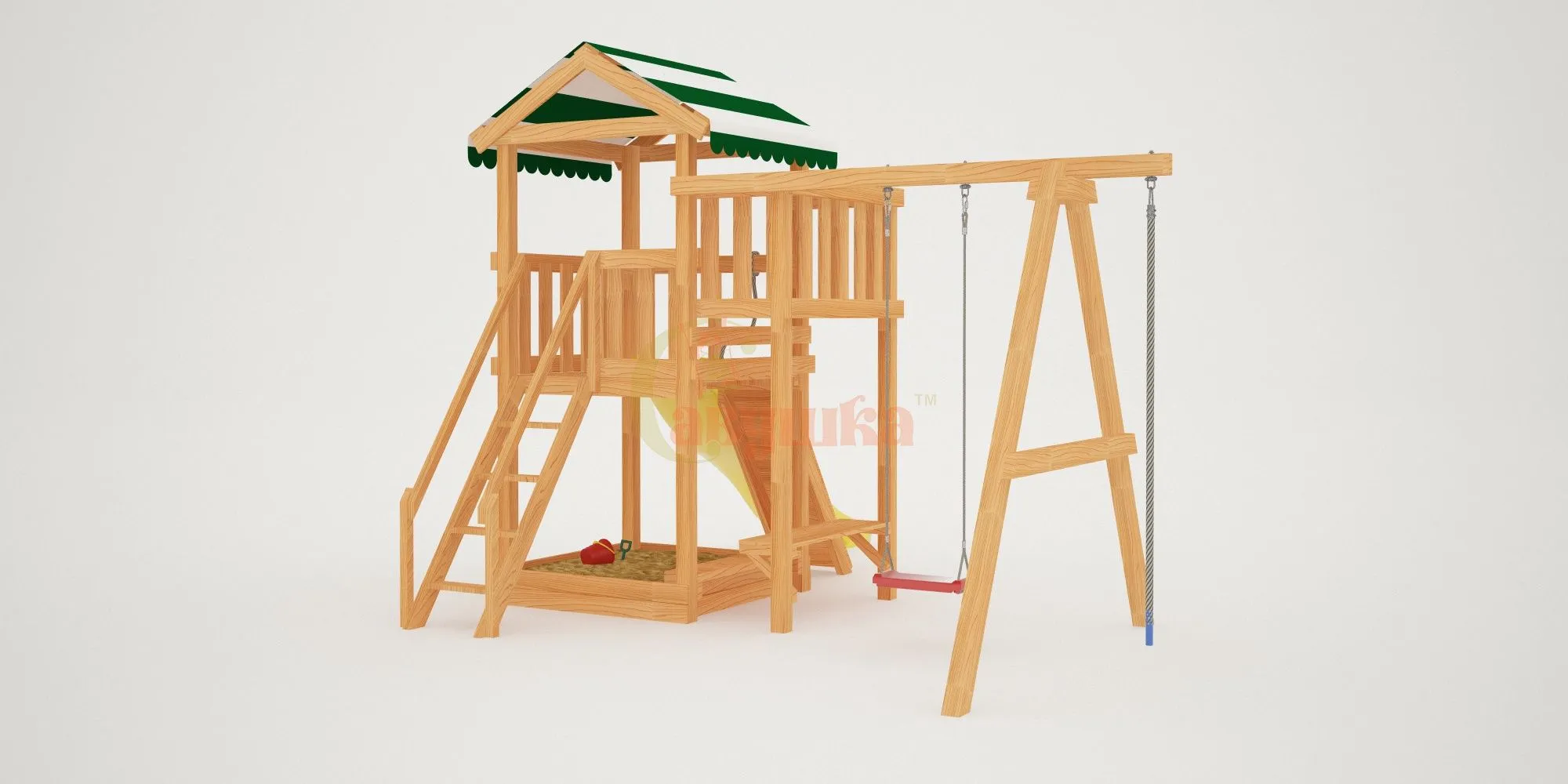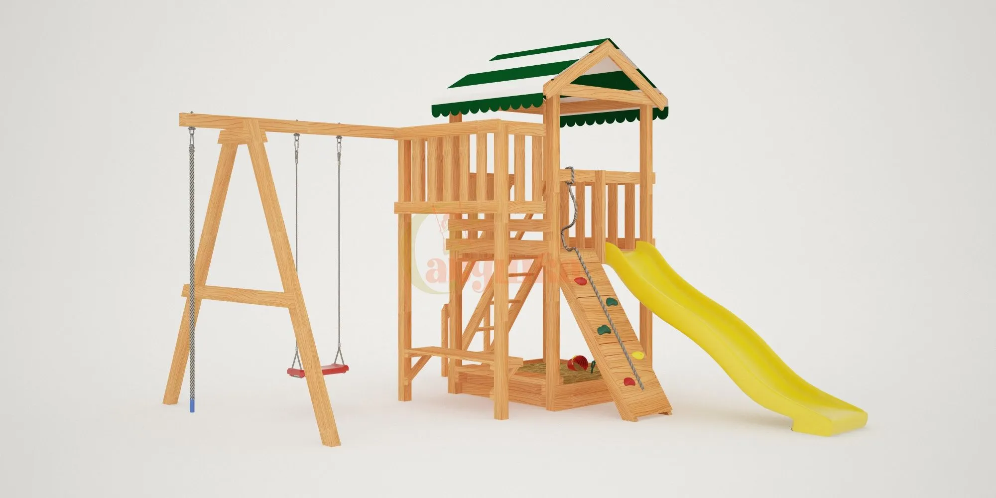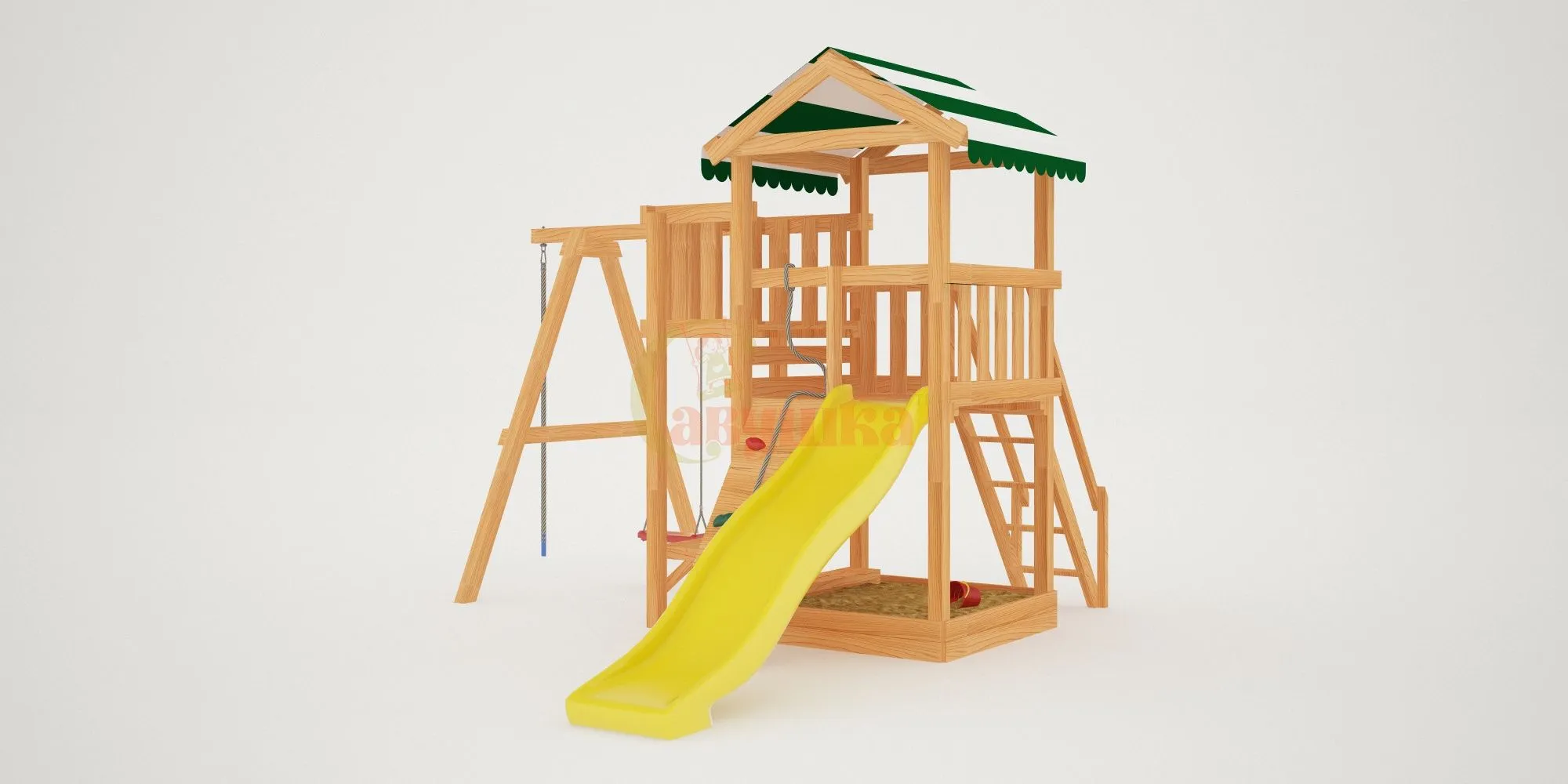 Также в модели есть еще один дополнительный канат для полноценного лазания – он расположен слева от качелей. Для любителей более спокойных игр предусмотрена песочница с удобной лавочкой для игральных принадлежностей. ВАЖНО: Комплекс поставляется без окрашивания и отверстий для крепежа, но его сборка, как правило, не представляет трудности для опытного хозяина. Для разметки отверстий в комплект входит лекало.
