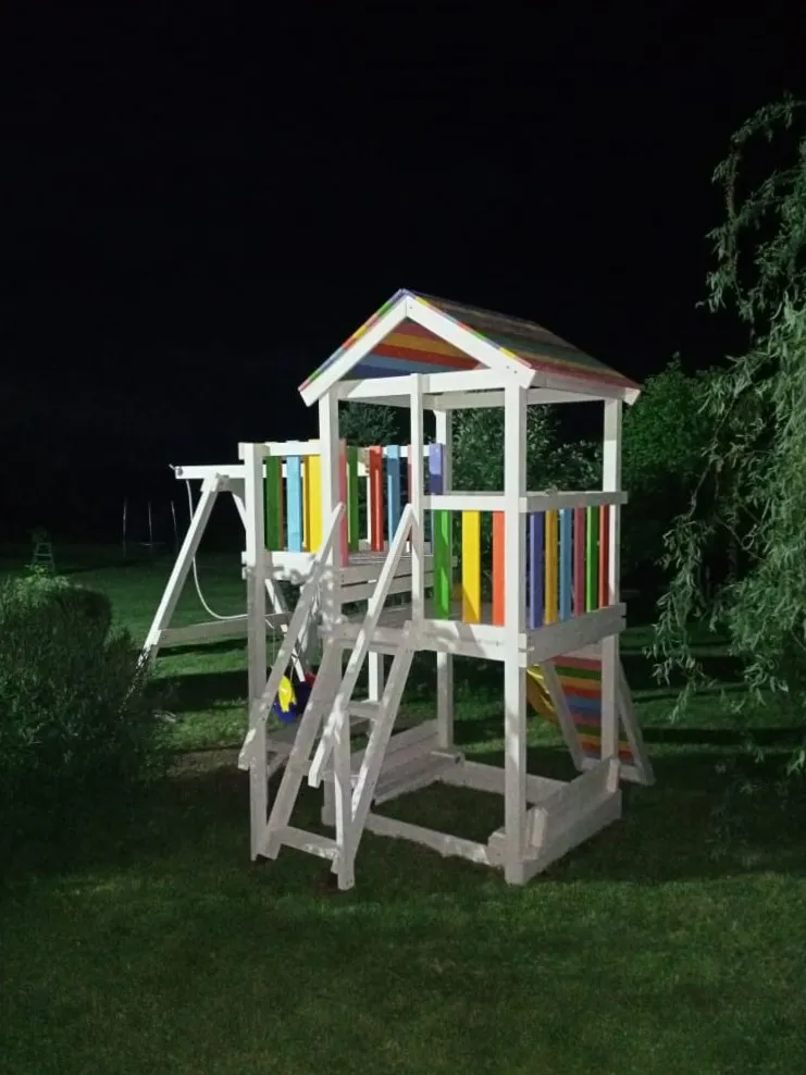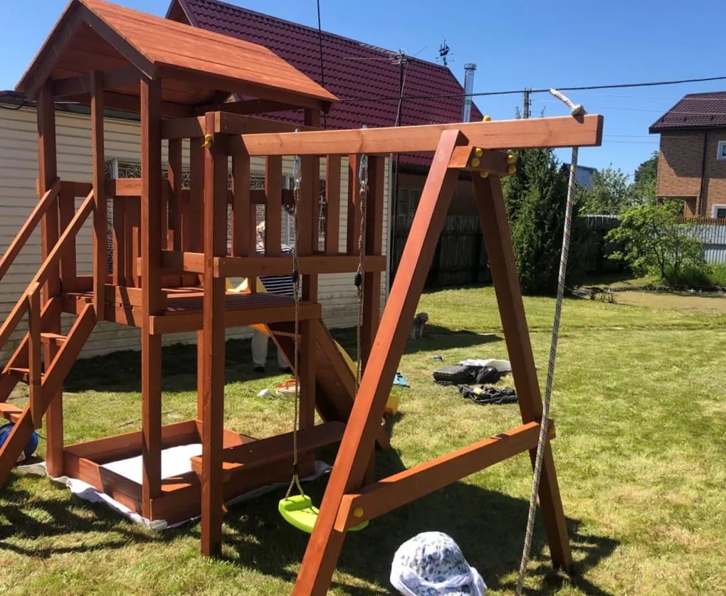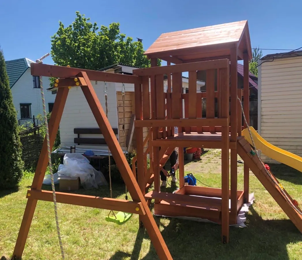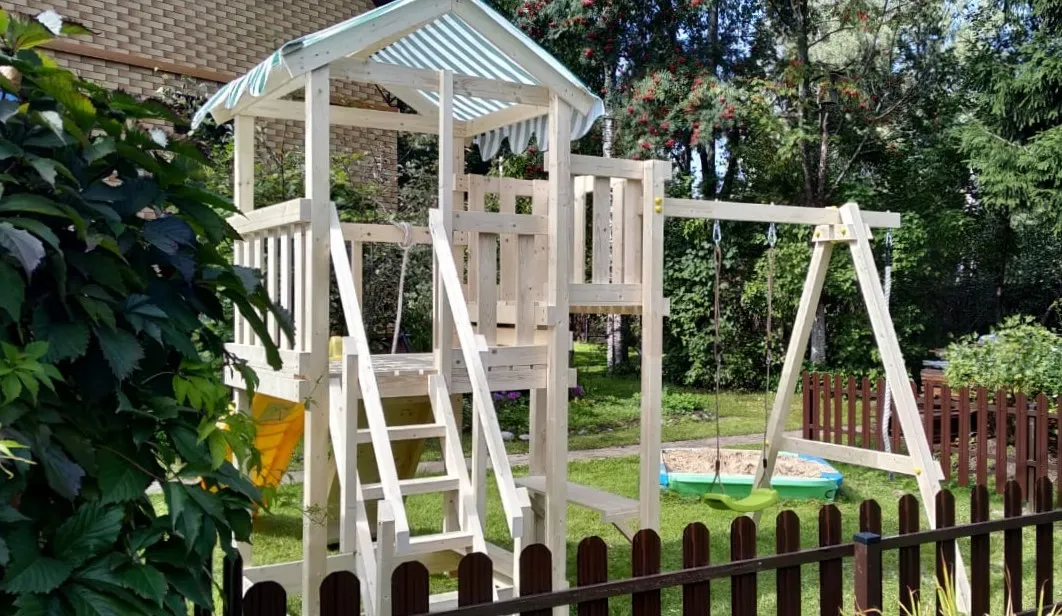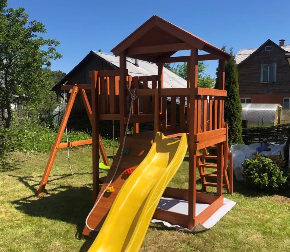 Основным материалом выступает клееный брус сечением 75х75 мм. Он не меняет свою геометрию со временем, благодаря чему игровые комплексы долго остаются надежными. Качество дерева отвечает высоким требованиям ГОСТ. Пластиковые заглушки закрывают металлический крепеж, а шлифованные детали защищают малышей от заноз. Не меньшее внимание мы уделили навесному оборудованию – поставщиком игровых и спортивных элементов конструкции является проверенный бельгийский производитель.