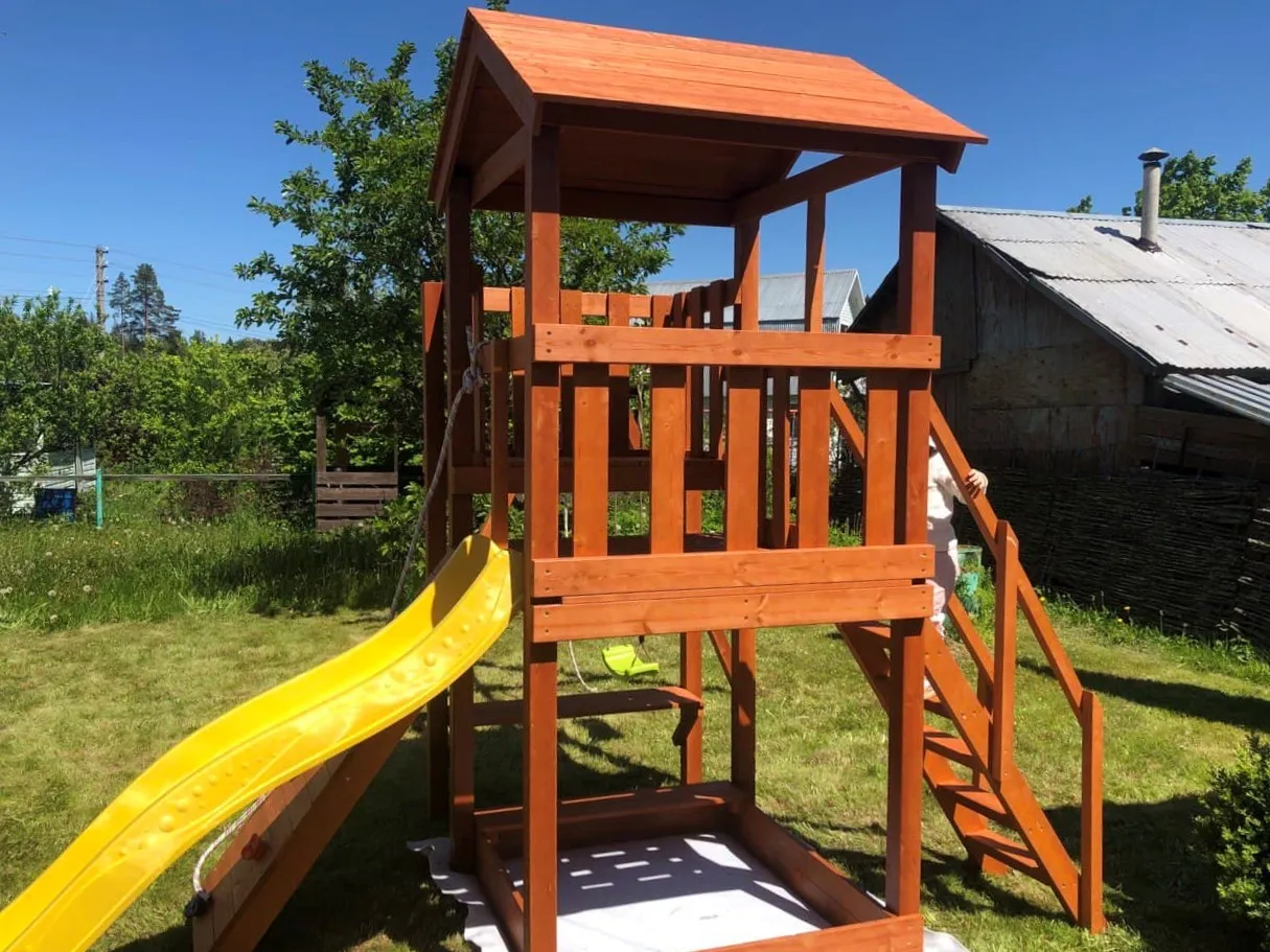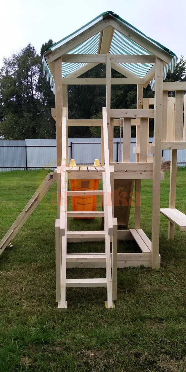 Всепогодная модель Савушка Мастер 1 обладает натуральным цветом дерева без покрытия и модульной конструкцией. Одновременно на площадке могут играть несколько детей. Основа конструкции – игровая башня с балкончиком и яркой пластиковой горкой.