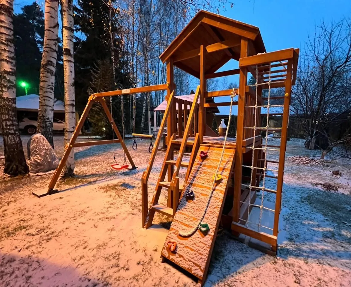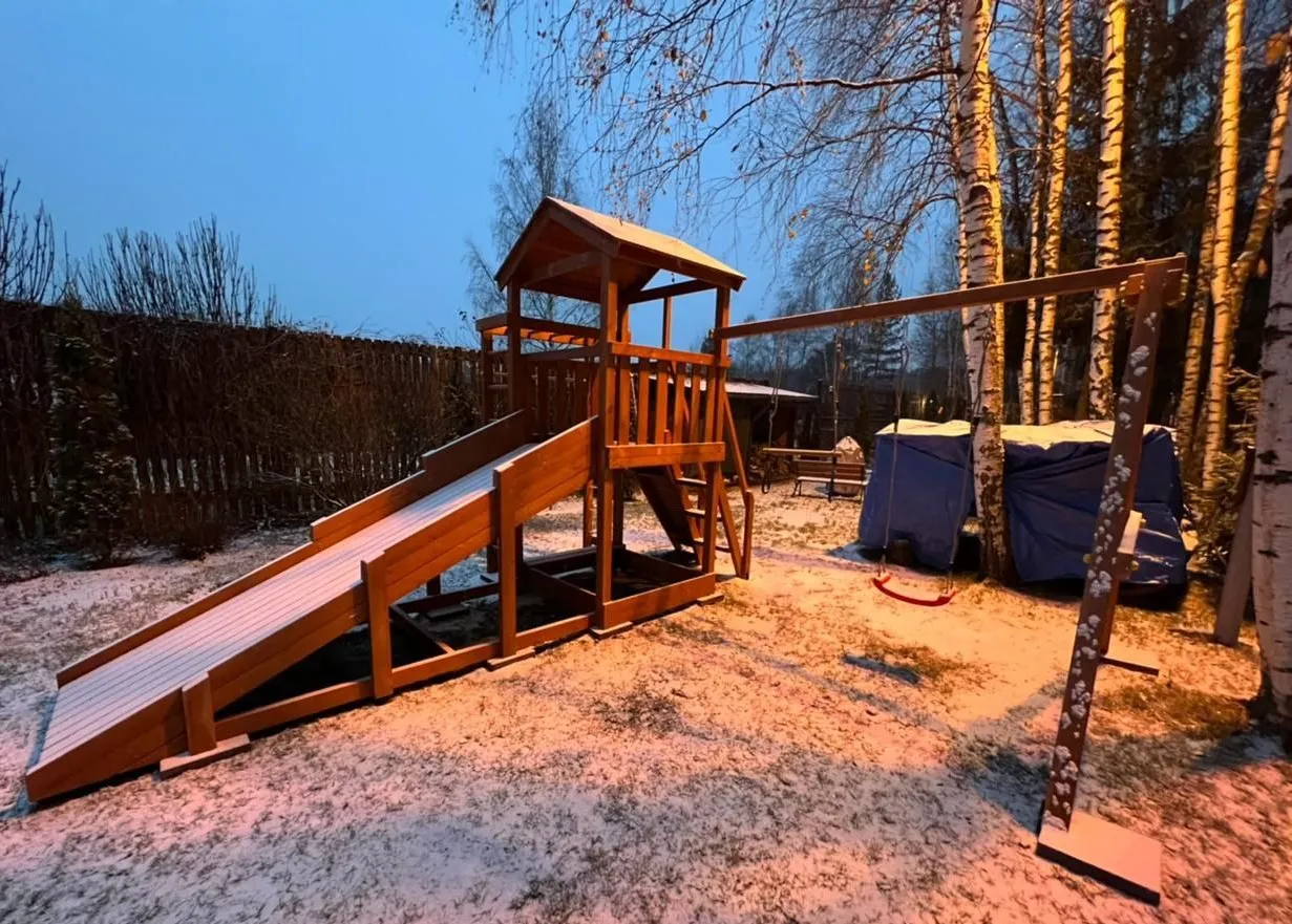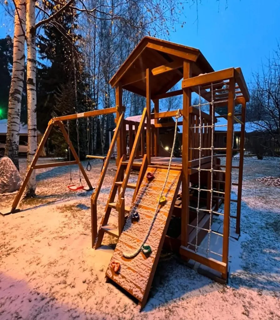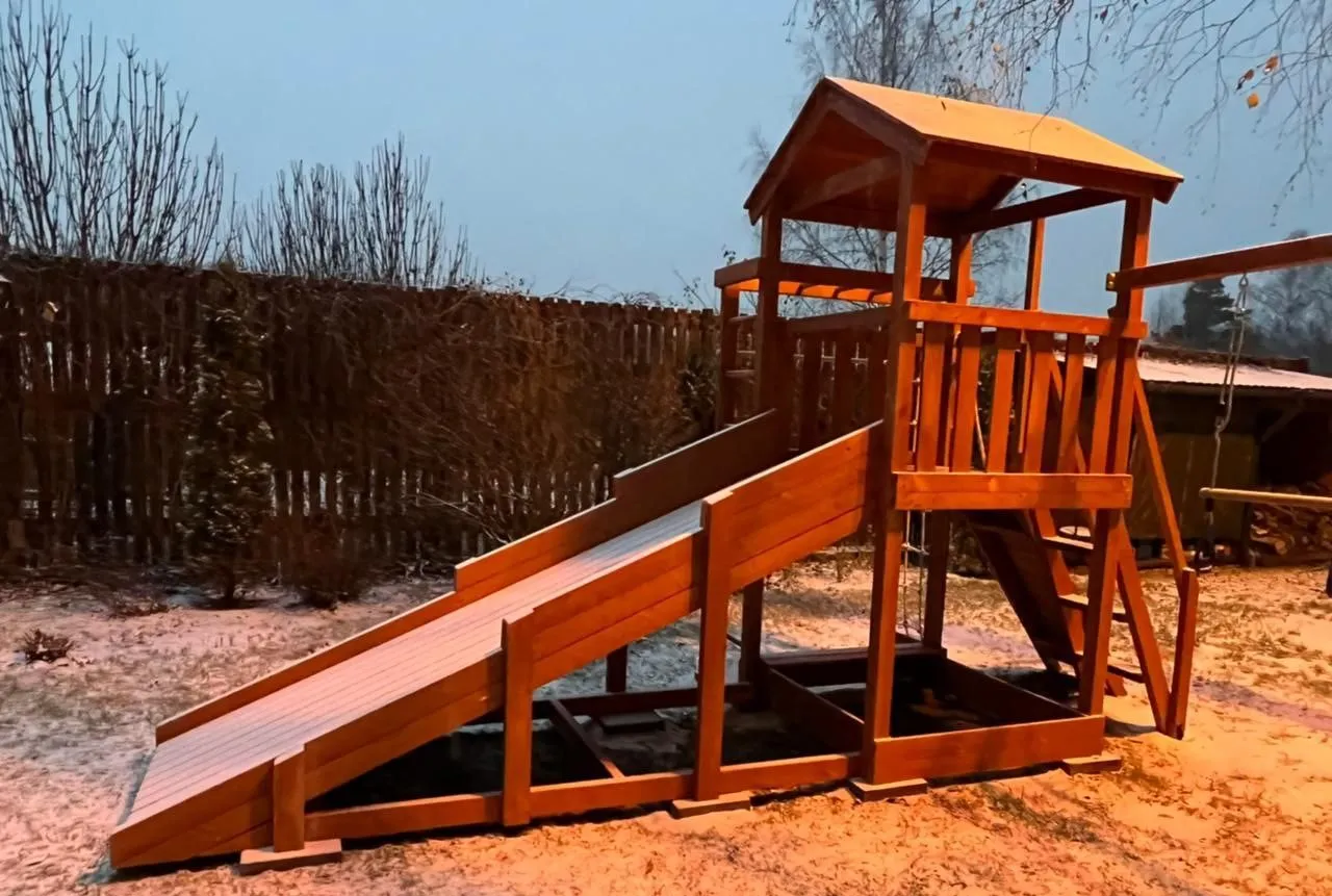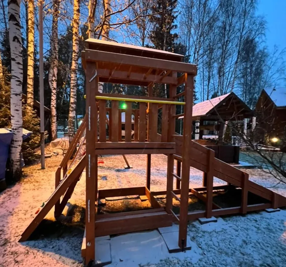 Конструкция из клеёного бруса 75×75 мм и массива сосны соответствует ГОСТ 52169-2012. Поверхности отшлифованы, углы скруглены, все болты защищены несъёмными заглушками. Натуральные материалы, устойчивость к погоде и полная безопасность — стандарт Савушка.