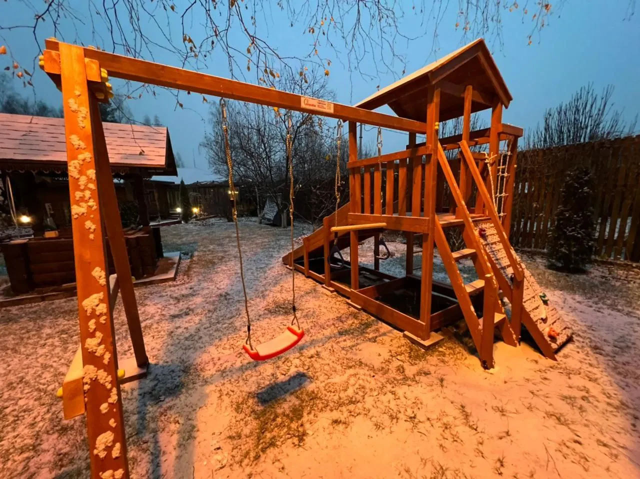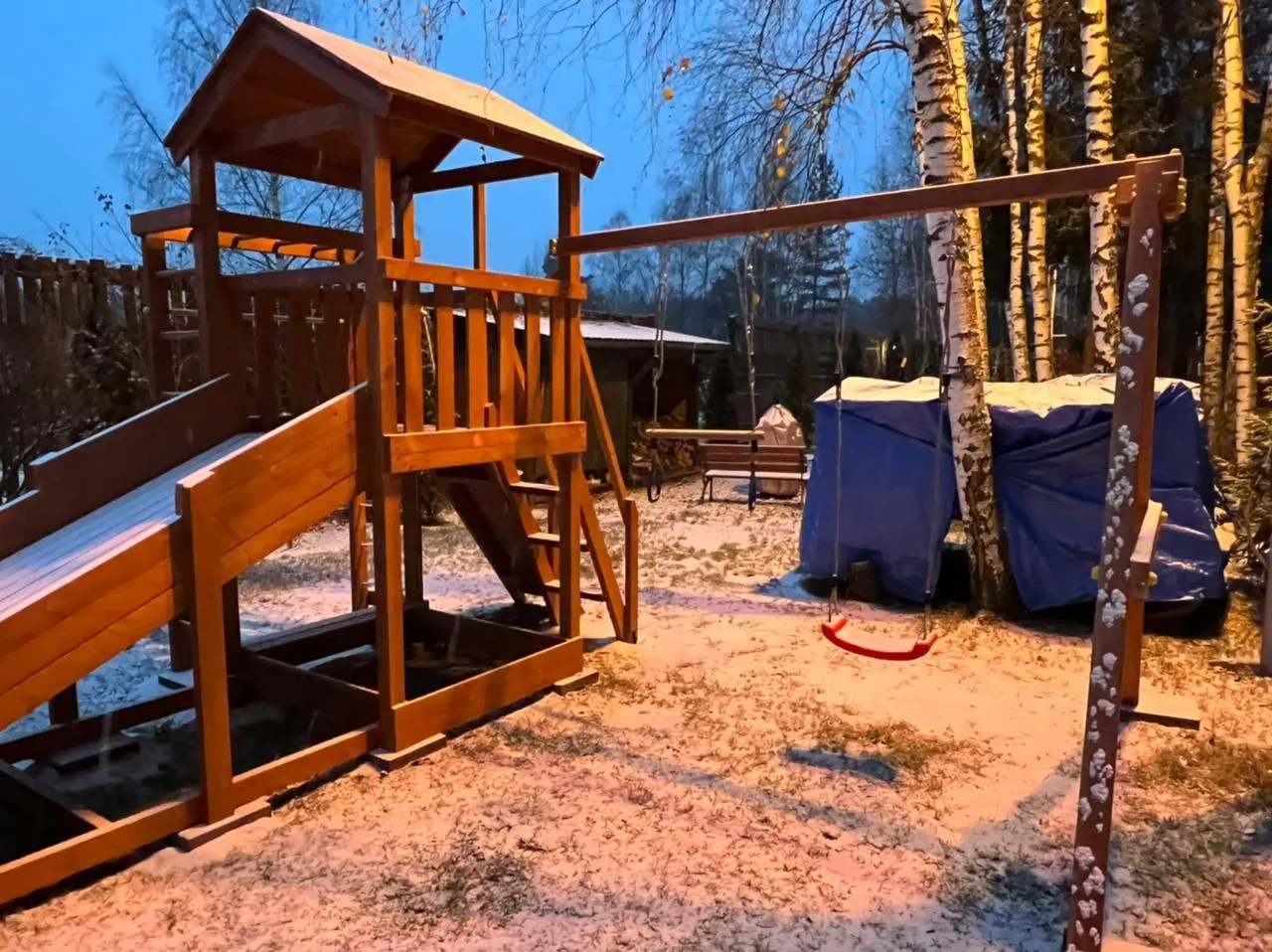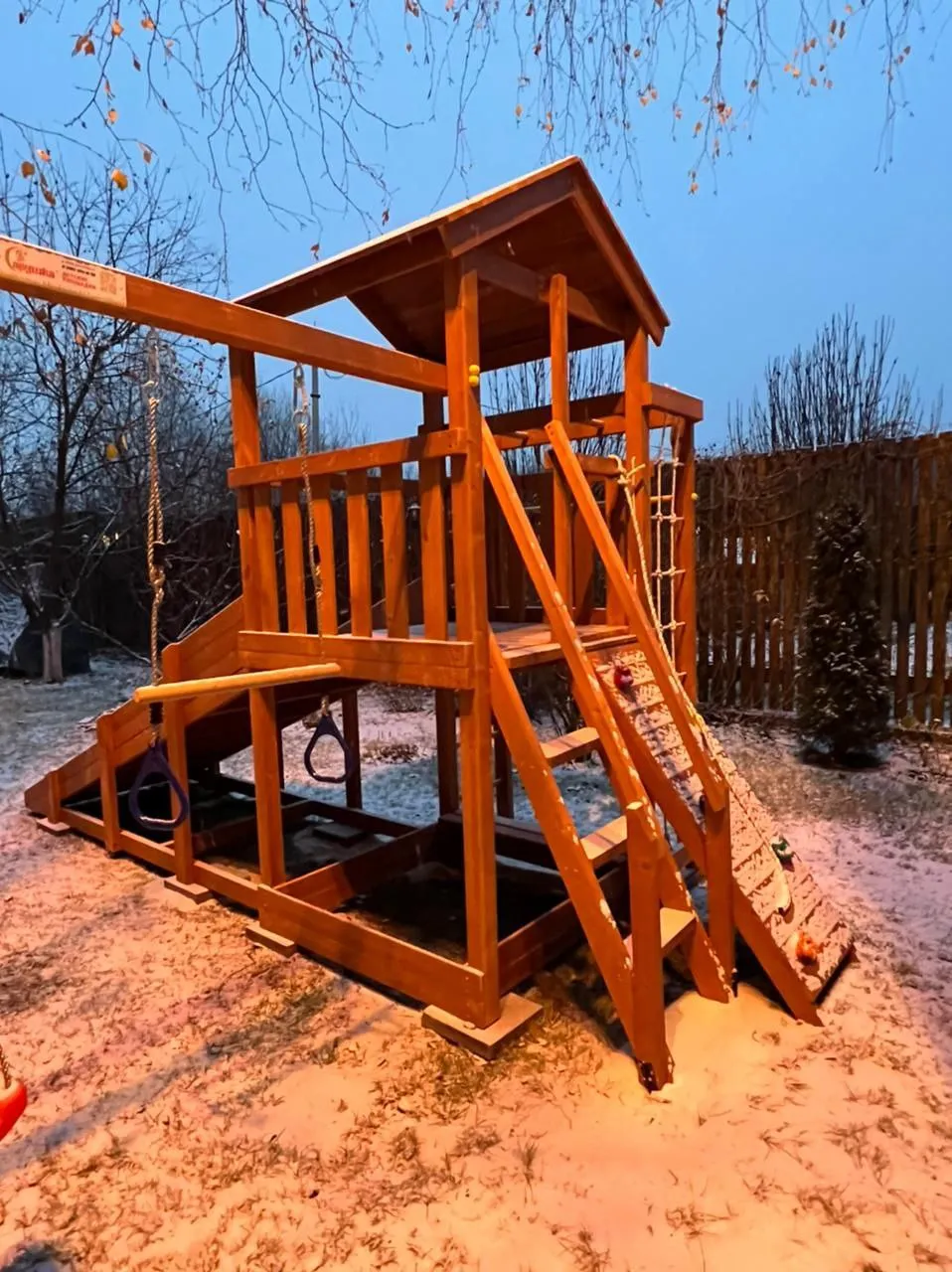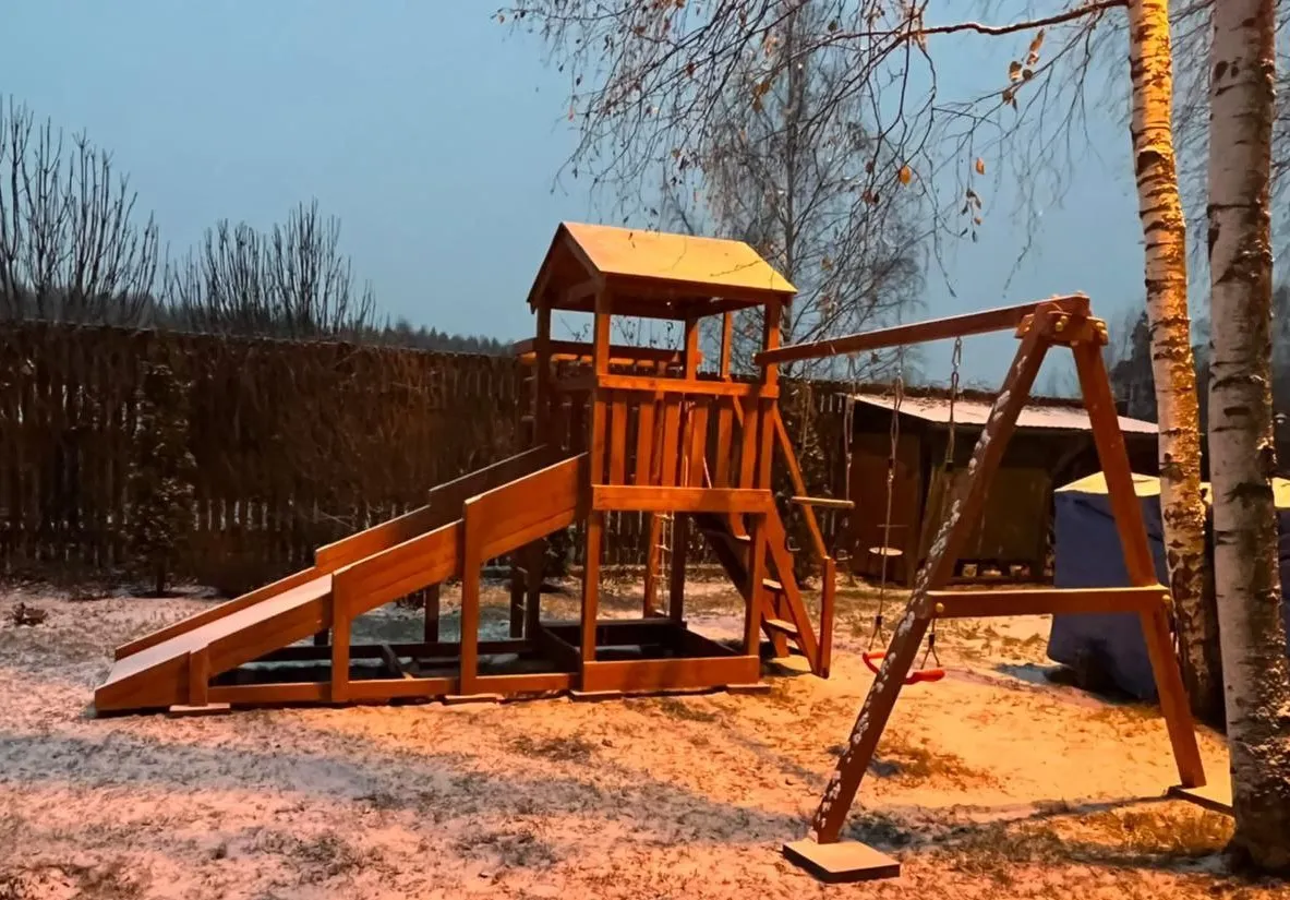 Конструкция из клеёного бруса 75×75 мм и массива сосны соответствует ГОСТ 52169-2012. Поверхности отшлифованы, углы скруглены, все болты защищены несъёмными заглушками. Натуральные материалы, устойчивость к погоде и полная безопасность — стандарт Савушка.