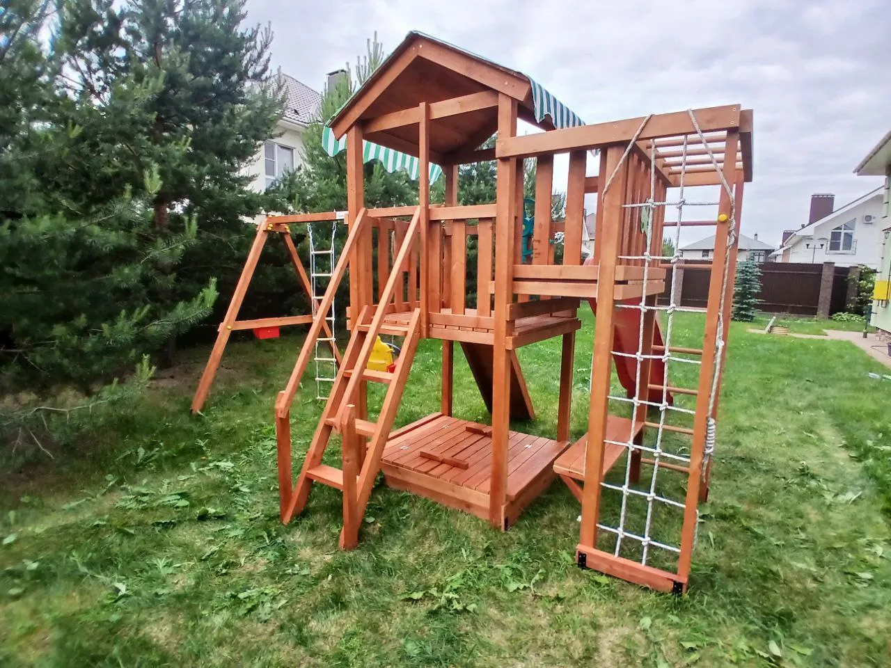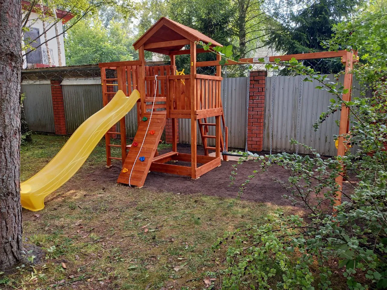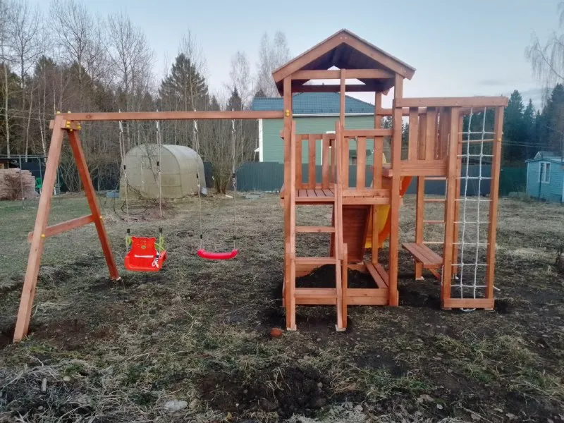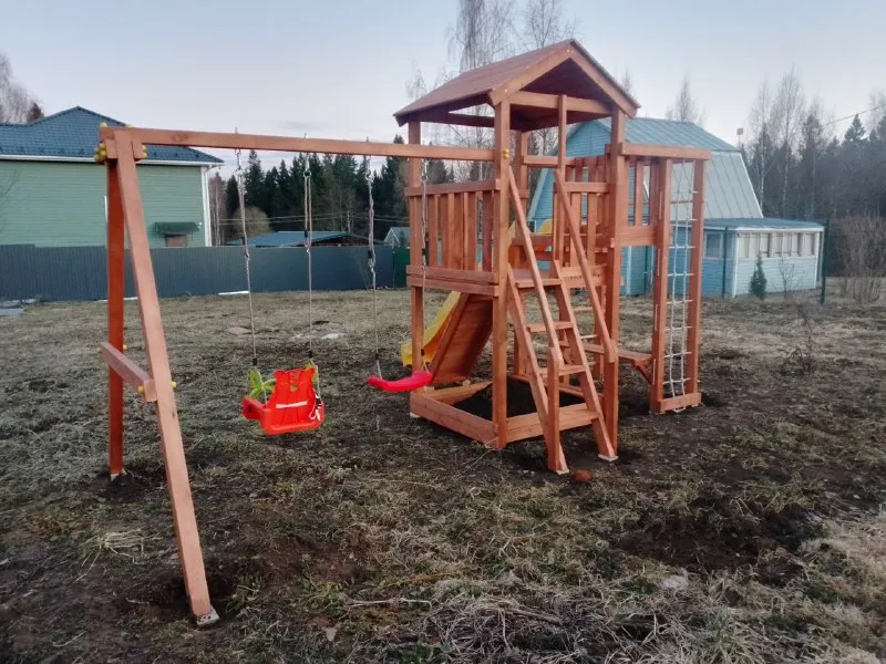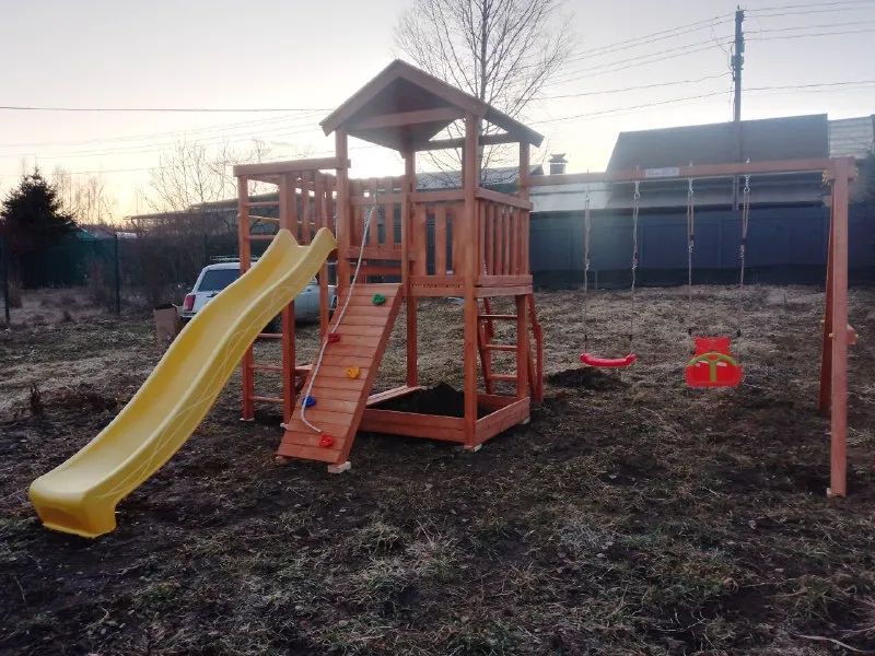 Для производства детских площадок используется клееный брус, славящийся надёжностью и экологичностью. Качество древесины соответствует ГОСТ.