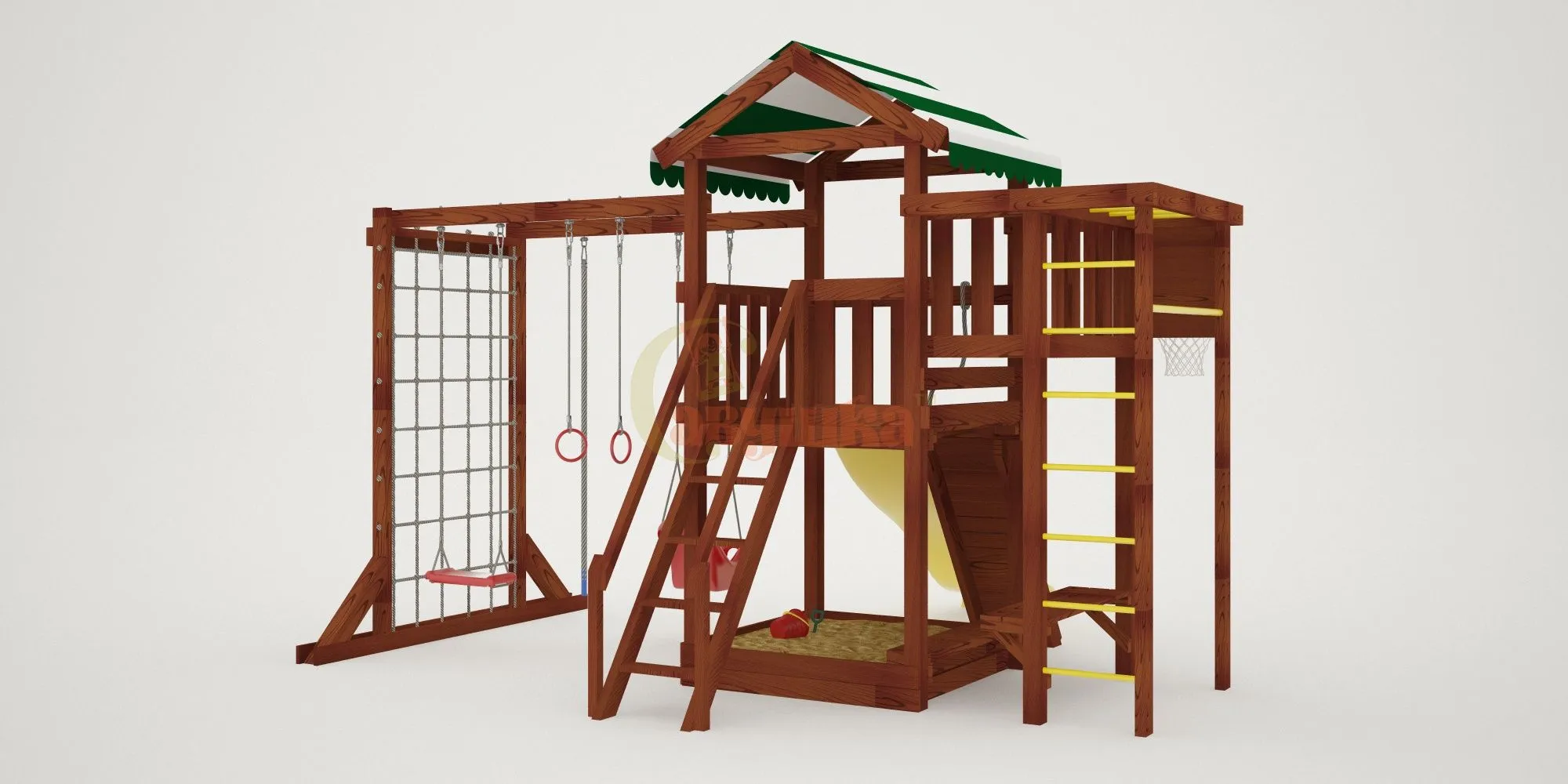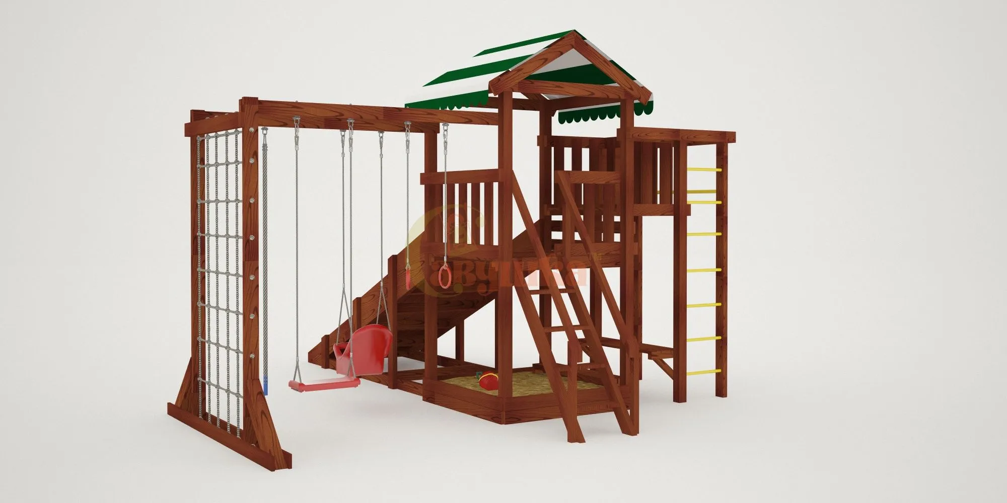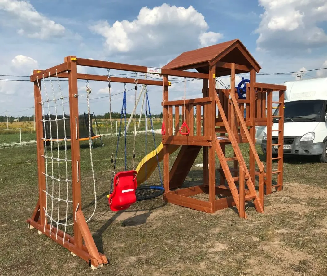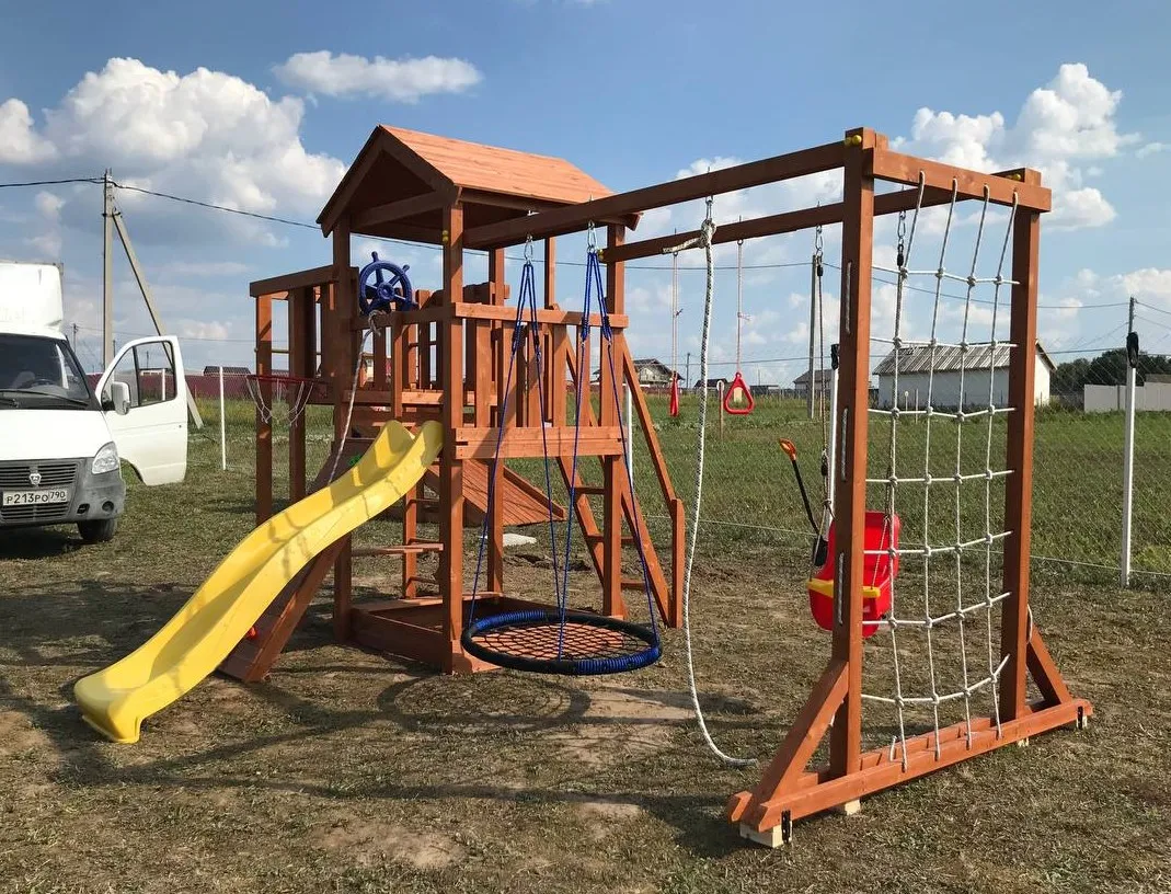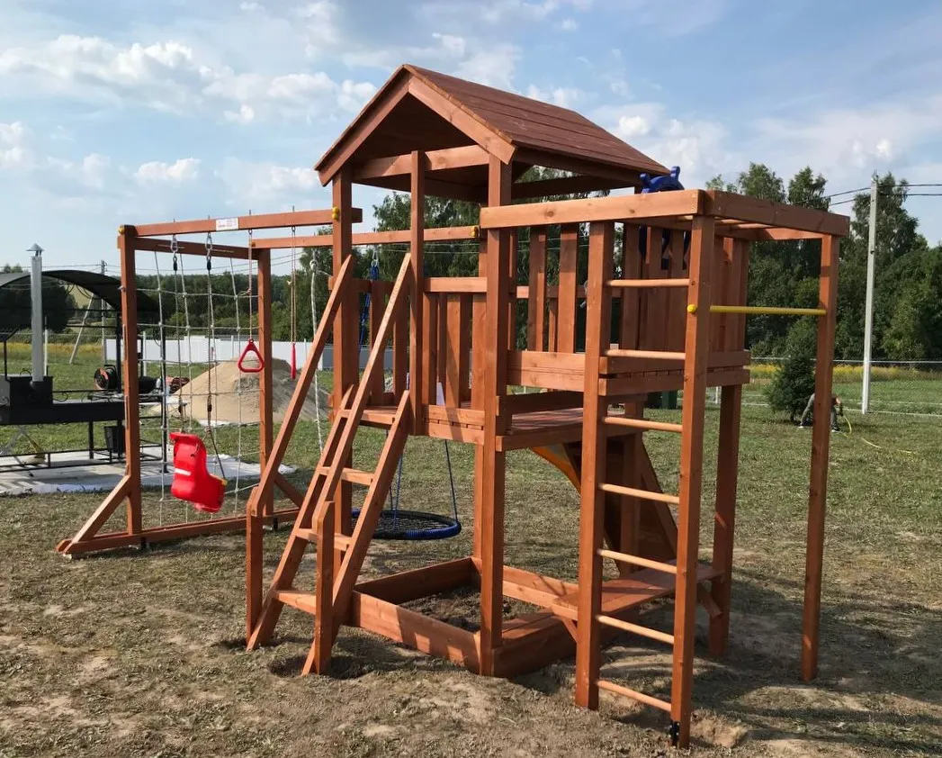 В основе — натуральный клеёный брус 75×75 мм по ГОСТ. Поверхности идеально отшлифованы, углы скруглены, все болты под заглушками. Конструкция экологична, надёжна и безопасна для детей.