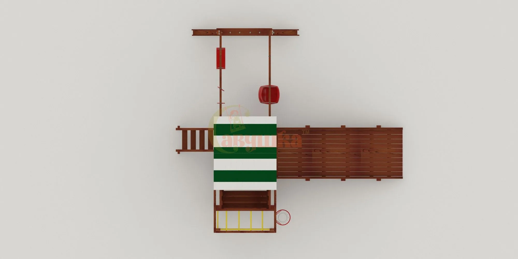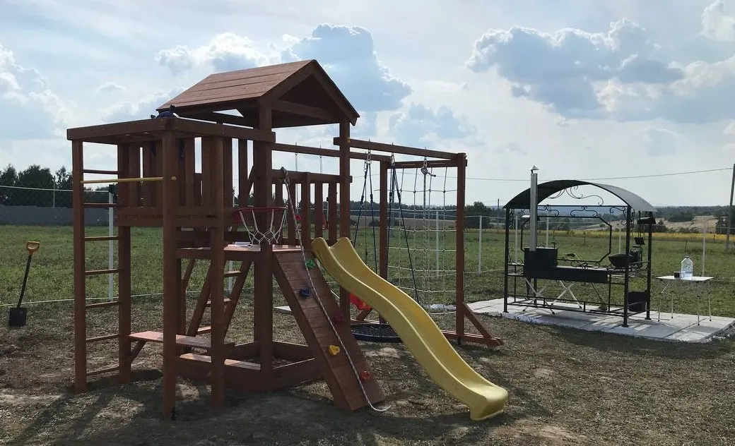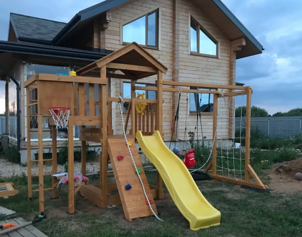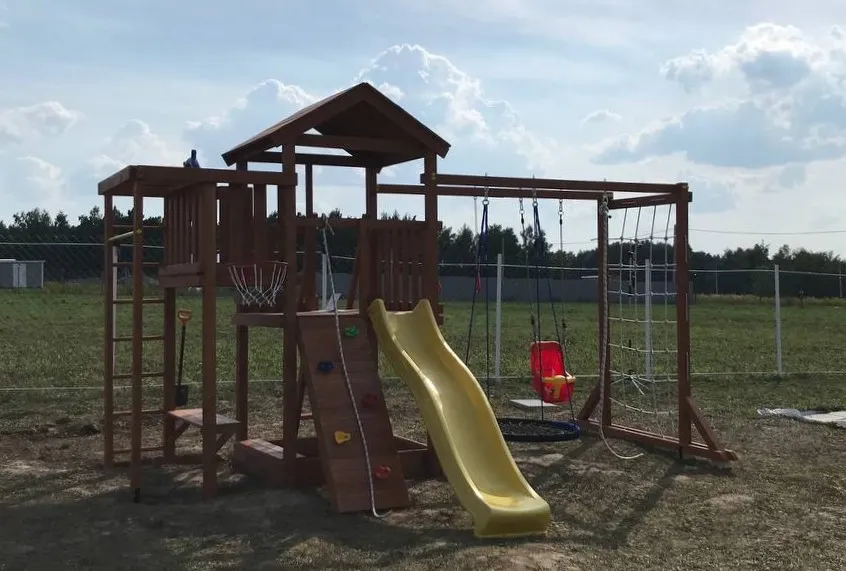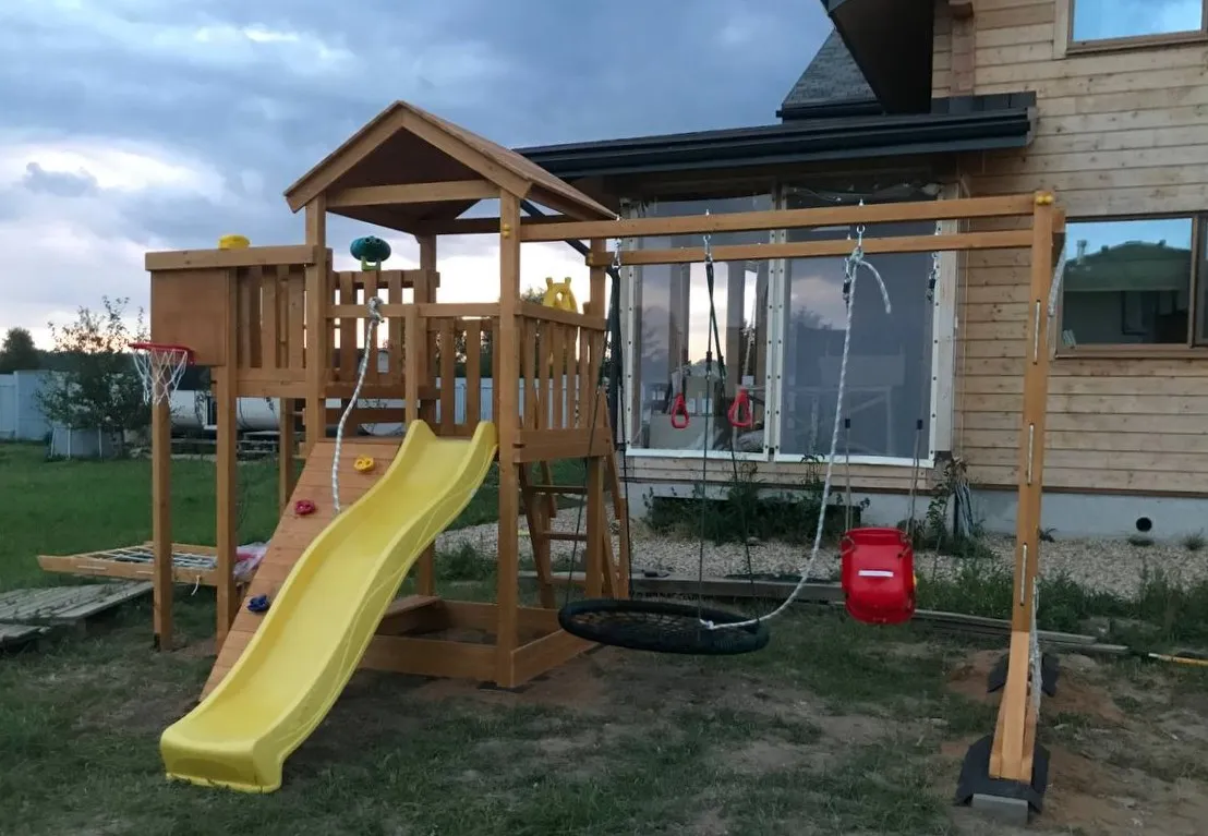 В основе — натуральный клеёный брус 75×75 мм по ГОСТ. Поверхности идеально отшлифованы, углы скруглены, все болты под заглушками. Конструкция экологична, надёжна и безопасна для детей.