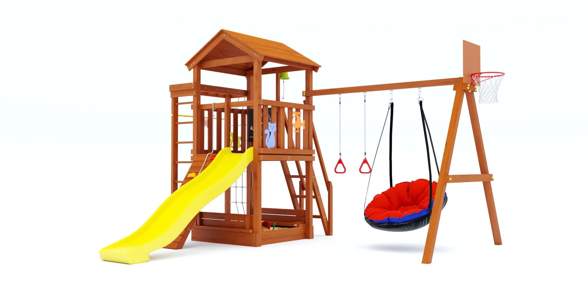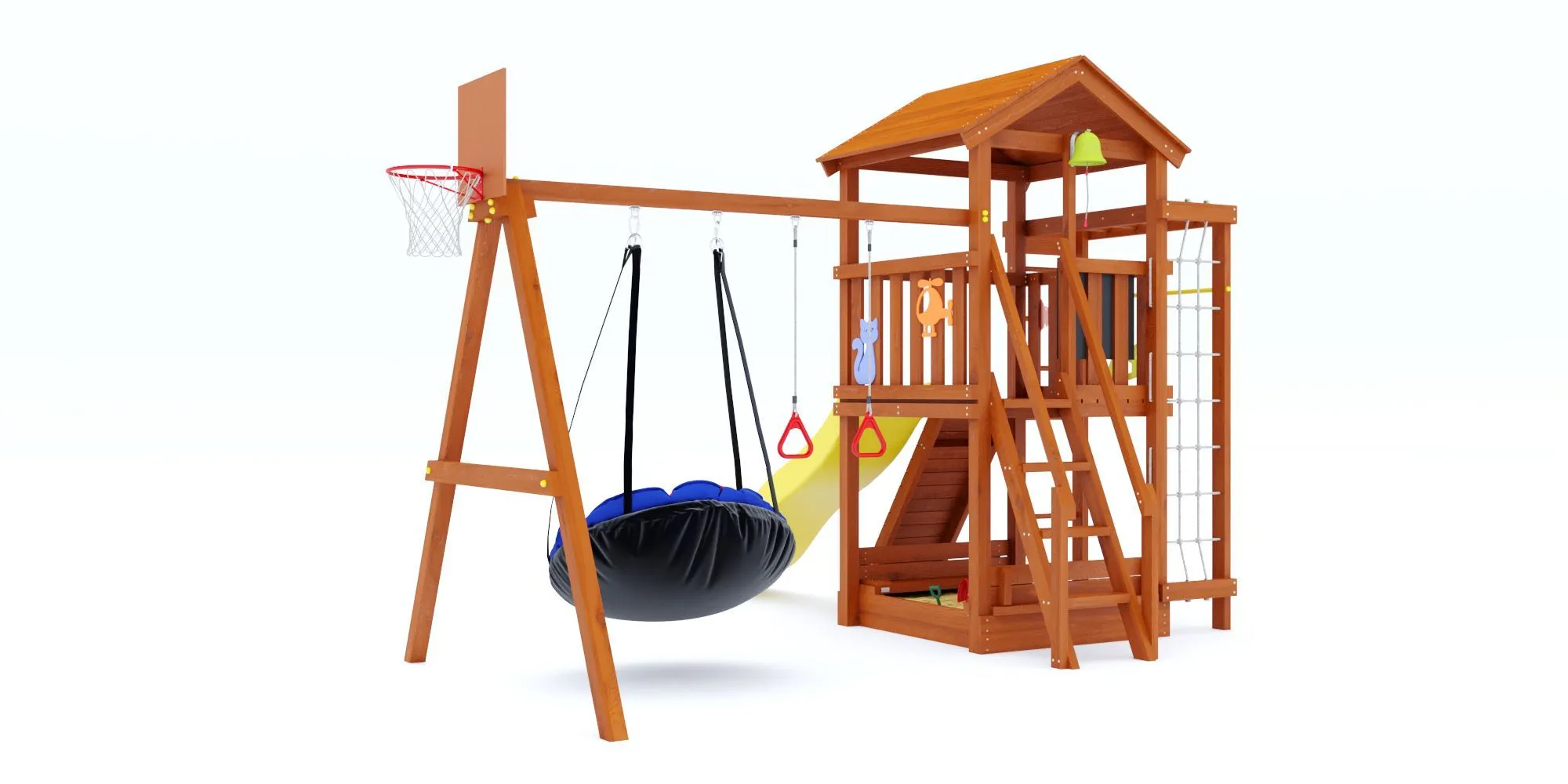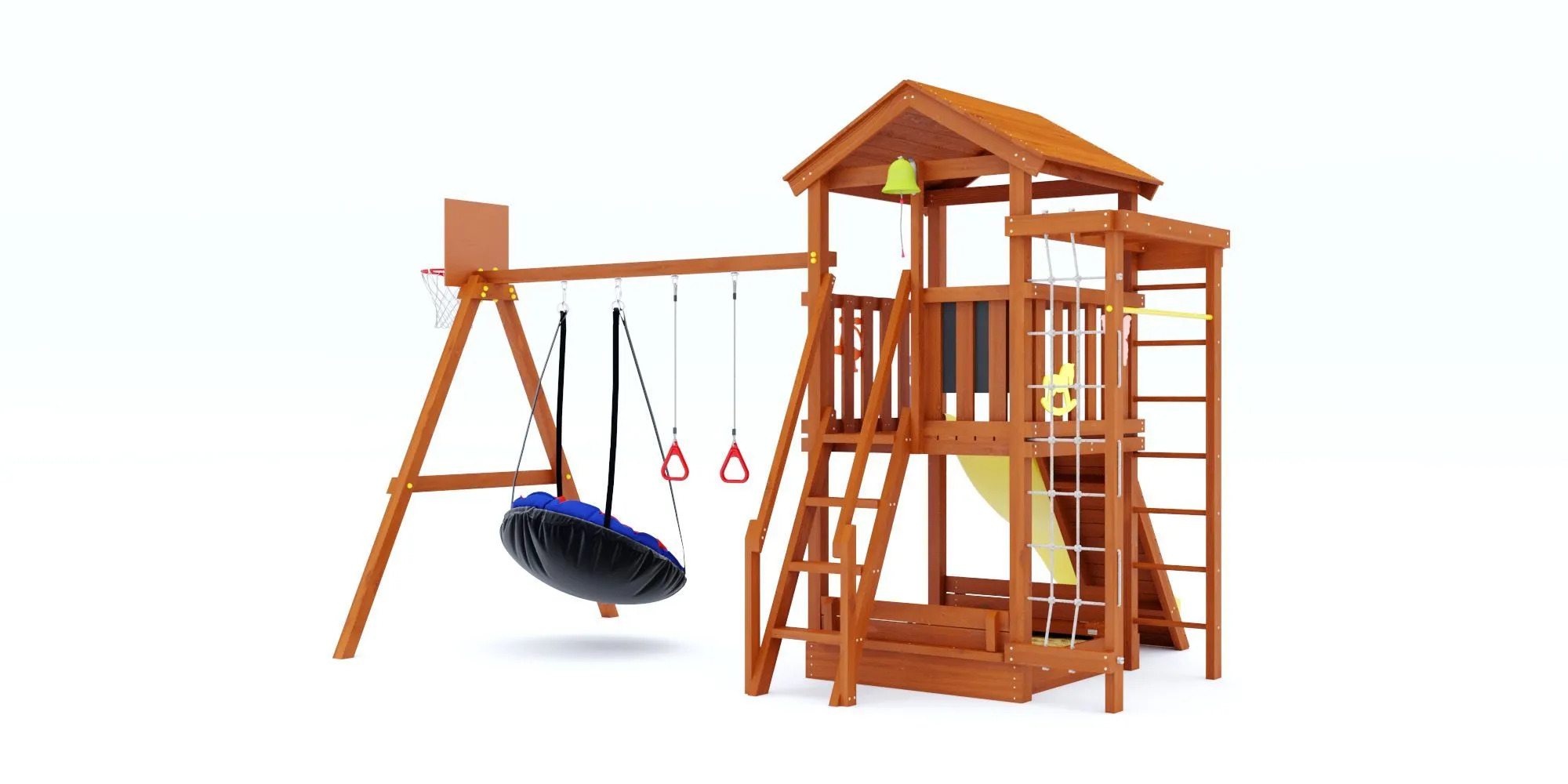Модель Мастер-5 Comfort оснащена деревянной крышей в стандартной комплектации. Детская площадка подходит для детей от 3 лет и старше: У данной модели имеется песочница с крышкой-трансформером (превращается в две лавочки), безопасные качели со спинкой, штурвал и колокол-рында. Комплекс оснащен турником, гимнастическими кольцами, баскетбольным кольцом, шведской стенкой и рукоходом.