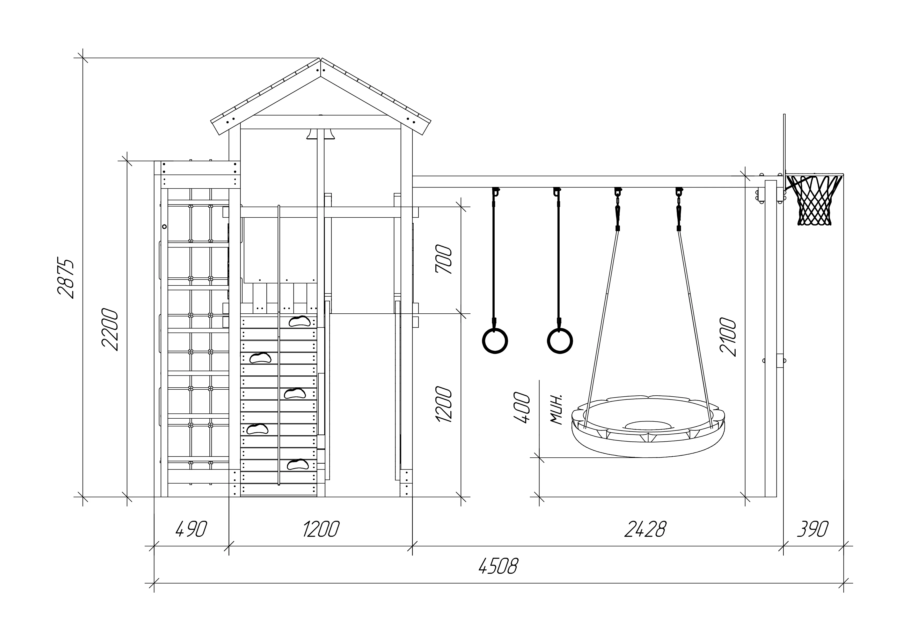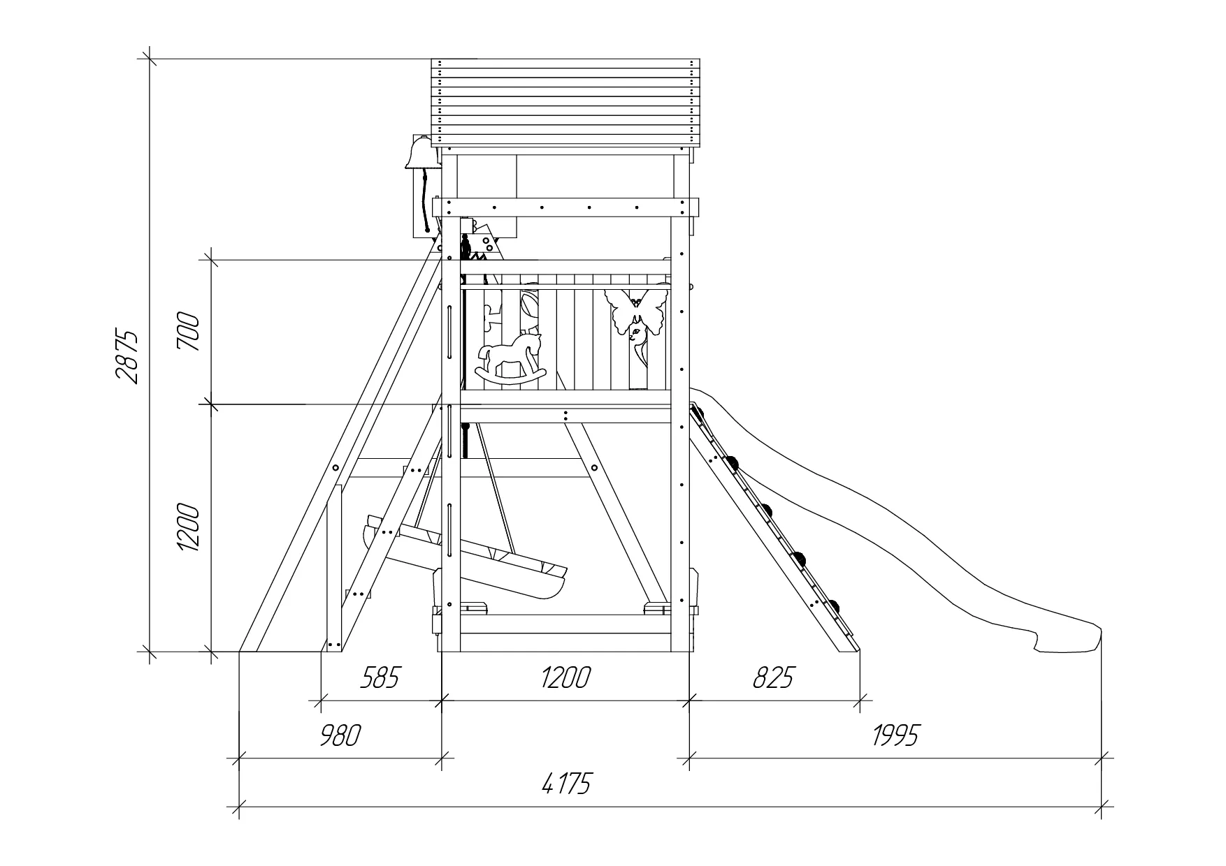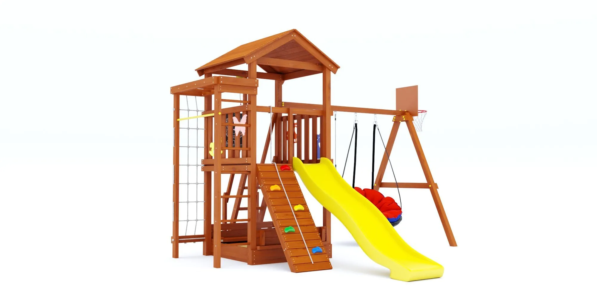 Модель Мастер-5 Comfort оснащена деревянной крышей в стандартной комплектации. Детская площадка подходит для детей от 3 лет и старше: У данной модели имеется песочница с крышкой-трансформером (превращается в две лавочки), безопасные качели со спинкой, штурвал и колокол-рында. Комплекс оснащен турником, гимнастическими кольцами, баскетбольным кольцом, шведской стенкой и рукоходом.
